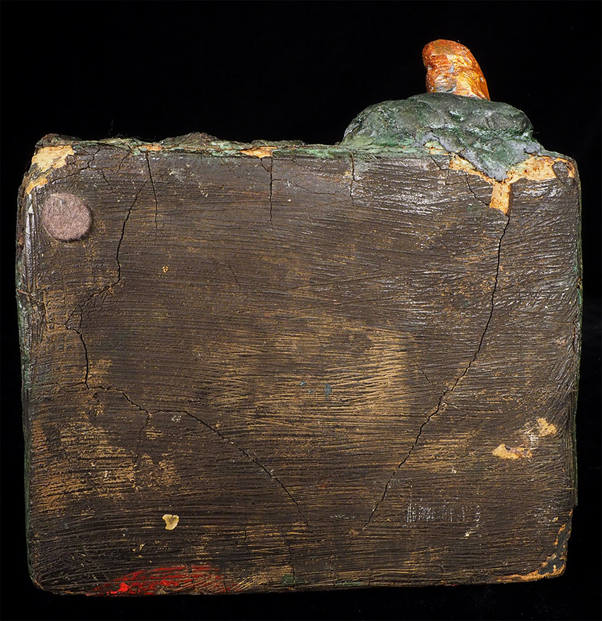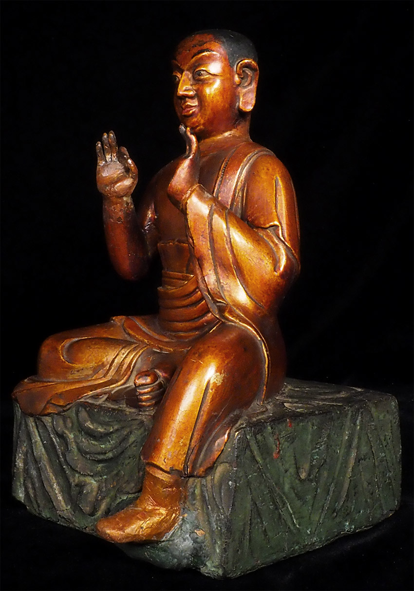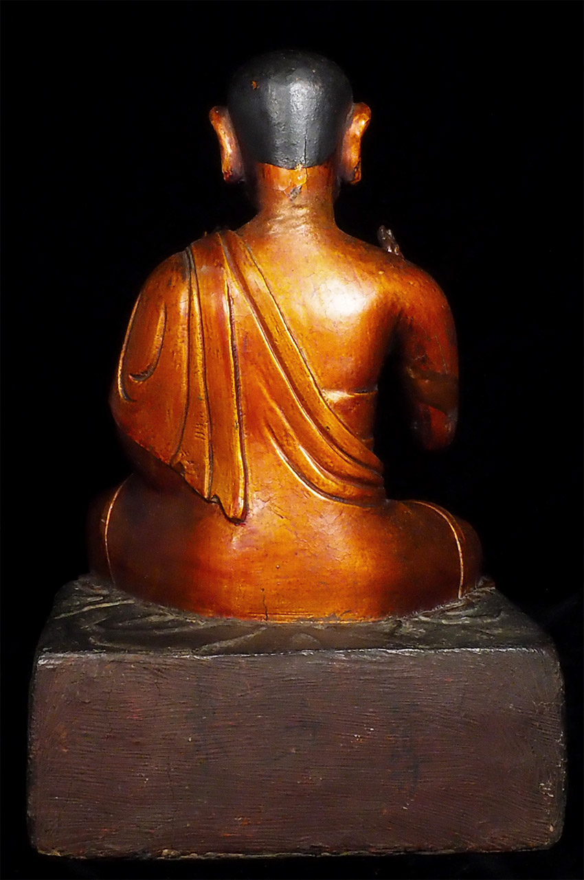 Very uncommon statue- appears to be ceramic over a solid clay core. Hands and head appear to have been made separately and been attached to body as part of original manufacturing process. One hand and foot have significant repair. Very large- especially for a solid figure, at approximately 10.5" tall, base is 6.5" x 5.25". A heavy, substantial Monk- probably 17/18th century- the face, lacquer and other elements look early Qing/Ching, or even very late Ming. Great presence. Tibet or China. While there are some relatively minor condition issues, it is rare to find a 17/18thC solid ceramic/clay core piece of this type in this very large size in any condition- especially one of such good quality, with such a great face, and with such a great overall composition.