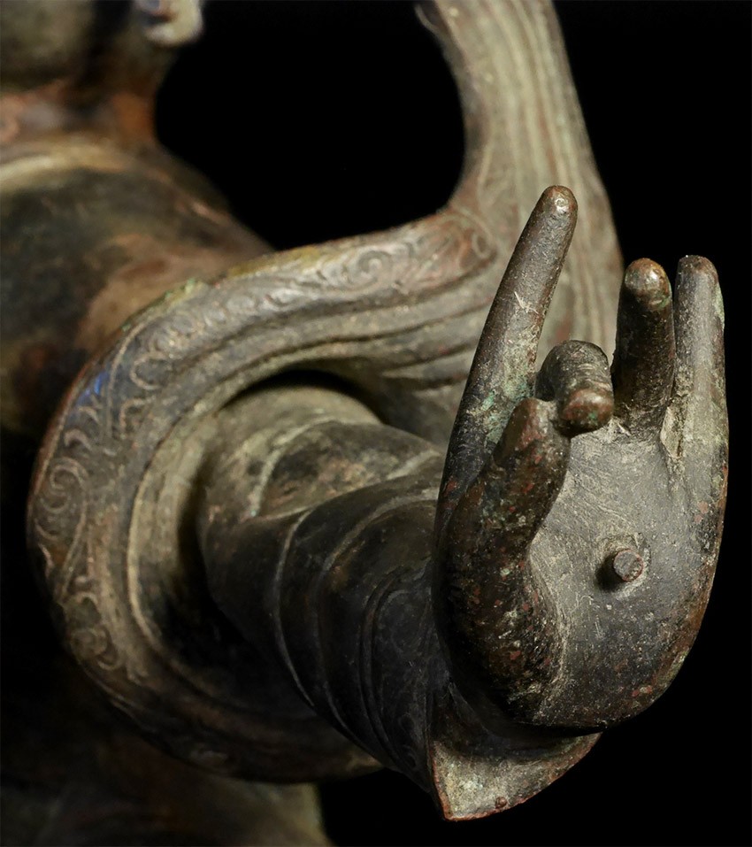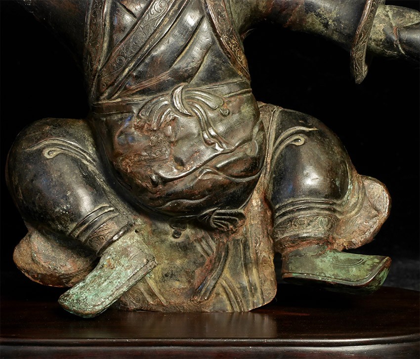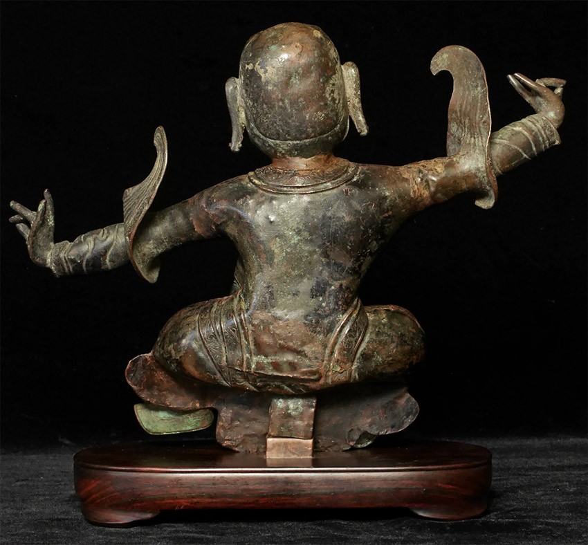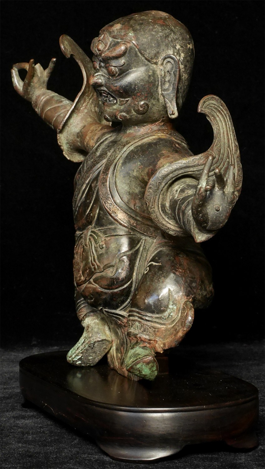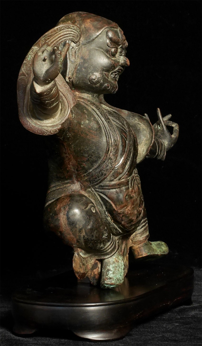 BIG and powerful wrathful Tibetan copper 18/19thC deity in lively attitude. Stands 8.5 inches tall, height onhigh quality custom hardwood base is approximately 9.75 inches. The distance finger to finger is 11.5 inches. In good condition. I've seen several closely related examples over the years and all had at least one damaged arm, as this piece is particularly vulnerable due to the way the limbs extend so far out. The others were also smaller and had less detail and expressiveness- especially to the wonderful face-again, this one is nearly a foot wide from finger to finger, which puts it in a different size category than 95% of authentic antique Tibetan sculpture.