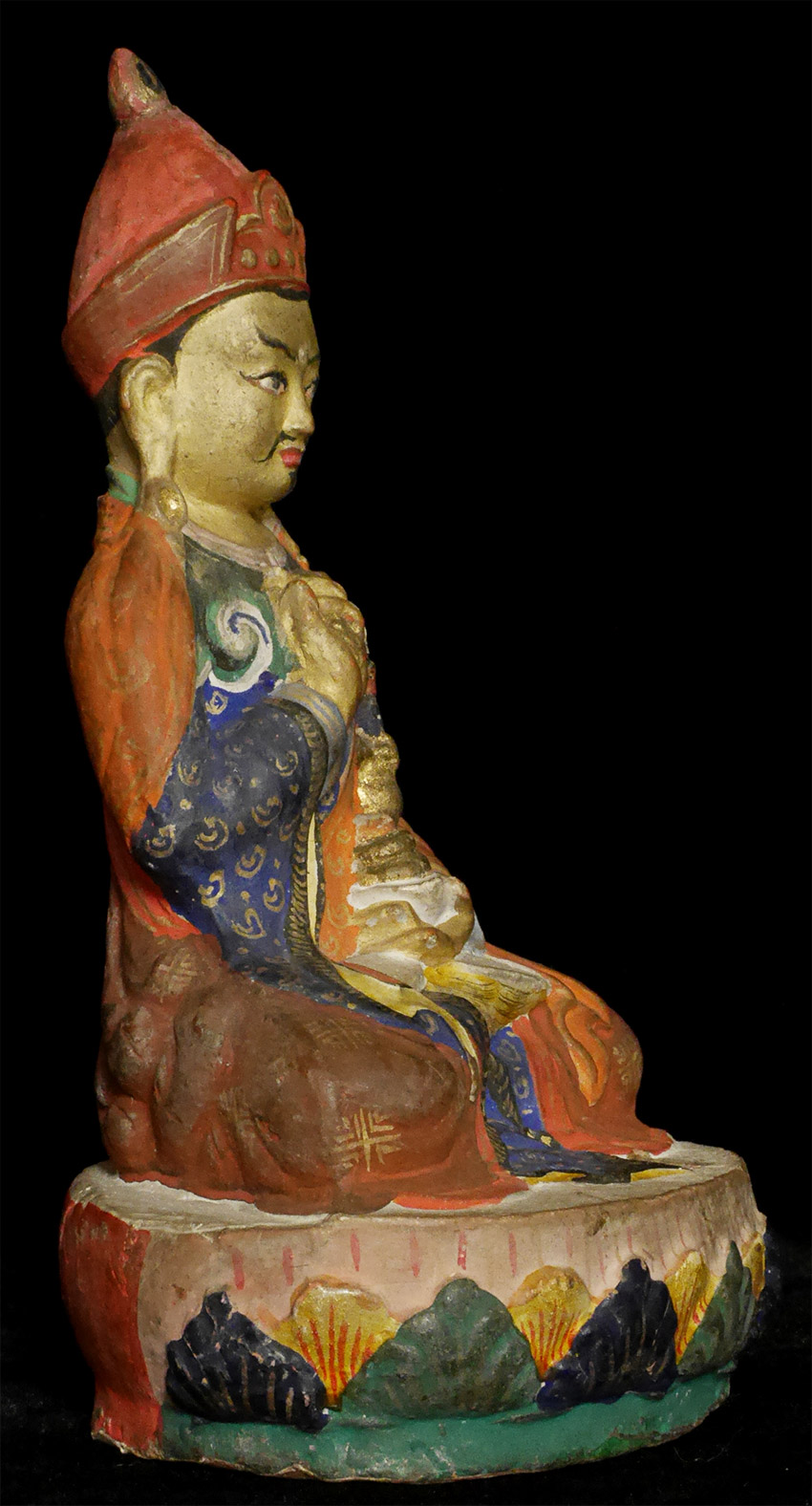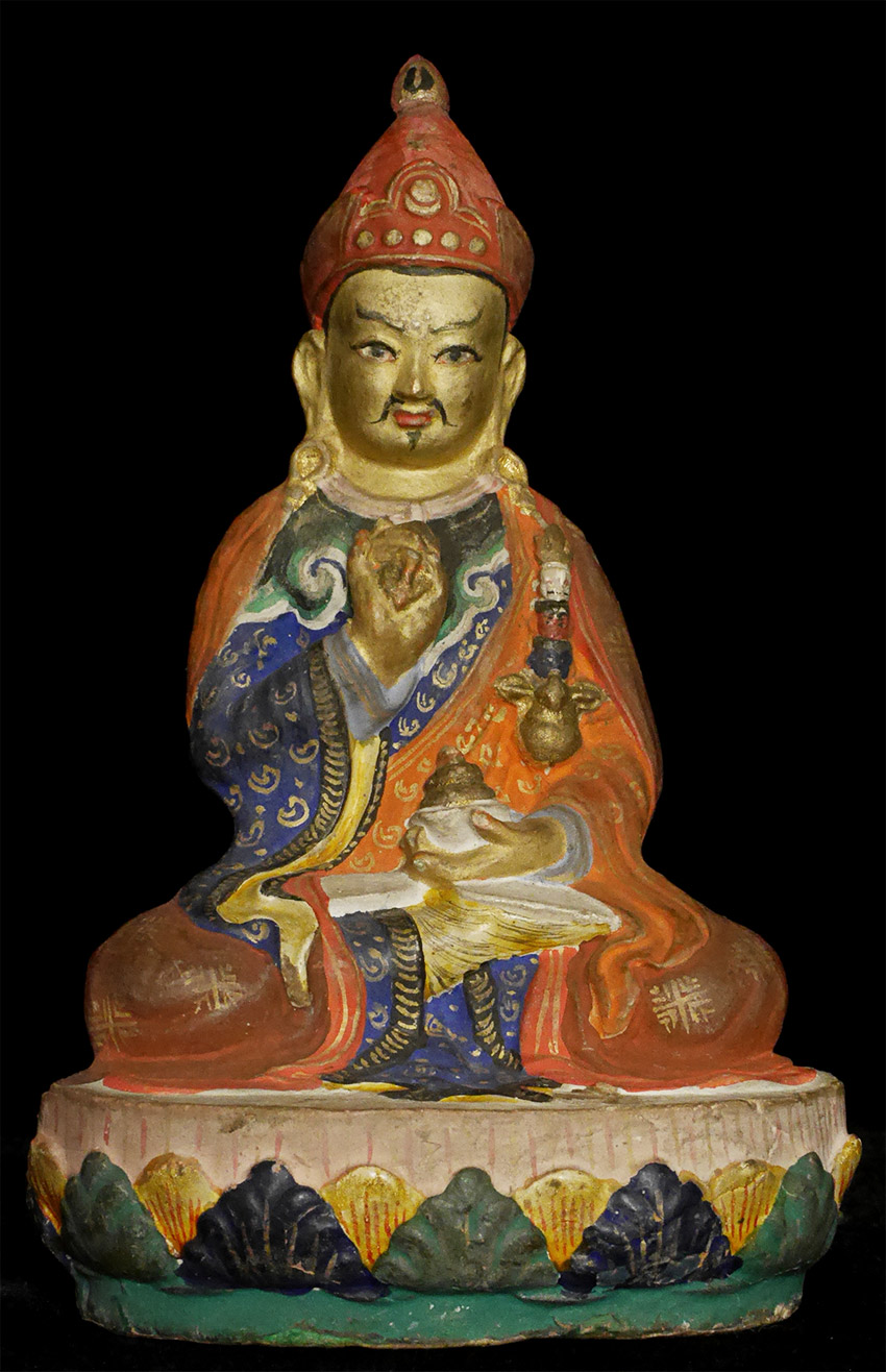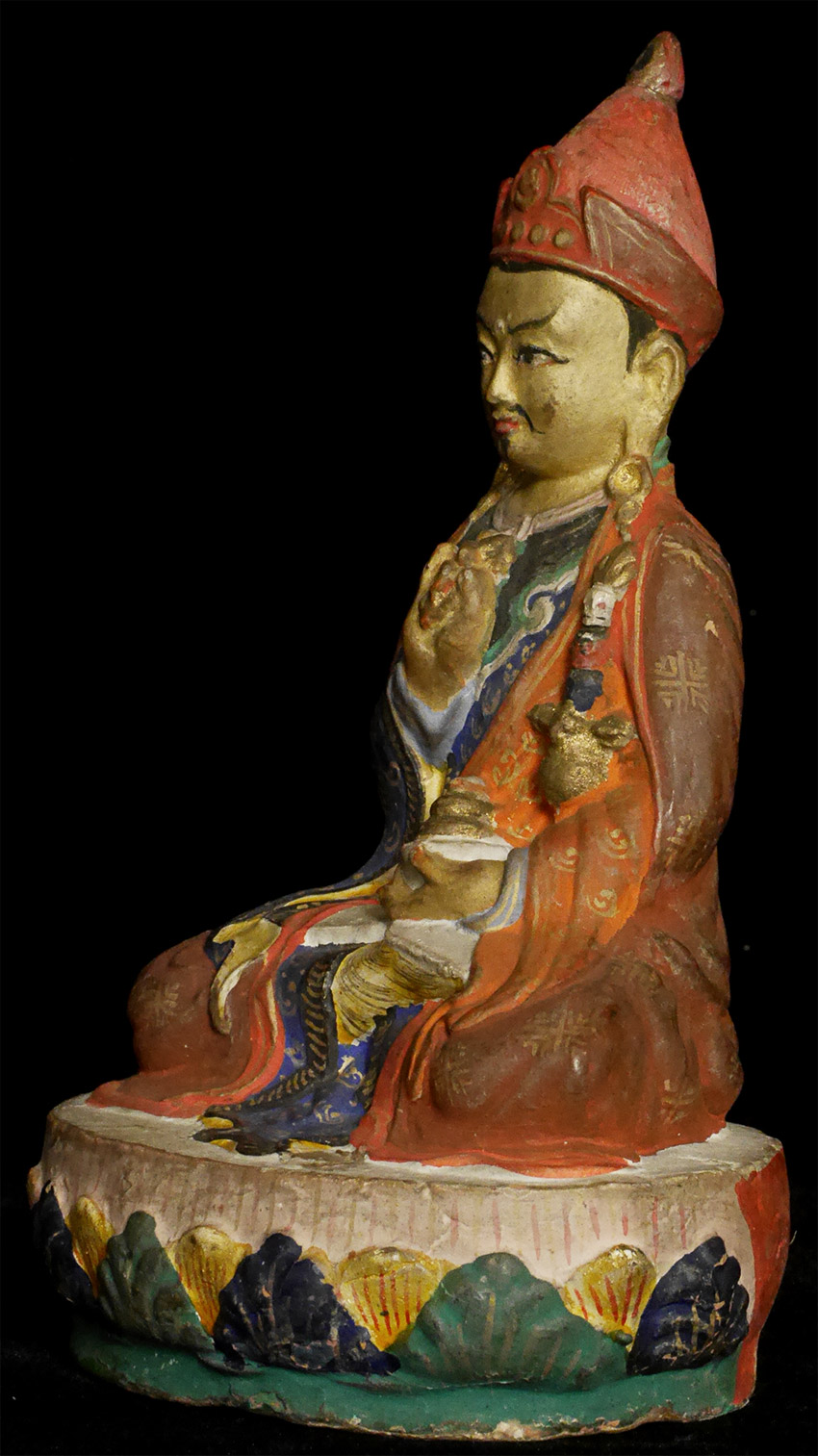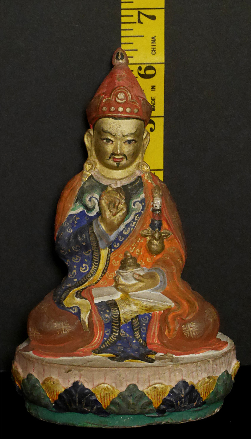 An antique Mongolian paper-mache Bodhisattva. Beautifully painted in vivid colors. In the 1990s when Mongolia was first opening to the west, it was possible to find statues like this. Now, if I find them at all, they are extremely worn or have damage or repairs, or not of the first quality. This piece was collected over 20 years ago by an Australian collector who focused his collection on Mongolian sculpture. It is the best of it's type that I have in a very long time. Sits 6.25 inches tall