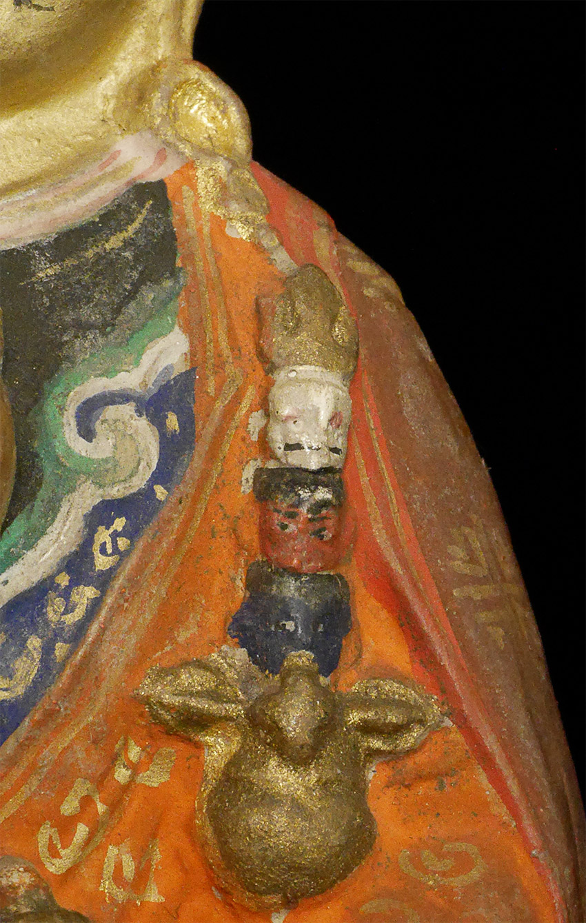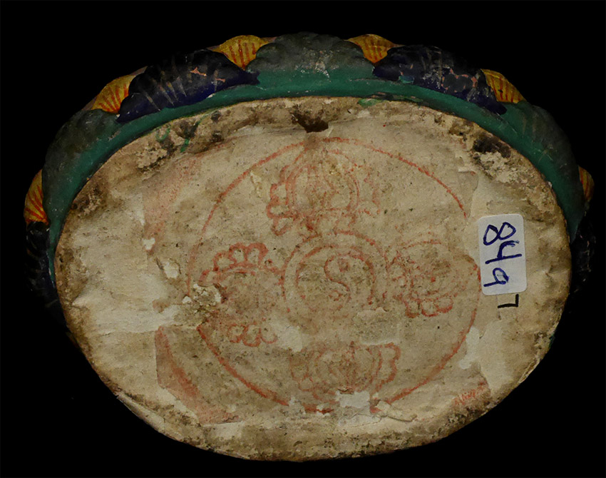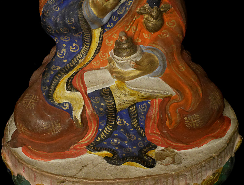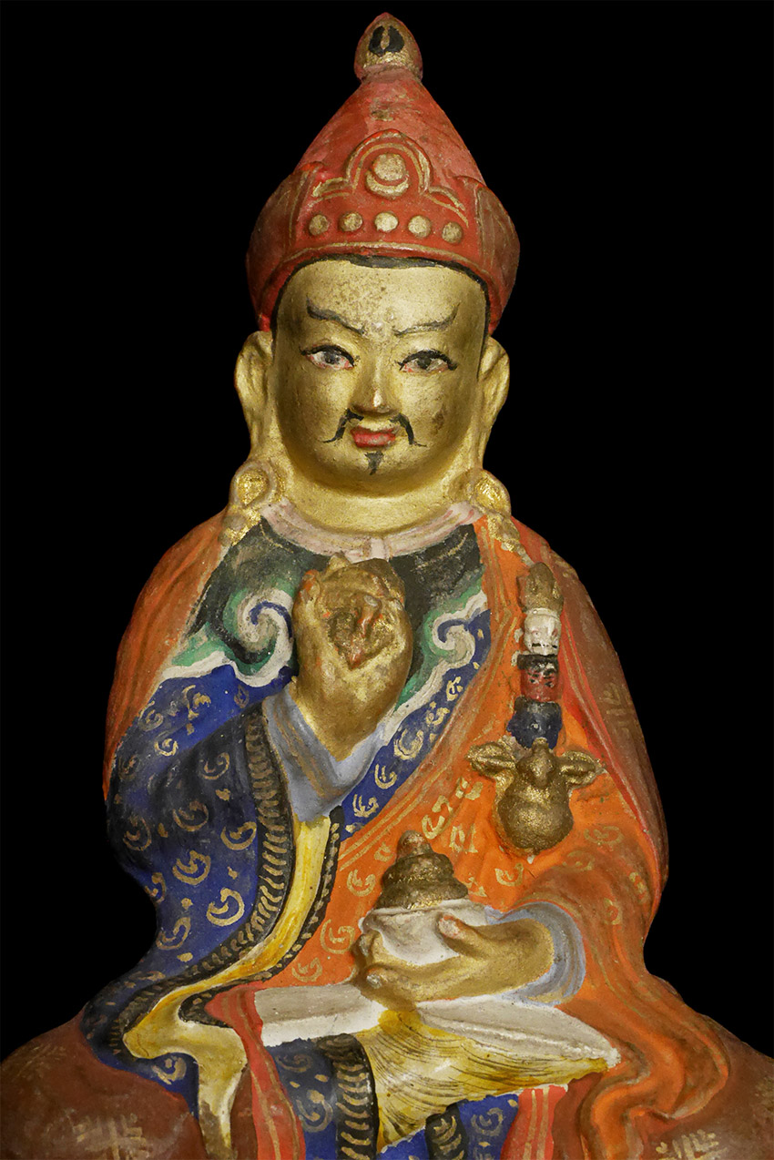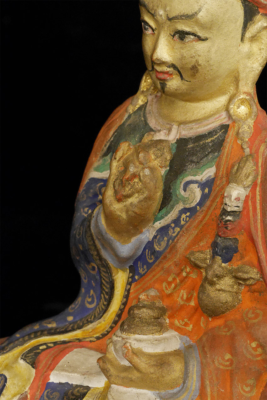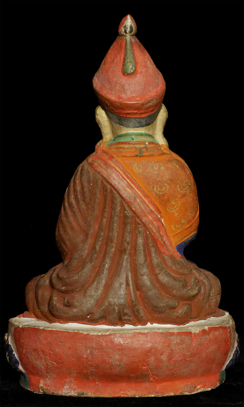 An antique Mongolian paper-mache Bodhisattva. Beautifully painted in vivid colors. In the 1990s when Mongolia was first opening to the west, it was possible to find statues like this. Now, if I find them at all, they are extremely worn or have damage or repairs, or not of the first quality. This piece was collected over 20 years ago by an Australian collector who focused his collection on Mongolian sculpture. It is the best of it's type that I have in a very long time. Sits 6.25 inches tall