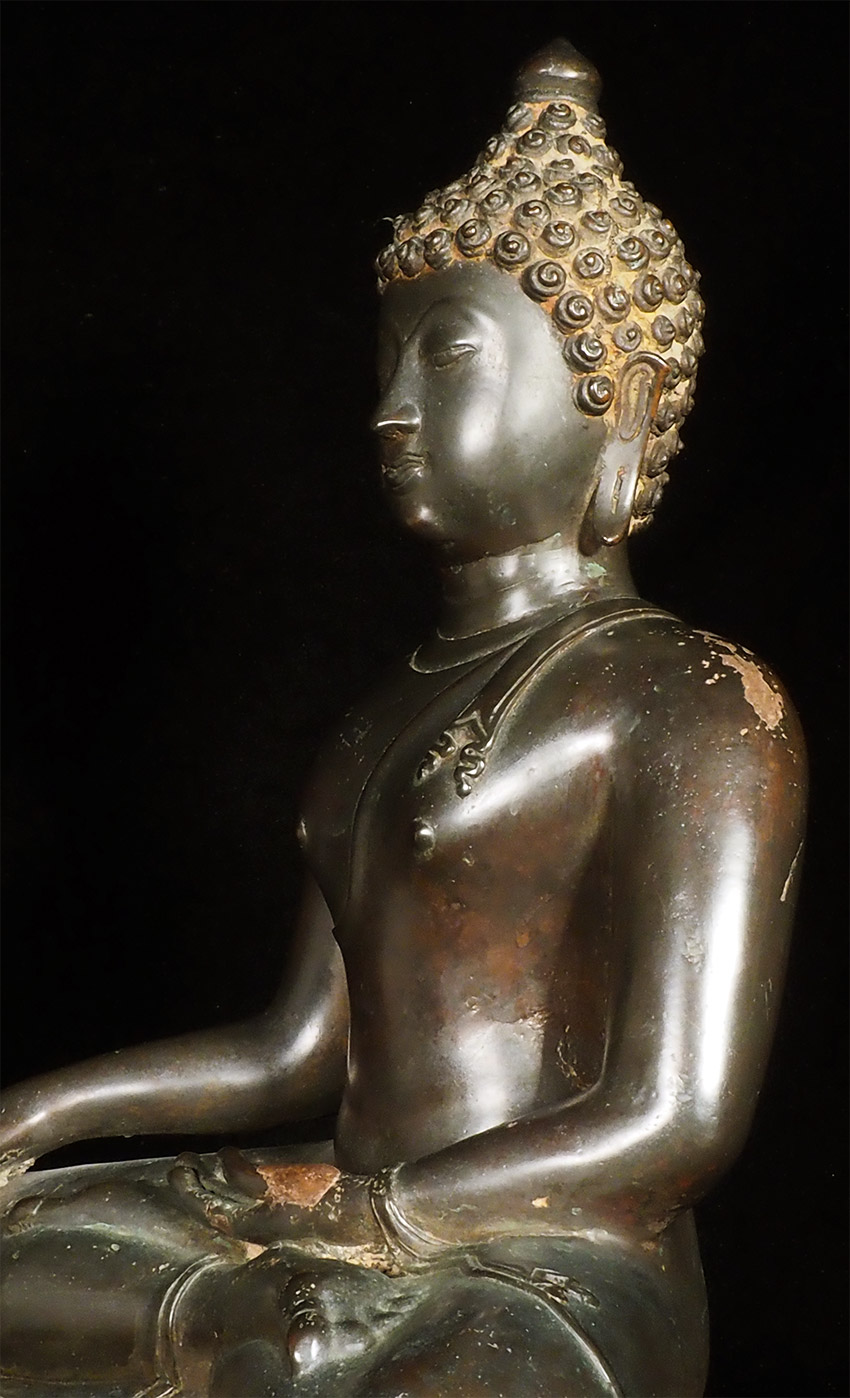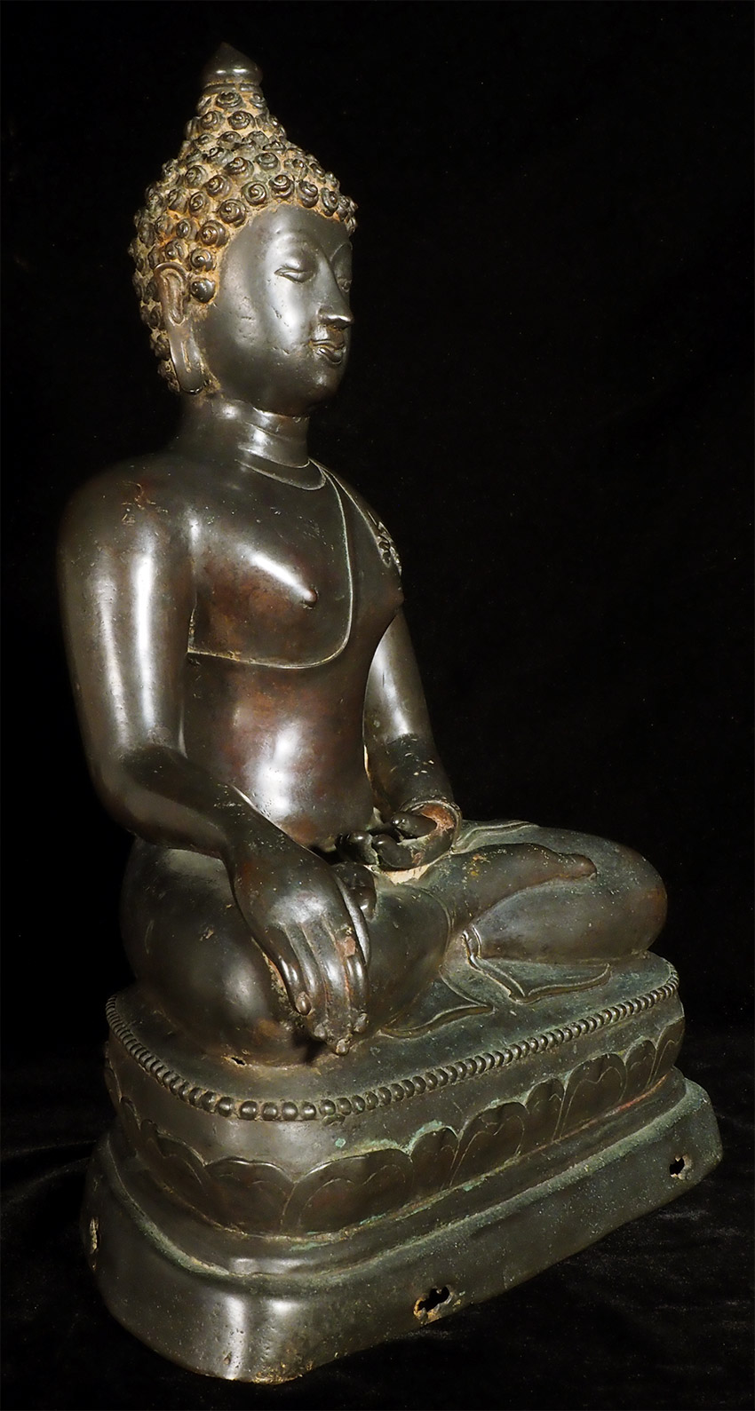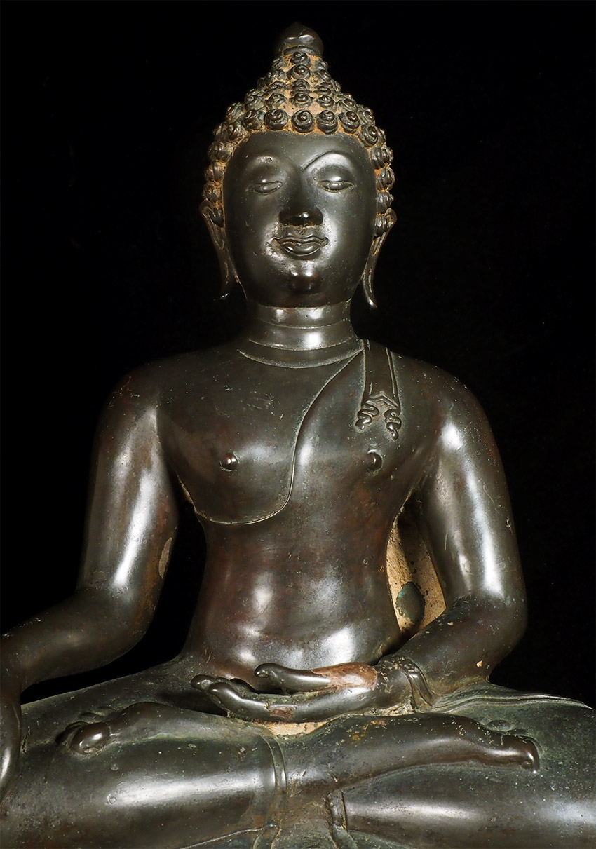 Large Northern Thai Bronze Buddha. Collected by the previous owner in the 1970's while stationed in Thailand during the Vietnam War. Was filled with clay core when he purchased it, and as it was very heavy, he decided to remove it before bring it back to the USA in 1972. I believe this is an 18/19thC emulation of a 15thC style, Earlier example would have been more thickly cast. It appears to have remains of reddish-brown lacquer. Well cast, with typical wear, Impressive at 15.5 inches tall and 11 wide at the base.
