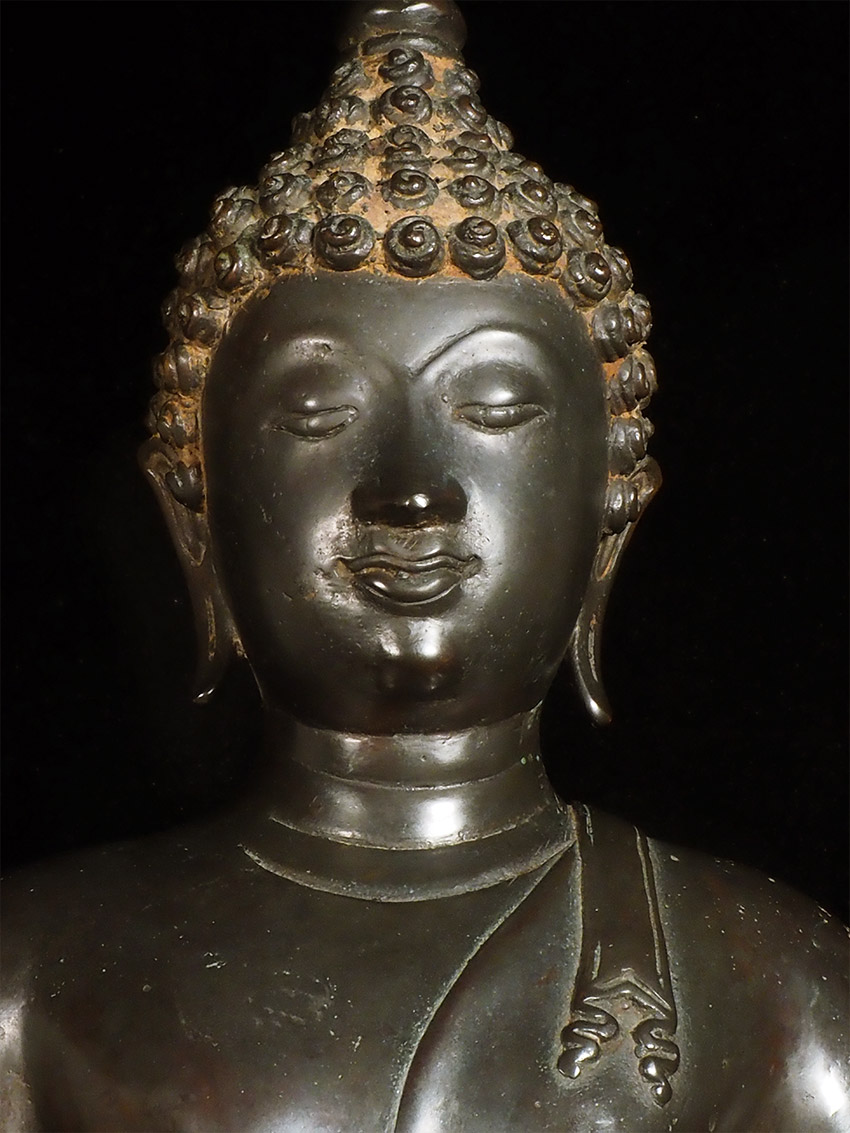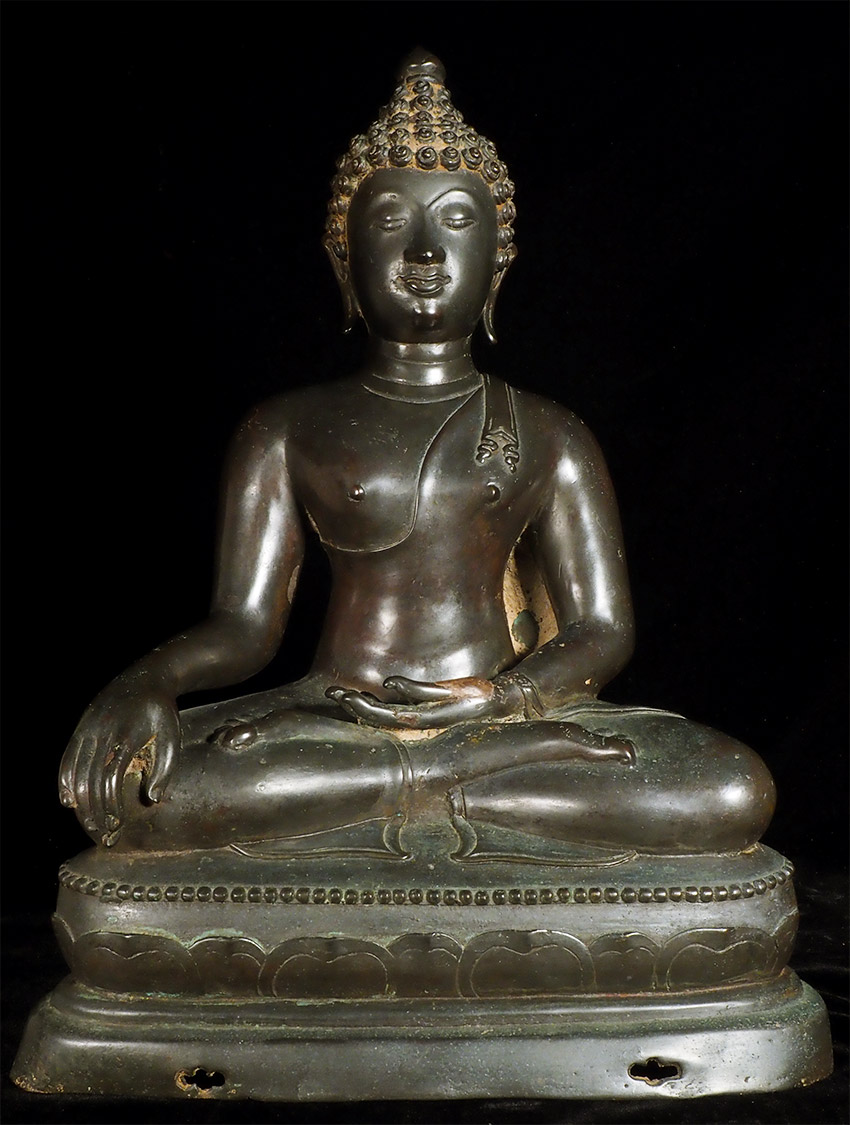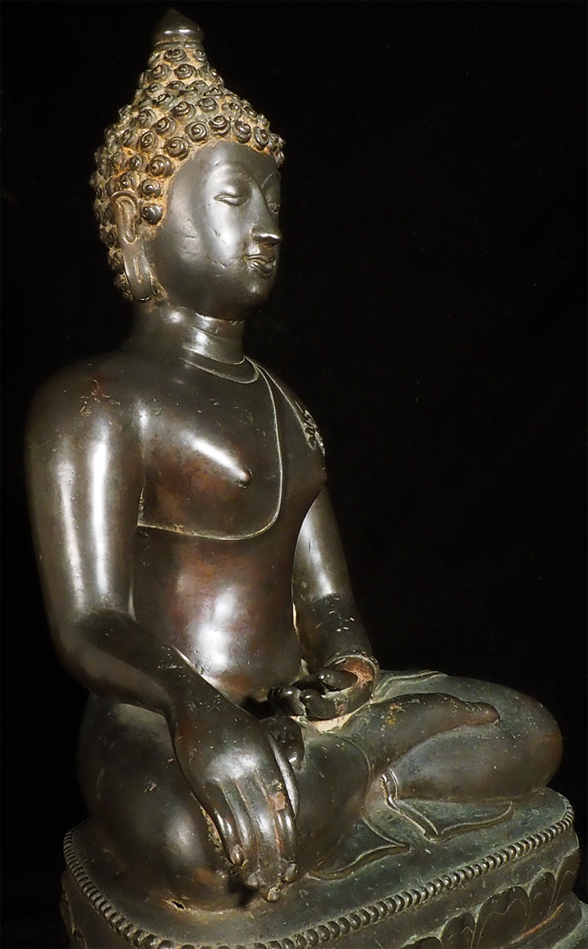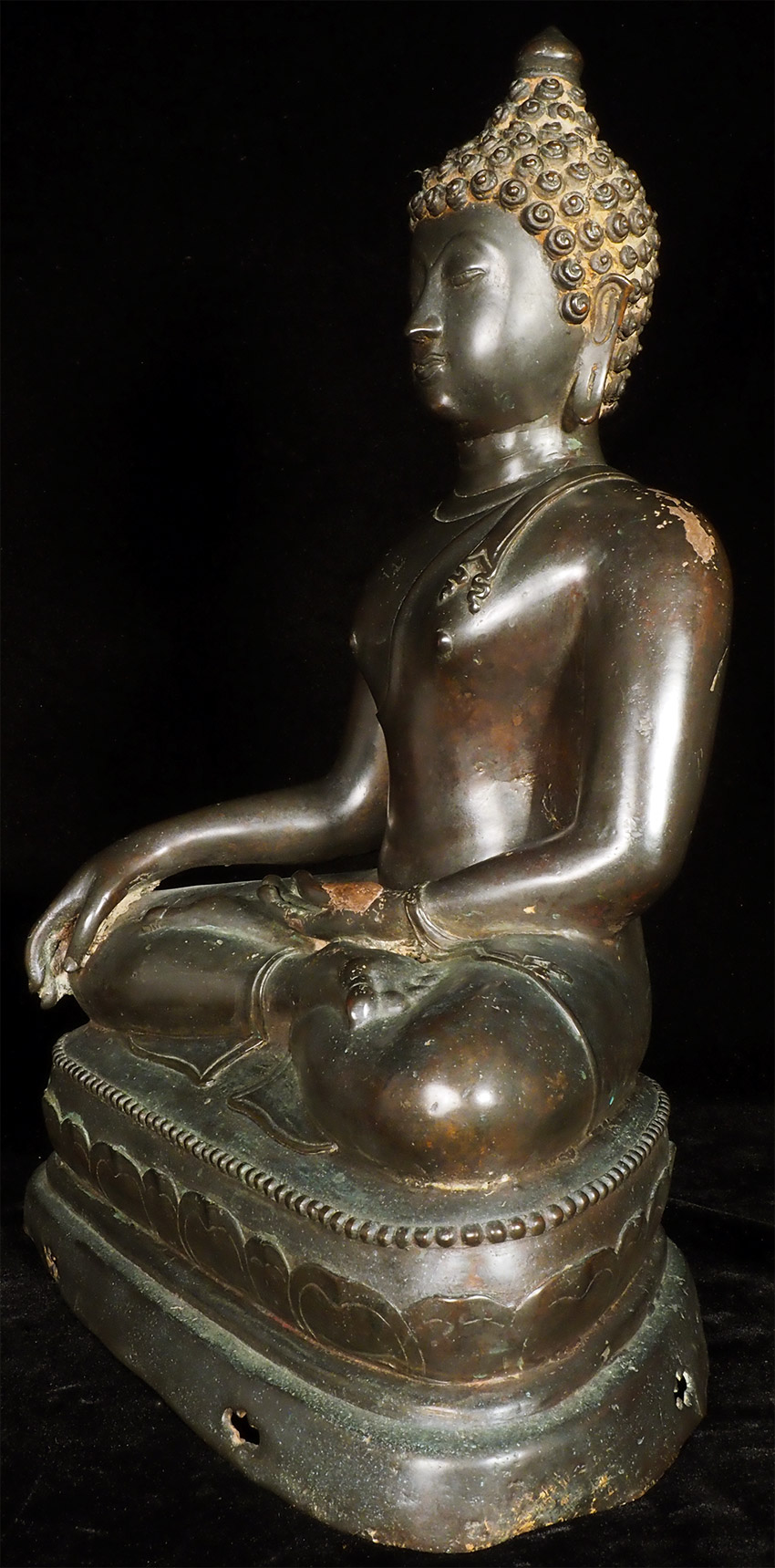 Large Northern Thai Bronze Buddha. Collected by the previous owner in the 1970's while stationed in Thailand during the Vietnam War. Was filled with clay core when he purchased it, and as it was very heavy, he decided to remove it before bring it back to the USA in 1972. I believe this is an 18/19thC emulation of a 15thC style, Earlier example would have been more thickly cast. It appears to have remains of reddish-brown lacquer. Well cast, with typical wear, Impressive at 15.5 inches tall and 11 wide at the base.