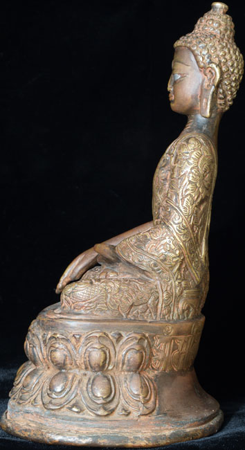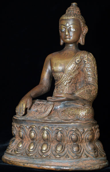 Decorative sino-Tibetan Buddha, with elaborite dress. Inlaid eyes and powerful gaze. Quite heavy for his size. Nice size at 8.5 inches tall by 5.75 inches wide.