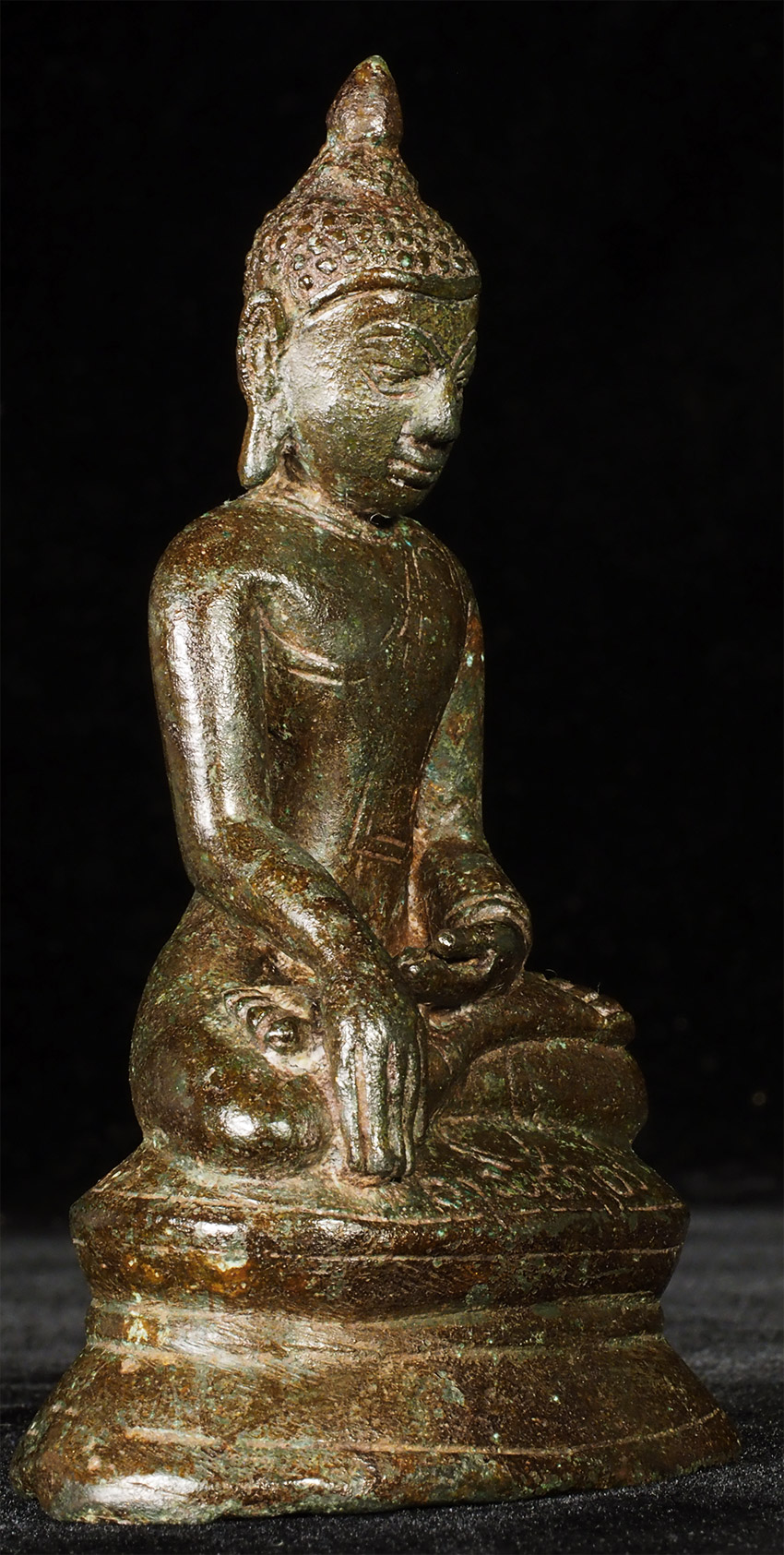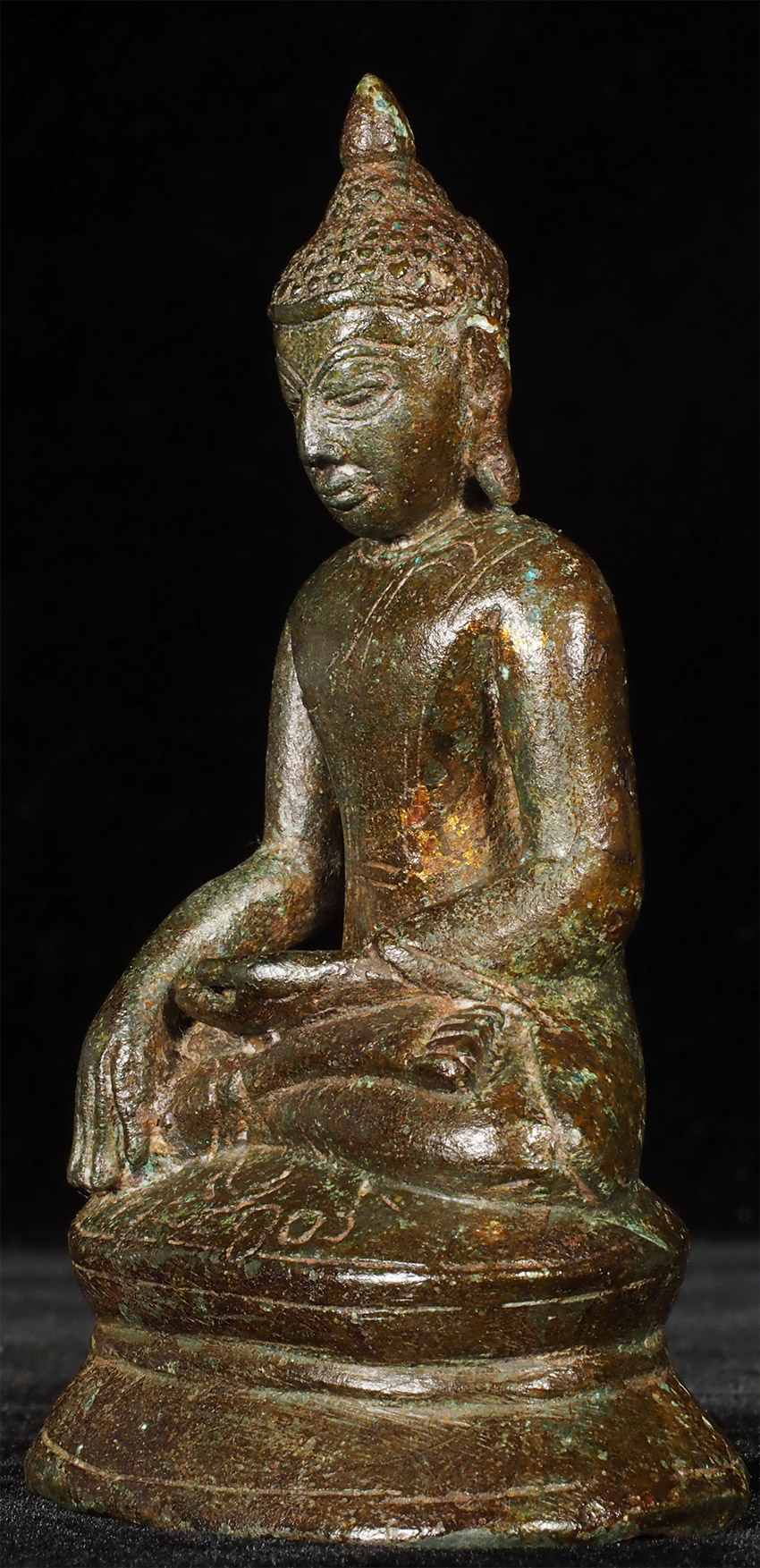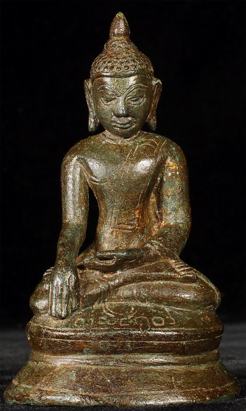 14/15thC Post Pagan Burmese Buddha. Probably from the Arakan area of western Burma. Uncommon. Sits 5" tall, base is 2.75" x 2" Burmese word inscribed into the base just in front of the lap, This type is much rarer than Shan, Mandalay, Pagan, or other well-known types of Burmese Buddhas.