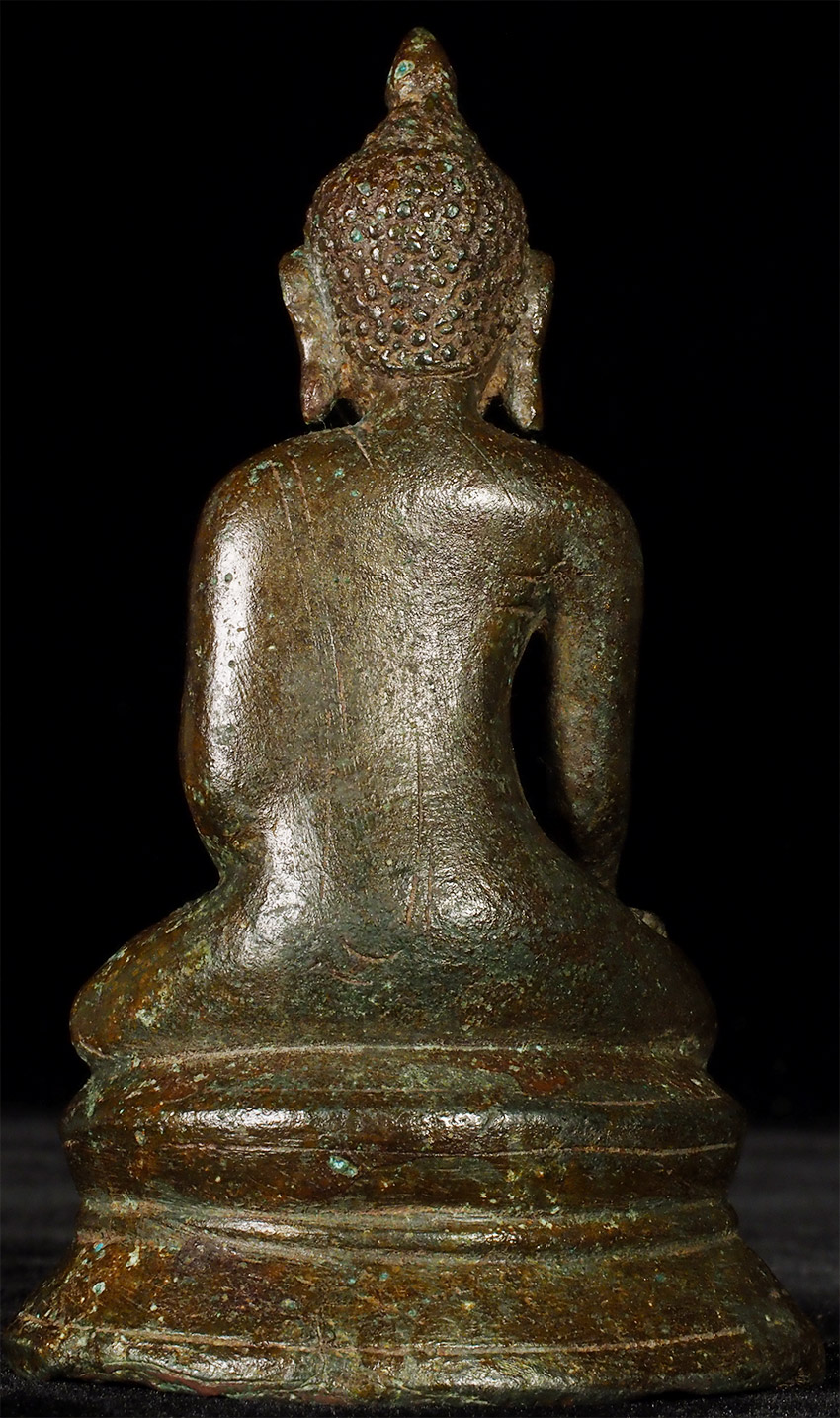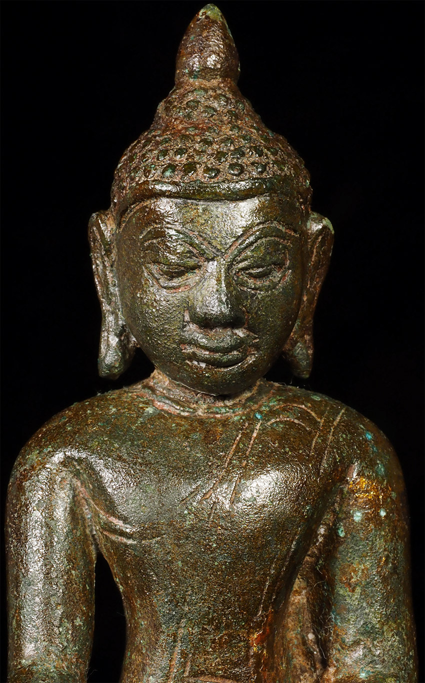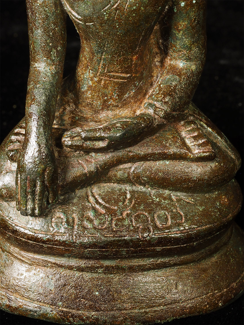 14/15thC Post Pagan Burmese Buddha. Probably from the Arakan area of western Burma. Uncommon. Sits 5" tall, base is 2.75" x 2" Burmese word inscribed into the base just in front of the lap, This type is much rarer than Shan, Mandalay, Pagan, or other well-known types of Burmese Buddhas.