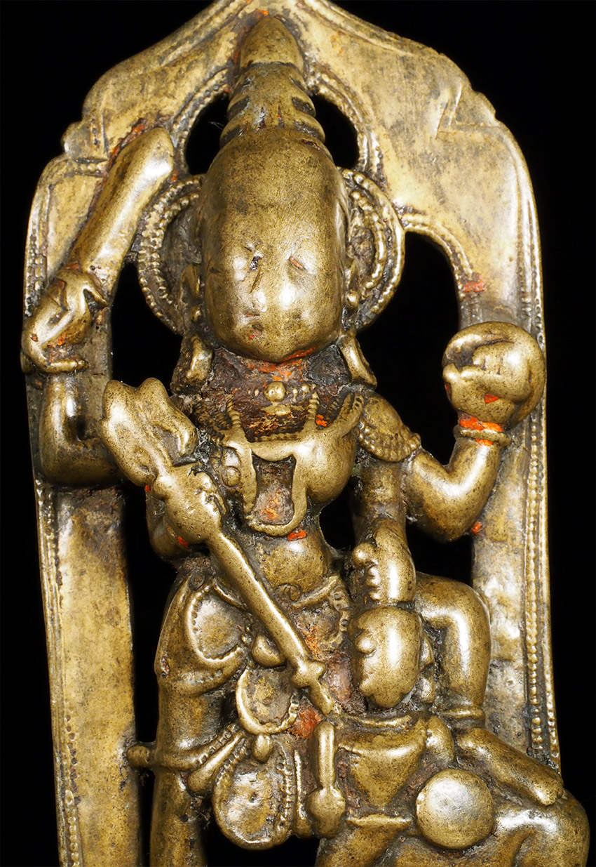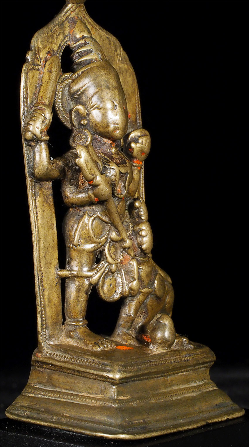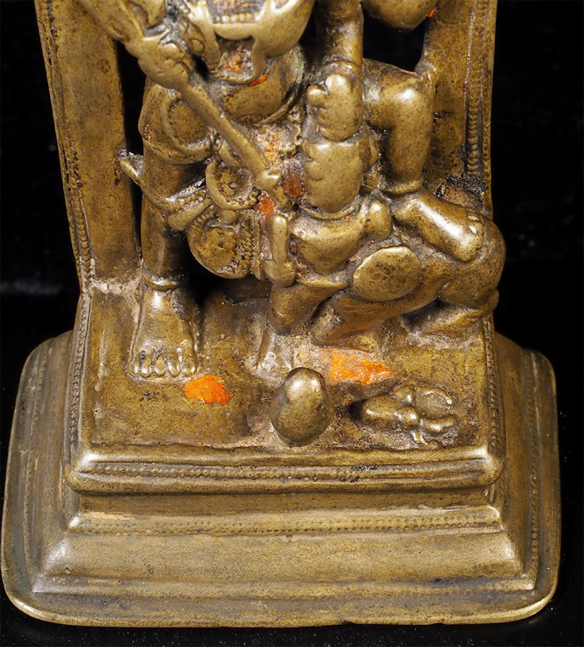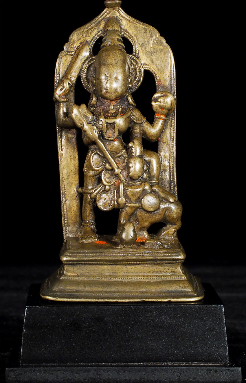 10thC /Durga slaying the Buffalo Demon. Rare survivor. Big head- heavy wear to face, but sensitive modeling and expressiveness shine through brightly. 5 inches tall, 6.5 on the custom base.