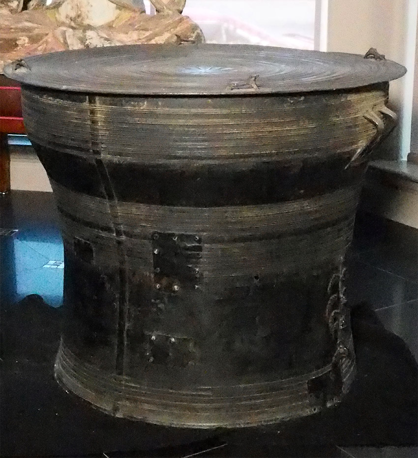 This is an authentic bronze Burmese Rain Drum, probably from the 17/18th century. It is part of a group of 8 drums which I bought as a group from a large estate about 14 years ago. They were collected in 1972 by an American in Air America (CIA) who was based in eastern Thailand. As per his relative who was dispersing the estate, he bought the group of drums in Luang Prabang (Laos) as he flew Americans in and out of Laos. This is a "single" frog drum- there are variations of these drums which have double or triple frogs. The single ones tend to be the earliest ones. Research has determined that these drums have been made for hundreds of years (perhaps most of a millennium) by the Karen people. They are primarily made in Burma, and even the ones which have long been in Laos and Thailand are old imports from Karen groups in Burma. The drum is large at 21.5 inches to the top of the frogs' heads. The top diameter is approx 25 inches. Several beautiful early repairs.