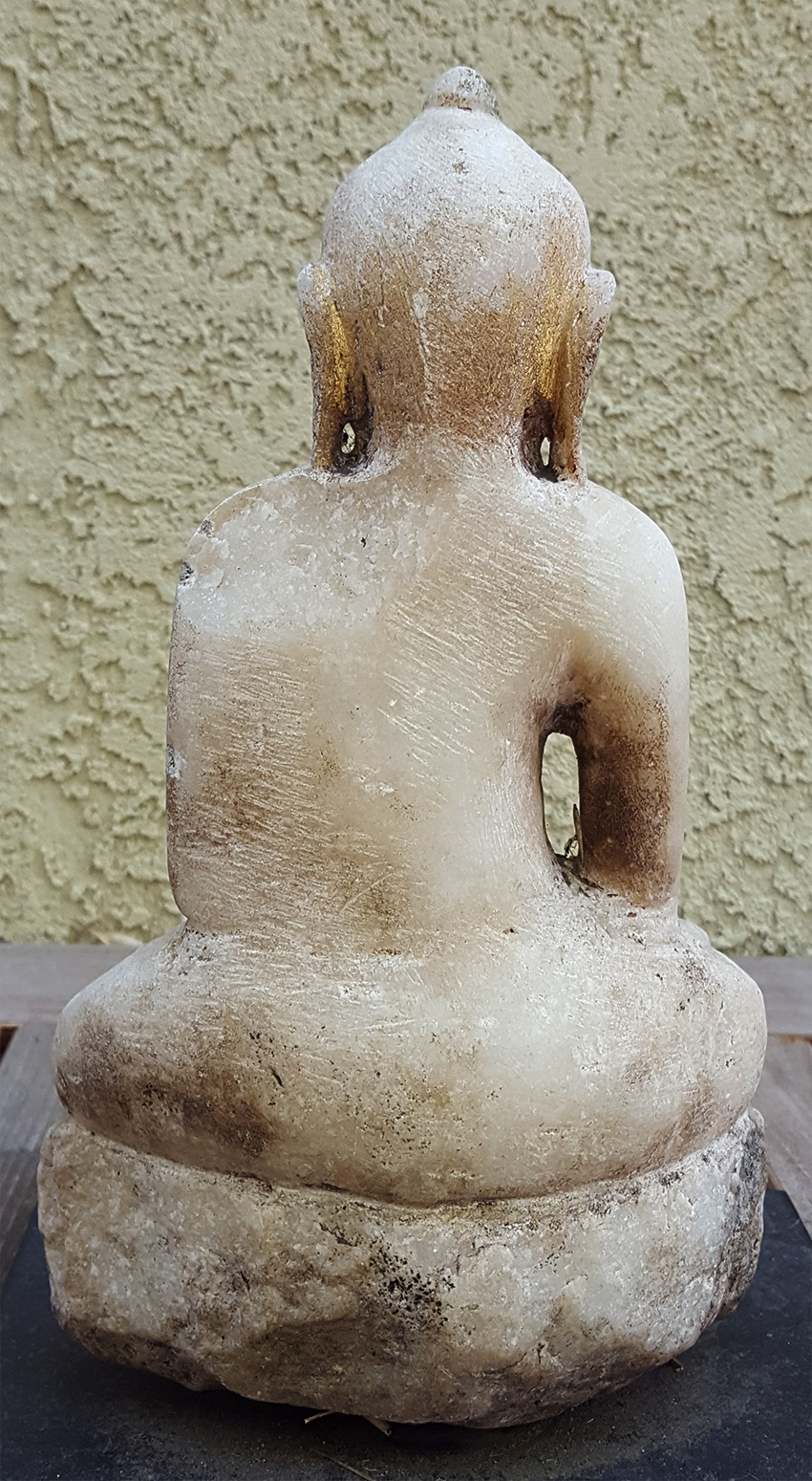Burmese 18/19thC alabaster Buddha. I currently have outside in the bamboo garden, but would be great inside or outside. On custom metal stand. Approx 11 inches tall not including the attached metal stand.