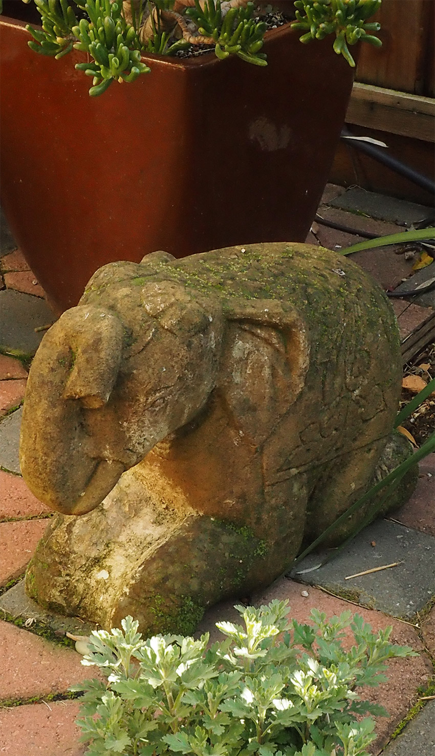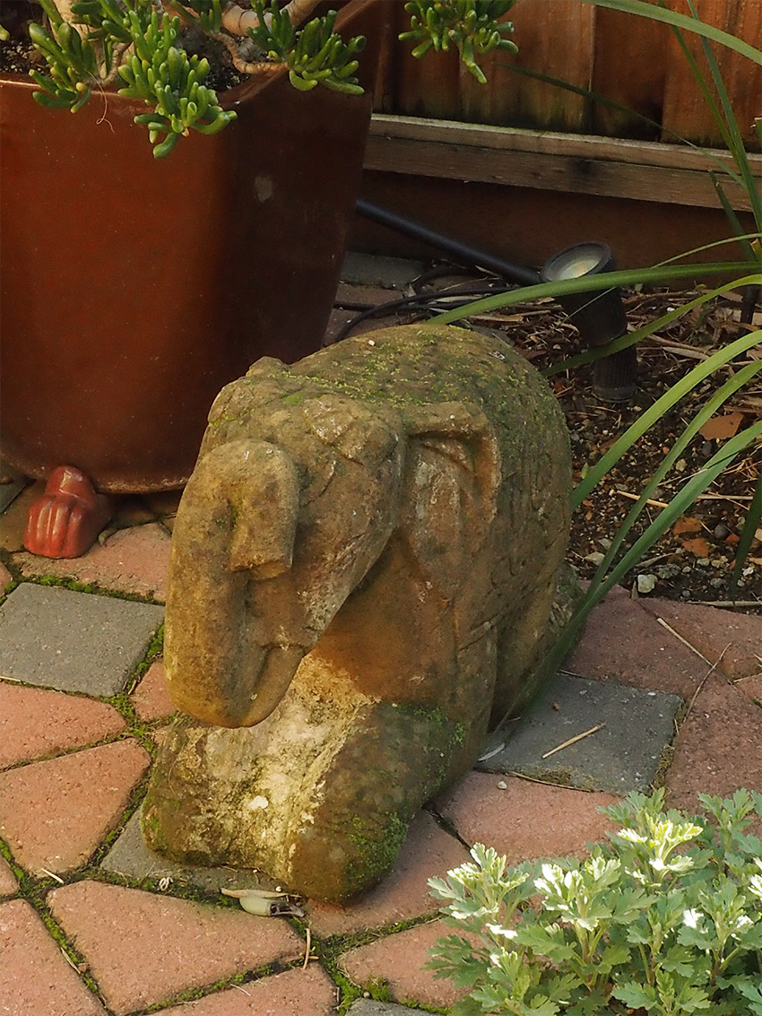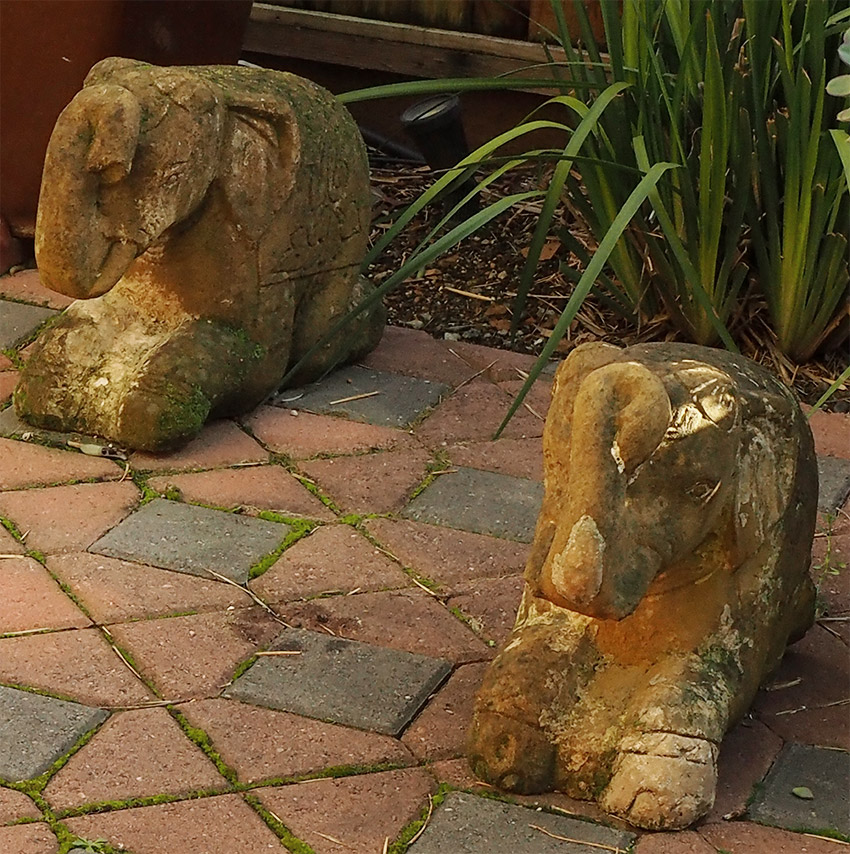 Rare pair of 18/19thC Shan Stone Temple Elephants. Given to me as a gift by a Burmese dealer friend 30 years ago, who had a whole group of these that his family had brought to Europe in the 1970's. Virtually all of the others had major damage- these have some chips/losses, but are in good condition for authentic examples. They would have been part of a group of 20 or more of these that would have surrounded the outside of a small Shan temple. I've never seen another pair of these for sale. I have near my bamboo garden, but they would look great inside or outside. Quite heavy. Size is 14 inches tall by 7 inches wide by 17 inches long and heavy.