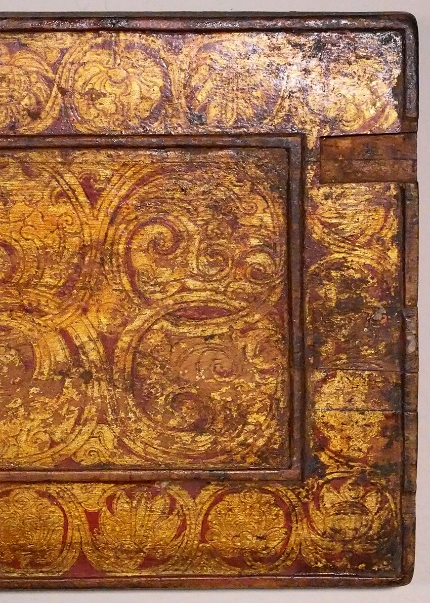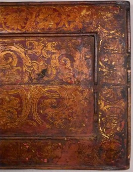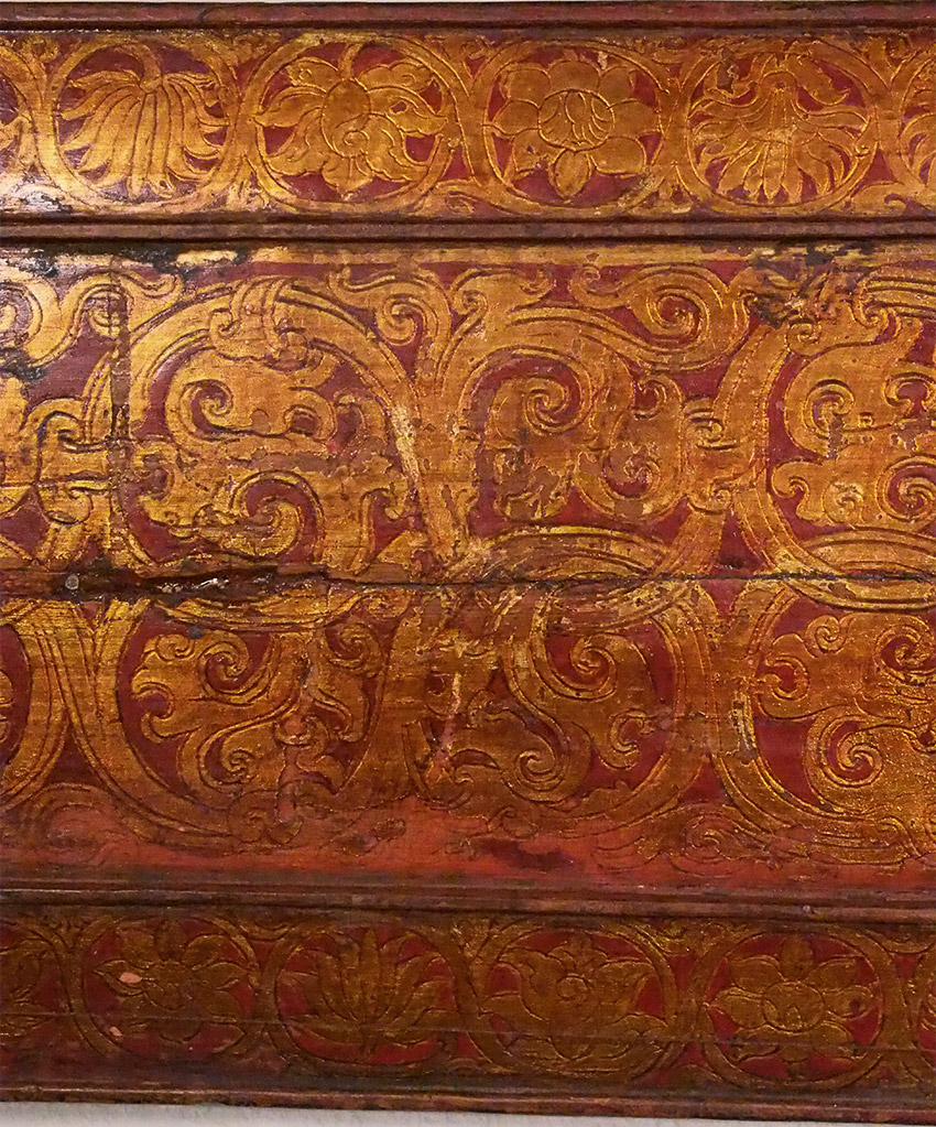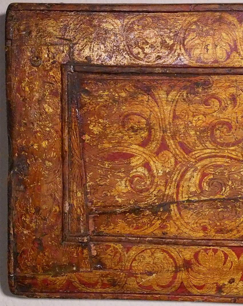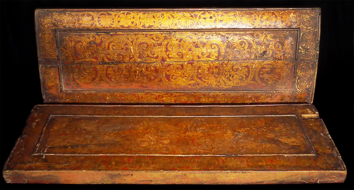 Rare matched set of Tibetan book covers, beautifully painted on both sides, though the paint on the inside shows considerable wear. Likely 17/18thC or earlier, I am not trained in how to date this type with precision. They are certainly centuries old, and show almost no damage or repair other than age splits and the addition of hanging wires on the inside of each. A few small cut out pieces suggest these may have been turned into shelves or disguised in some way as utilitarian shelves during the Cultural Revolution in China in the 1960's to keep them from being destroyed. Quite heavy as they are made of hard wood and are large at 31 inches long by a bit over 11 inches wide by over 1.5 inches thick. I believe all paint is original and untouched. So many of these are either repainted or extensively overpainted-these look to be relatively untouched. Single one sided covers are getting harder to find, and prices are going up, but they are still available on the market. A matching top and bottom set that are decorated on both the inside and outside have always been relatively uncommon- these days they have become almost impossible to find.