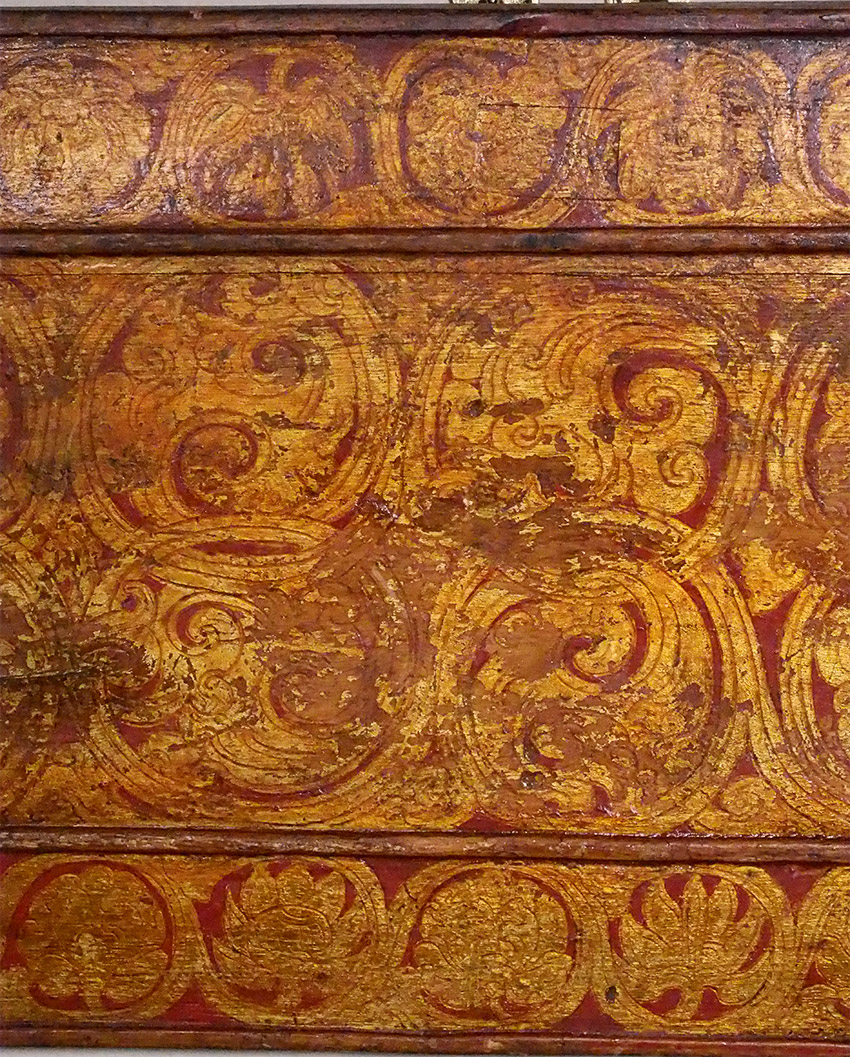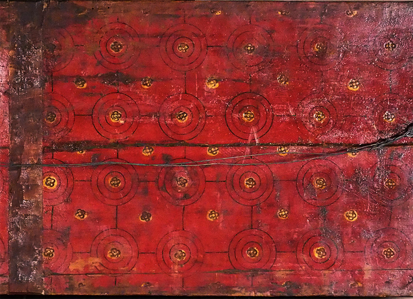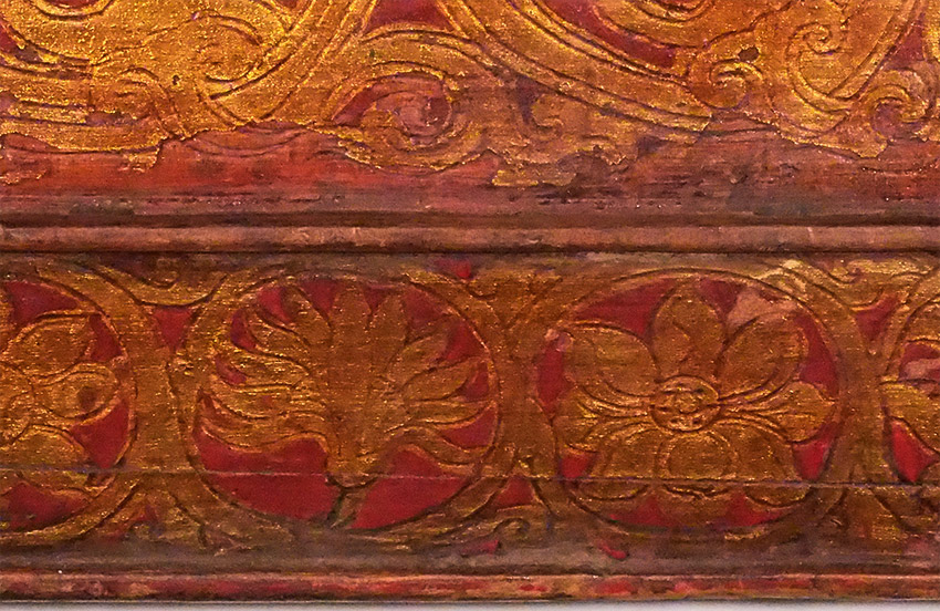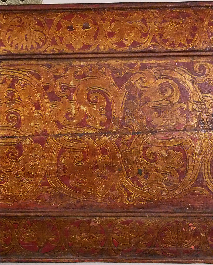 Rare matched set of Tibetan book covers, beautifully painted on both sides, though the paint on the inside shows considerable wear. Likely 17/18thC or earlier, I am not trained in how to date this type with precision. They are certainly centuries old, and show almost no damage or repair other than age splits and the addition of hanging wires on the inside of each. A few small cut out pieces suggest these may have been turned into shelves or disguised in some way as utilitarian shelves during the Cultural Revolution in China in the 1960's to keep them from being destroyed. Quite heavy as they are made of hard wood and are large at 31 inches long by a bit over 11 inches wide by over 1.5 inches thick. I believe all paint is original and untouched. So many of these are either repainted or extensively overpainted-these look to be relatively untouched. Single one sided covers are getting harder to find, and prices are going up, but they are still available on the market. A matching top and bottom set that are decorated on both the inside and outside have always been relatively uncommon- these days they have become almost impossible to find.