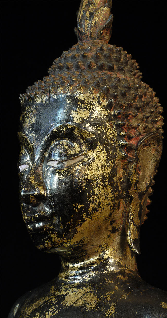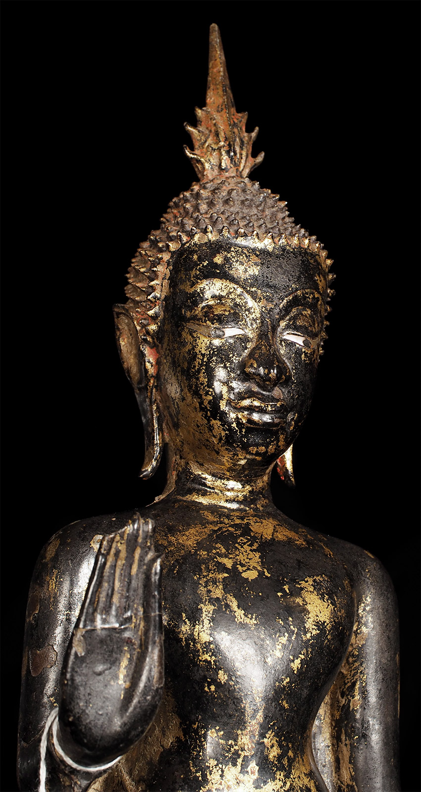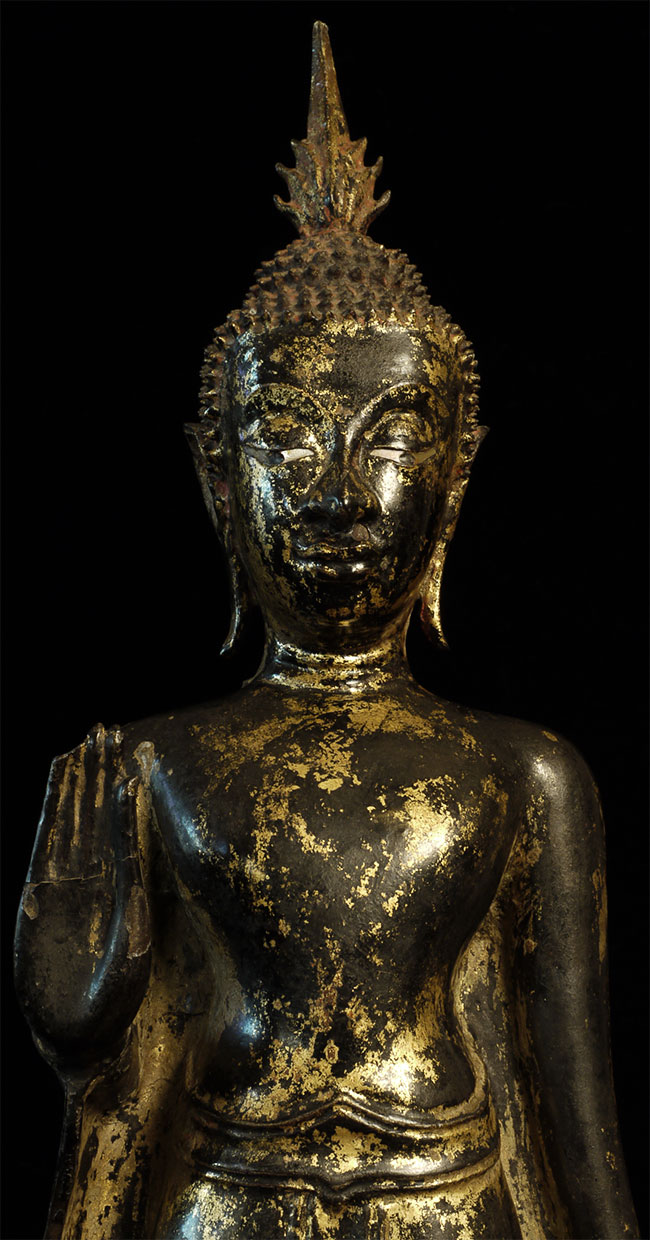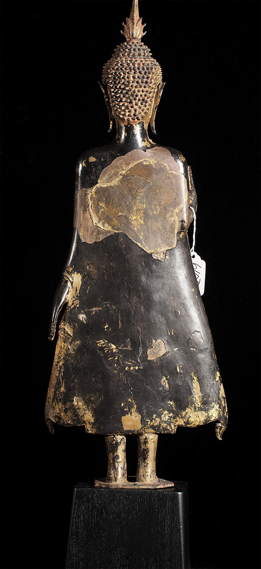 Standing Thai Ayuthaya Buddha with Laos influence (note the finial, for example). It is large at 19.5 inches high, the base is 4 1/8 inches high, and the total height is 24 inches high. The widest point is 7 inches. Very good quality. It retains most of its original thick black lacquer- rare to find such a complete surface to the lacquer on one of these at 350 years old. Great face.