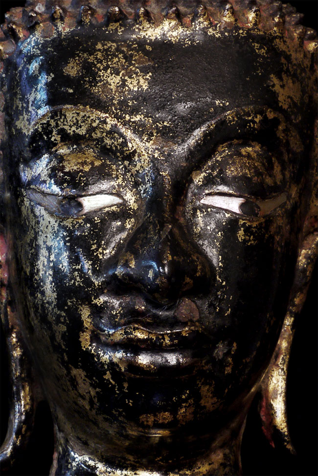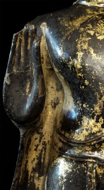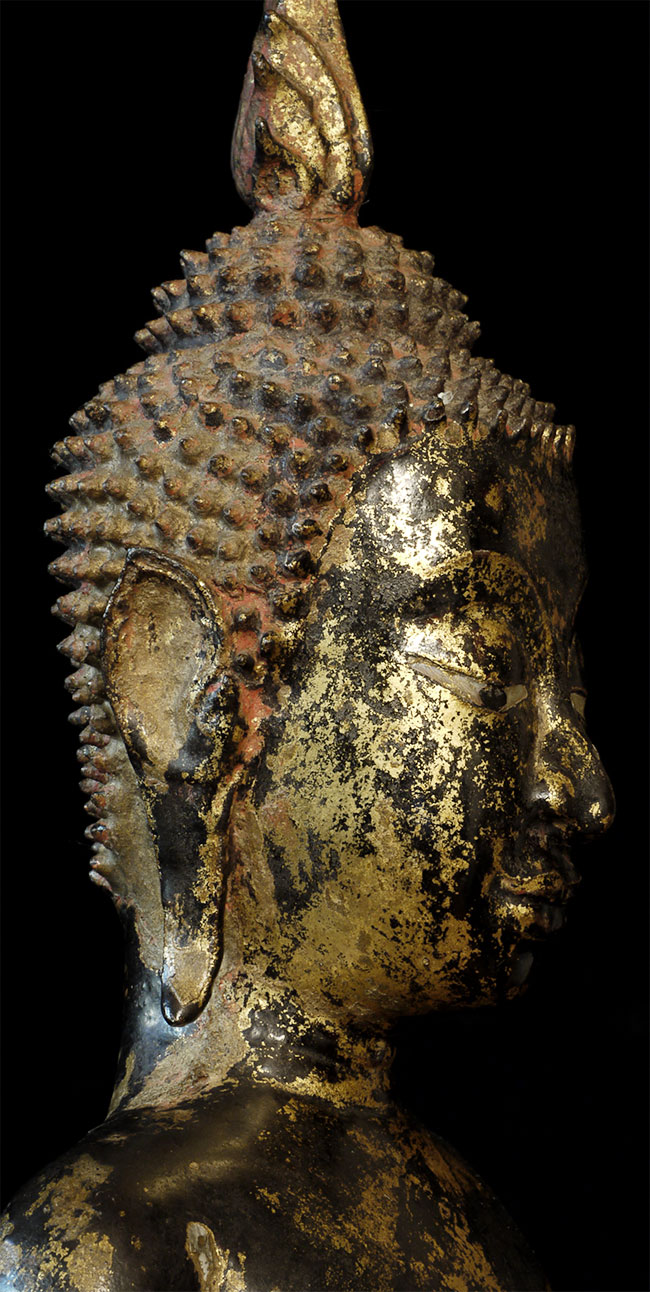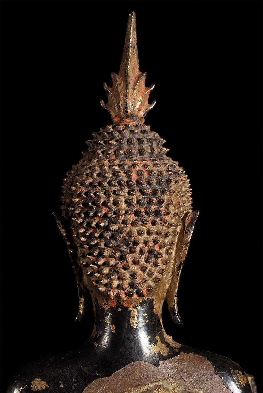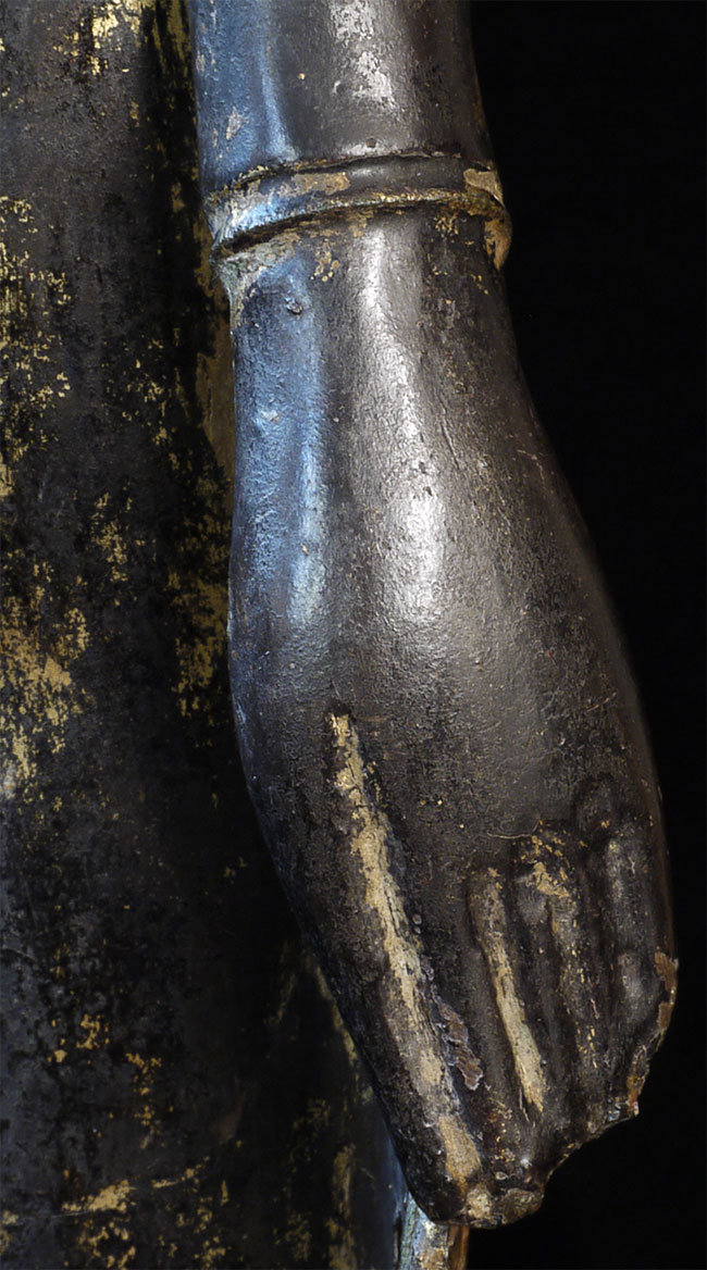 Standing Thai Ayuthaya Buddha with Laos influence (note the finial, for example). It is large at 19.5 inches high, the base is 4 1/8 inches high, and the total height is 24 inches high. The widest point is 7 inches. Very good quality. It retains most of its original thick black lacquer- rare to find such a complete surface to the lacquer on one of these at 350 years old. Great face.
