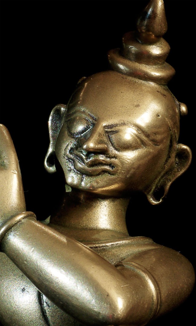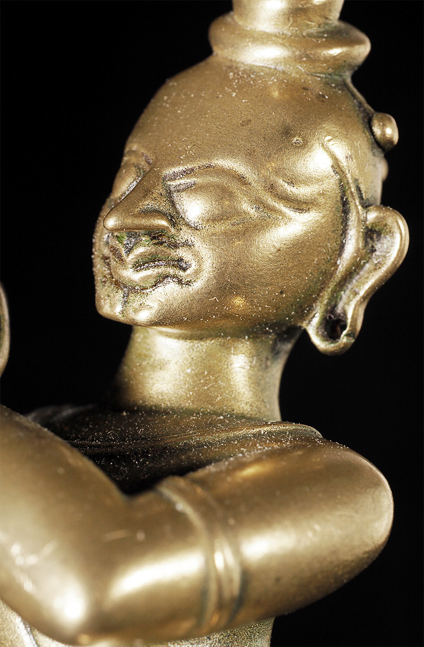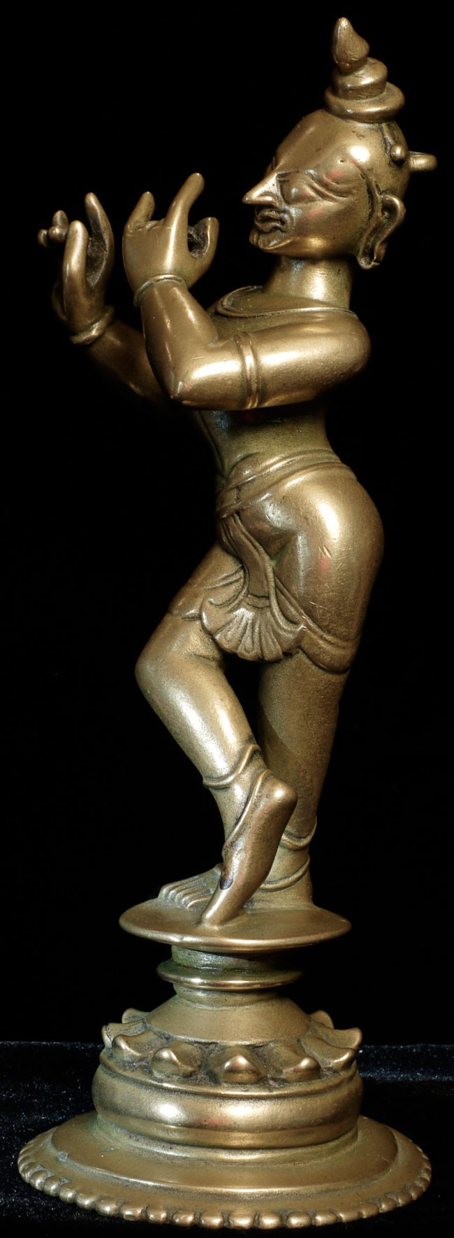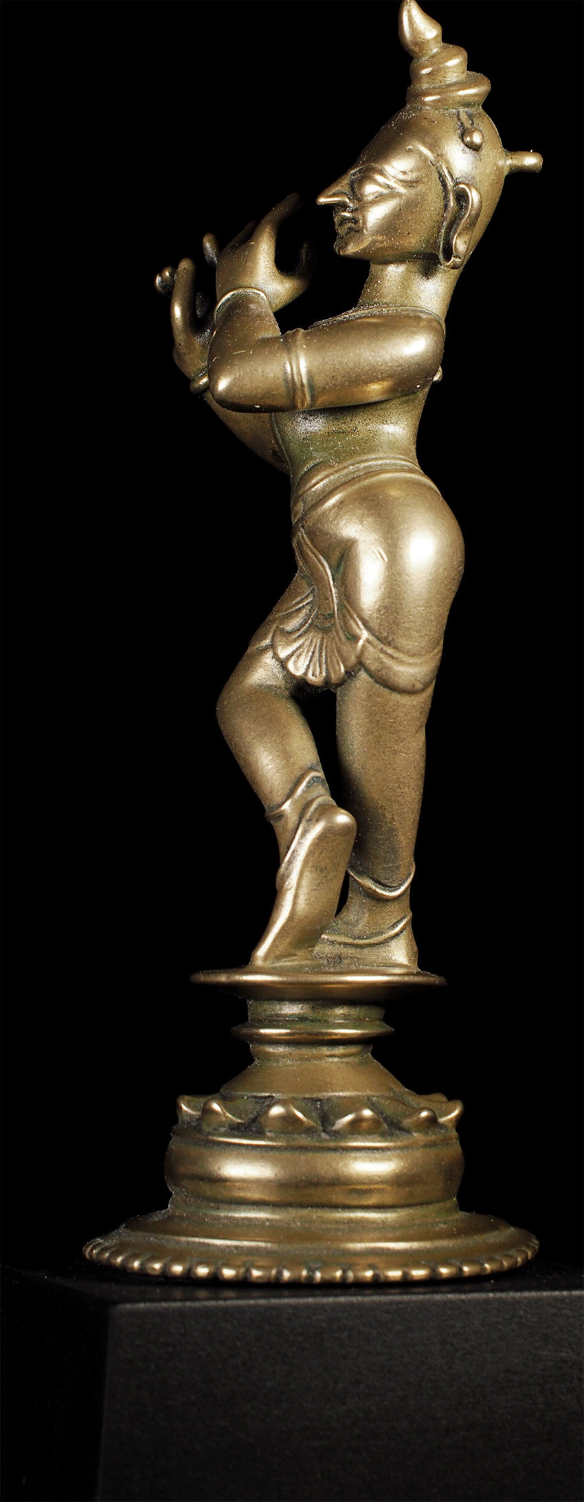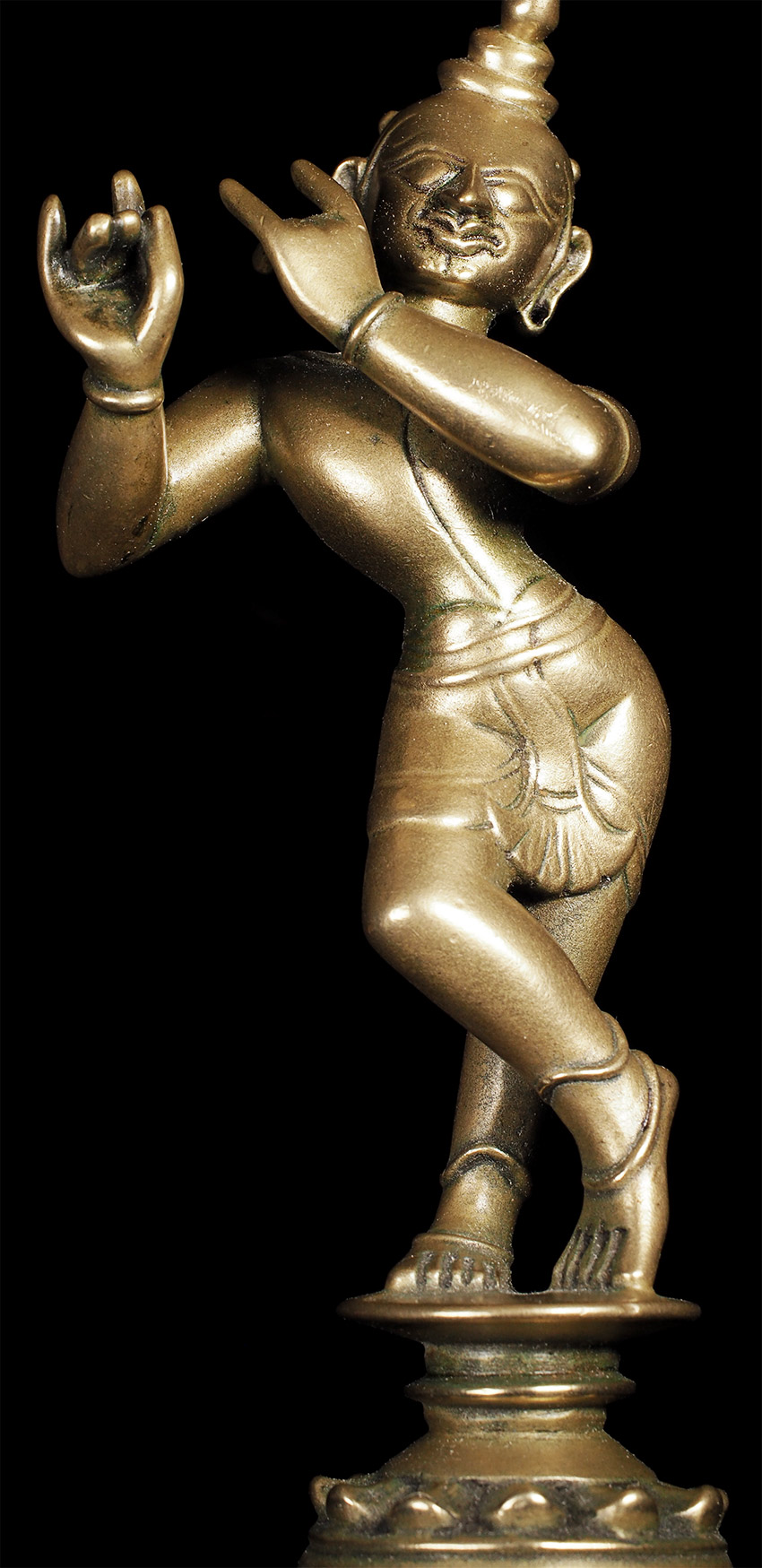 Remarkable face on this lively 17/18thC Krishna. High-quality alloy and casting and large. This piece measures 8" tall and 10" with its custom base. Much finer than the vast majority of its type. Starting price cut in half.