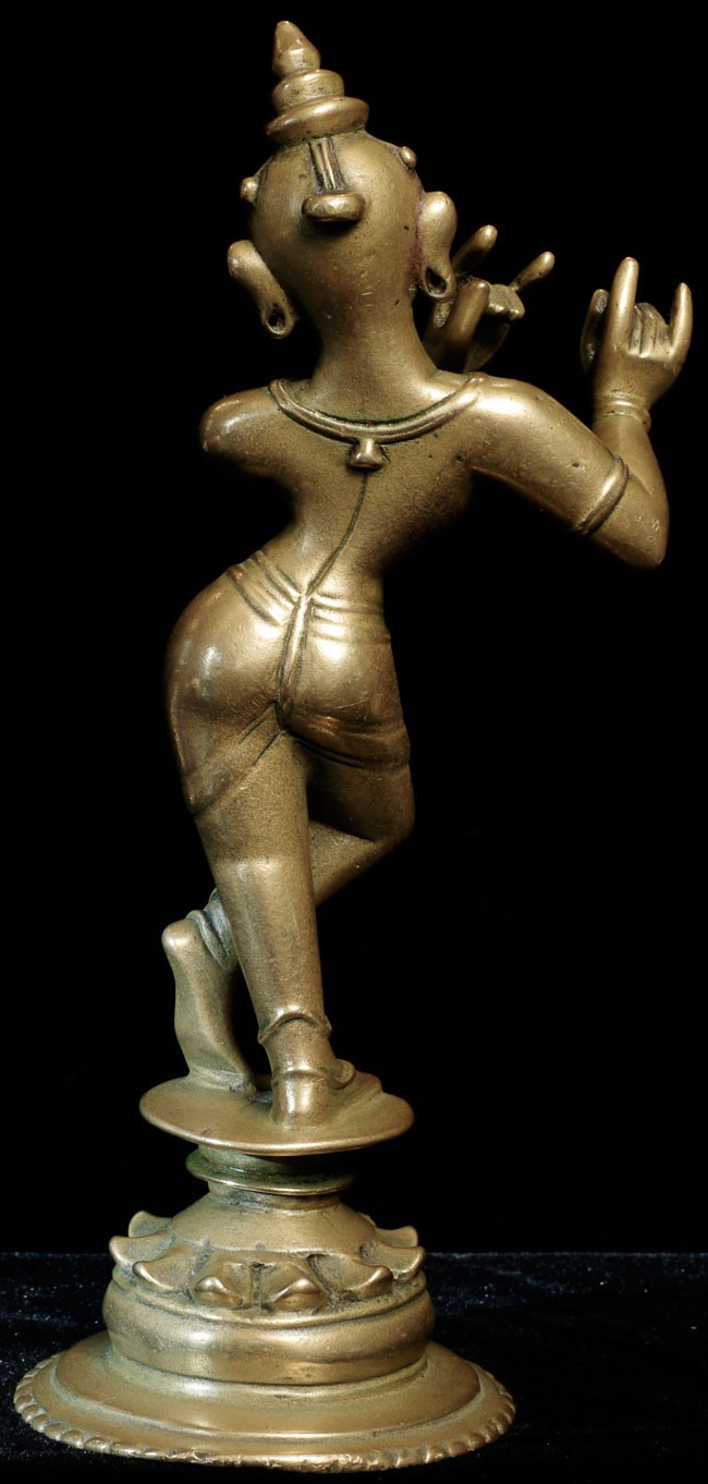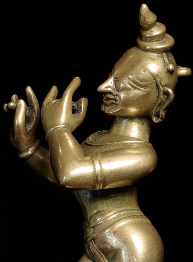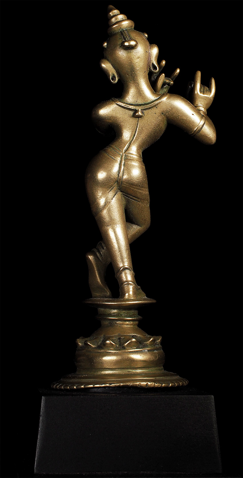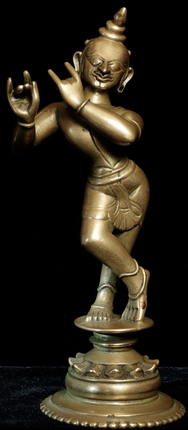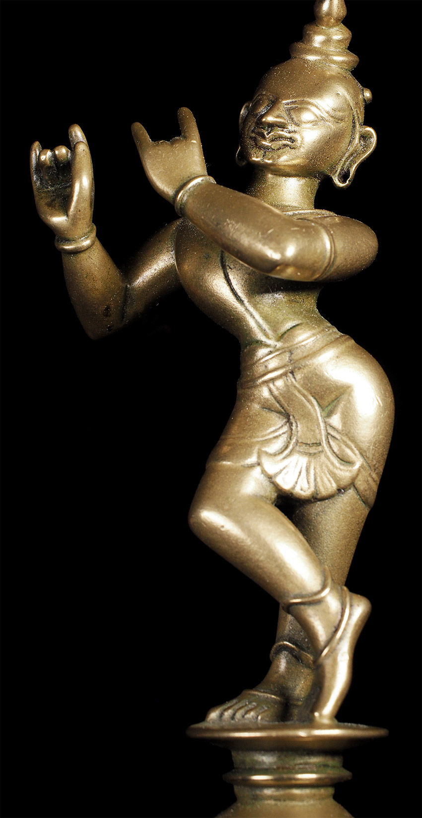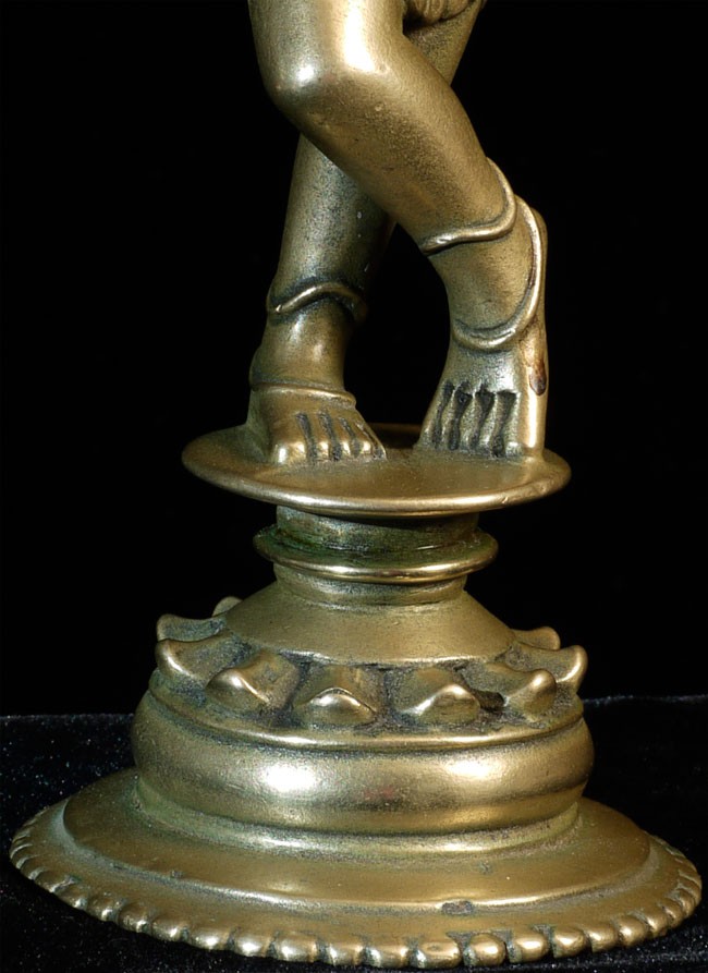 Remarkable face on this lively 17/18thC Krishna. High-quality alloy and casting and large. This piece measures 8" tall and 10" with its custom base. Much finer than the vast majority of its type. Starting price cut in half.