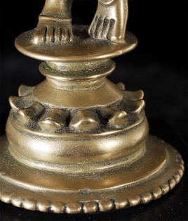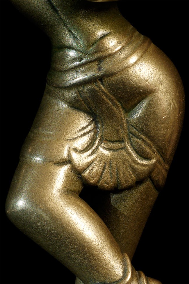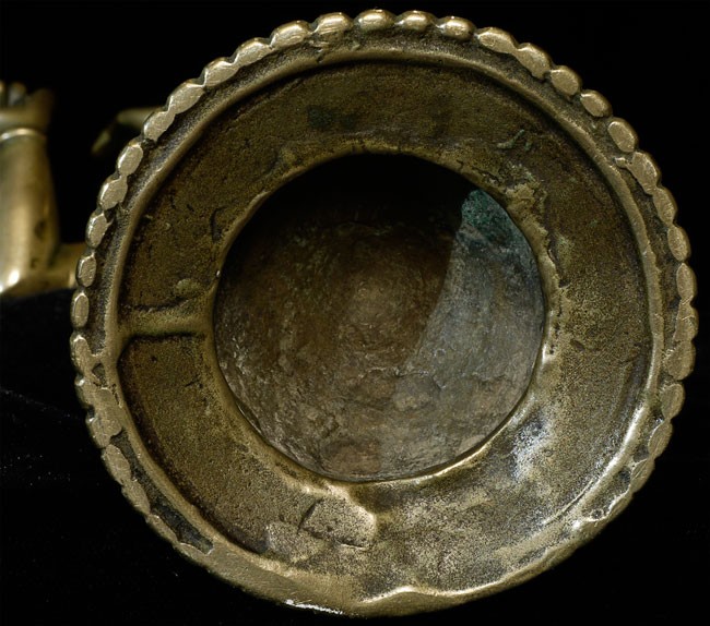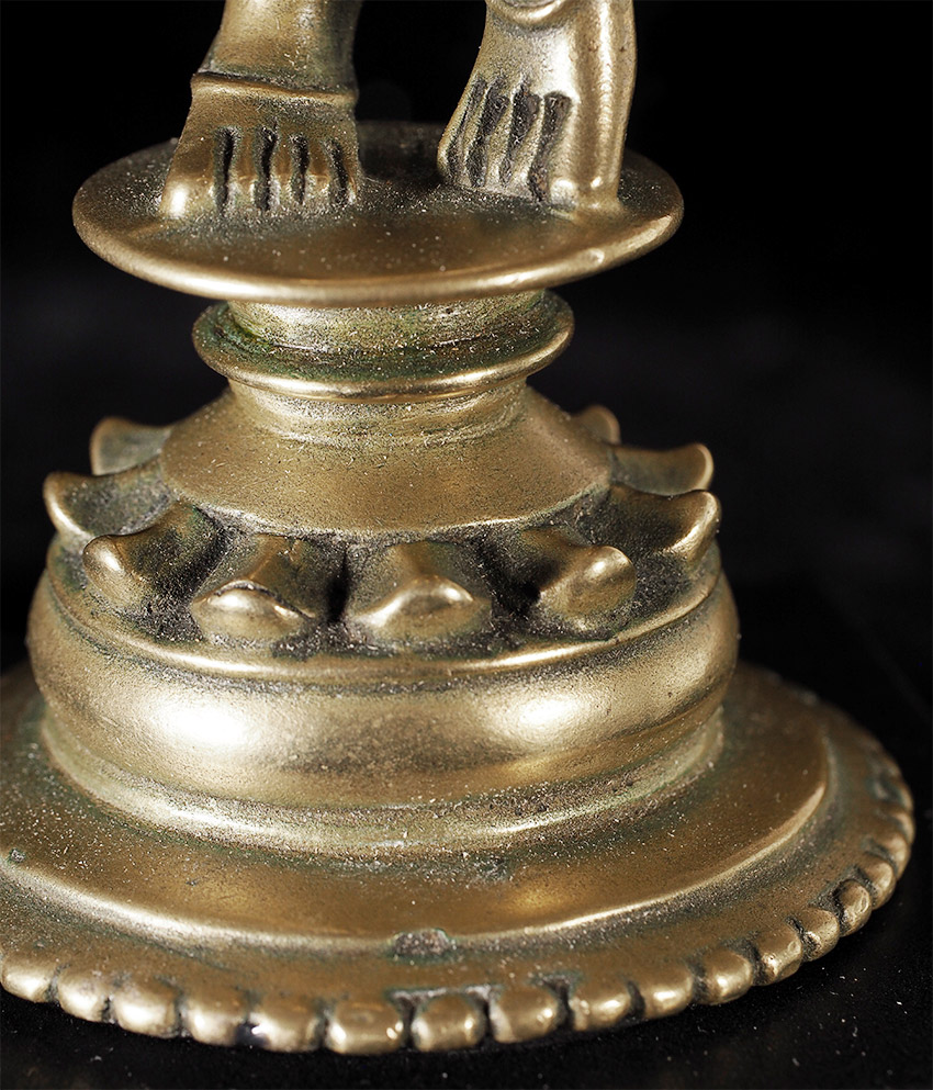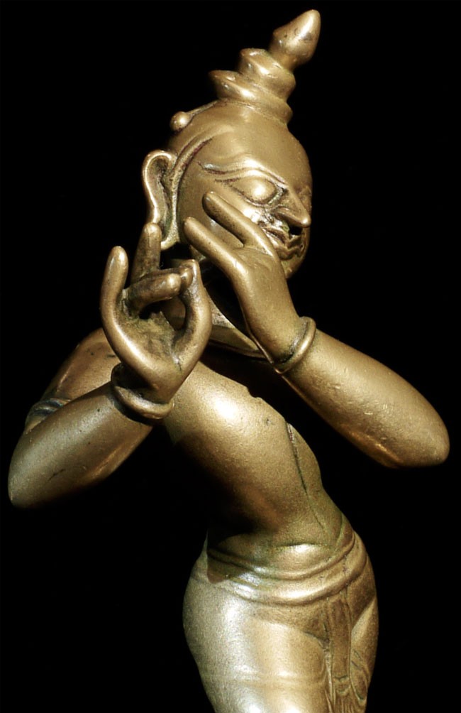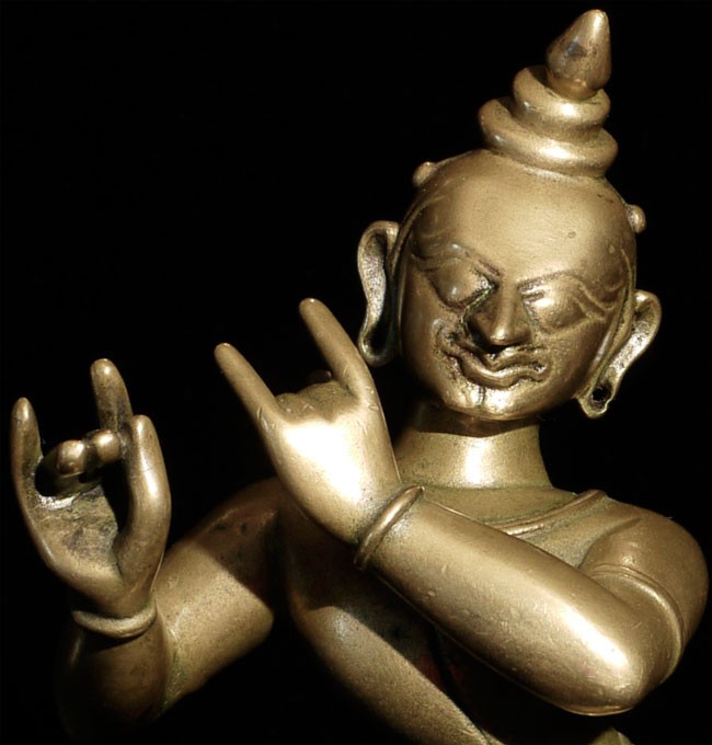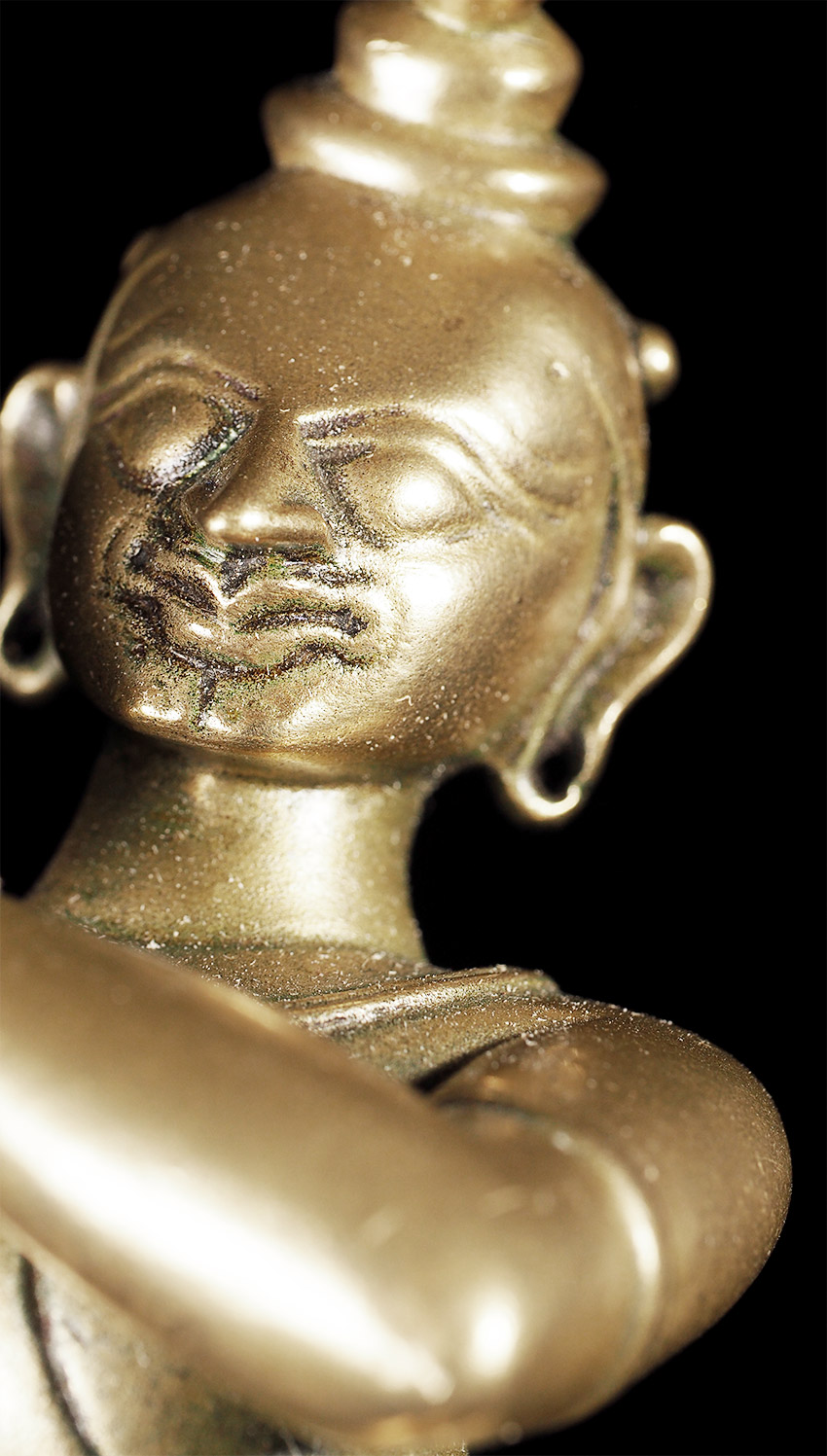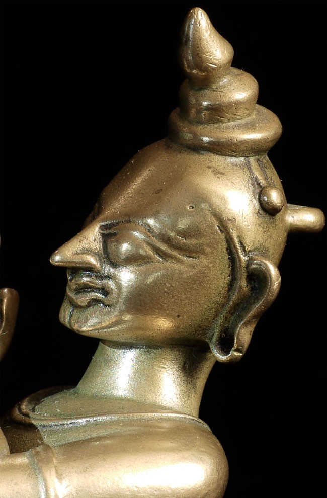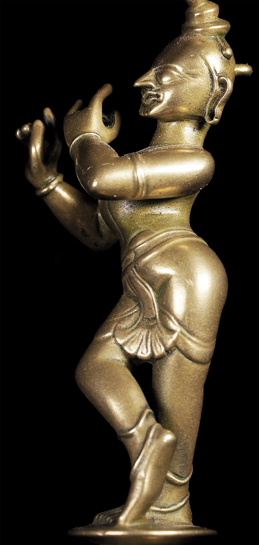 Remarkable face on this lively 17/18thC Krishna. High-quality alloy and casting and large. This piece measures 8" tall and 10" with its custom base. Much finer than the vast majority of its type. Starting price cut in half.