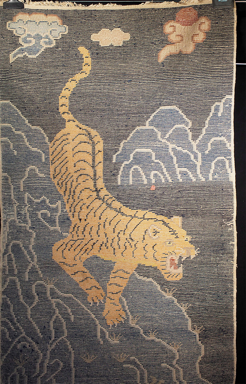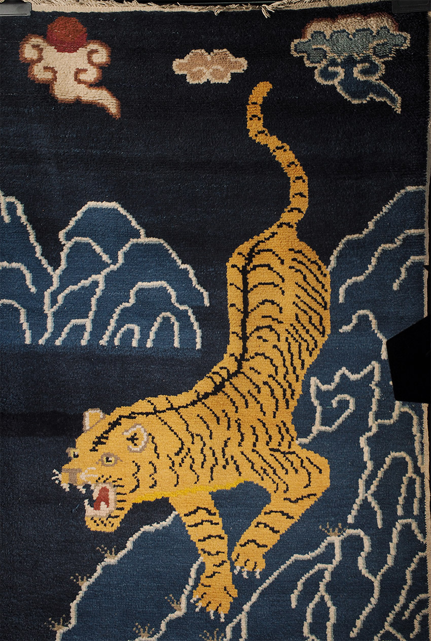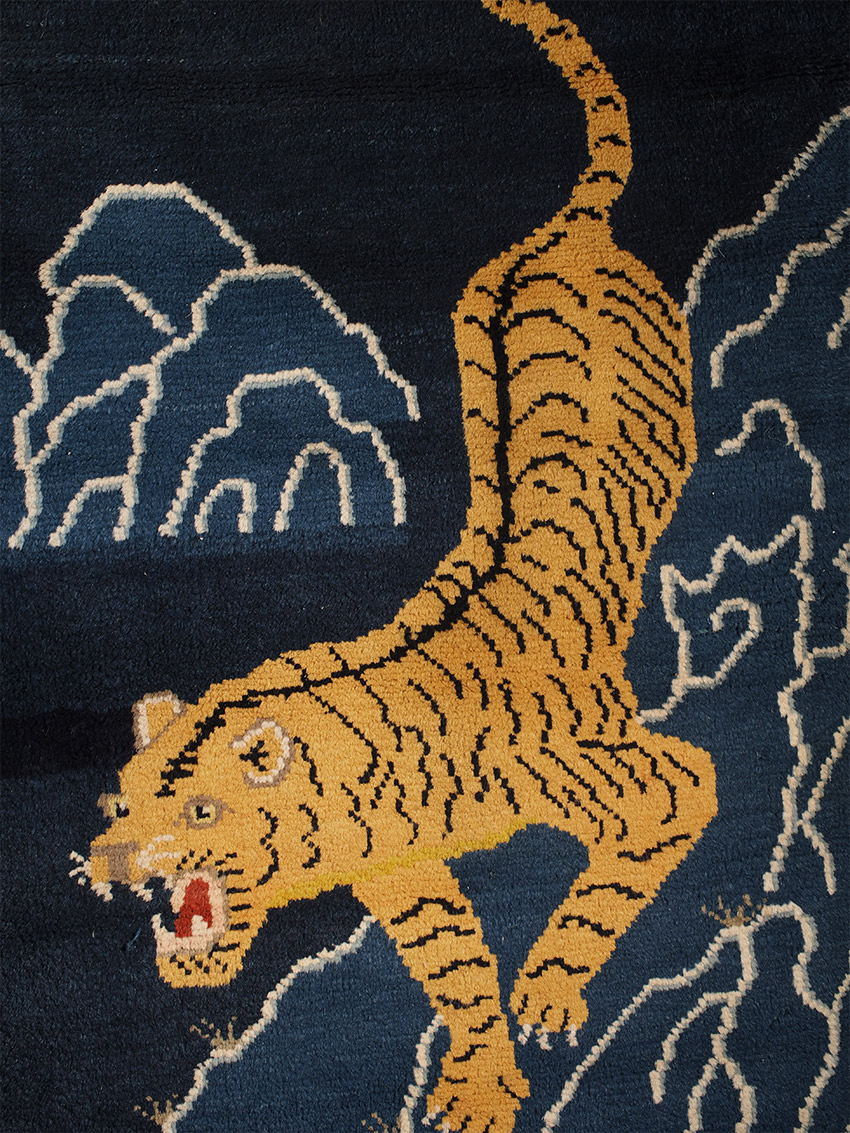 Beautiful antique Tibetan Tiger Rug. Well made, dynamic design. Possibly Mongolian, and made for use, not for tourist consumption. Was in storage almost 45 years. Probably 75 to 100 years old. Good size and weight, measuring 57.5" x 34". It is in good condition for an older rug. From a collection put together in the 1960's that was put into storage after the owner passed away and only seen the light of day again recently.
