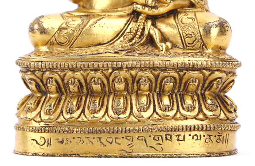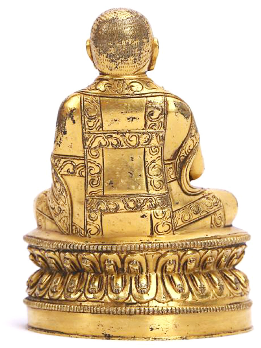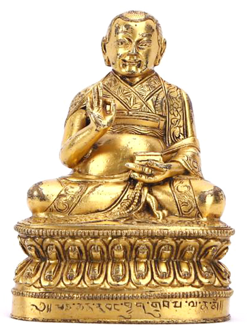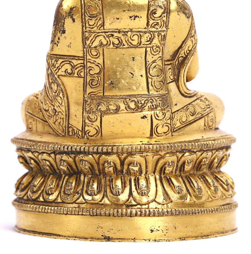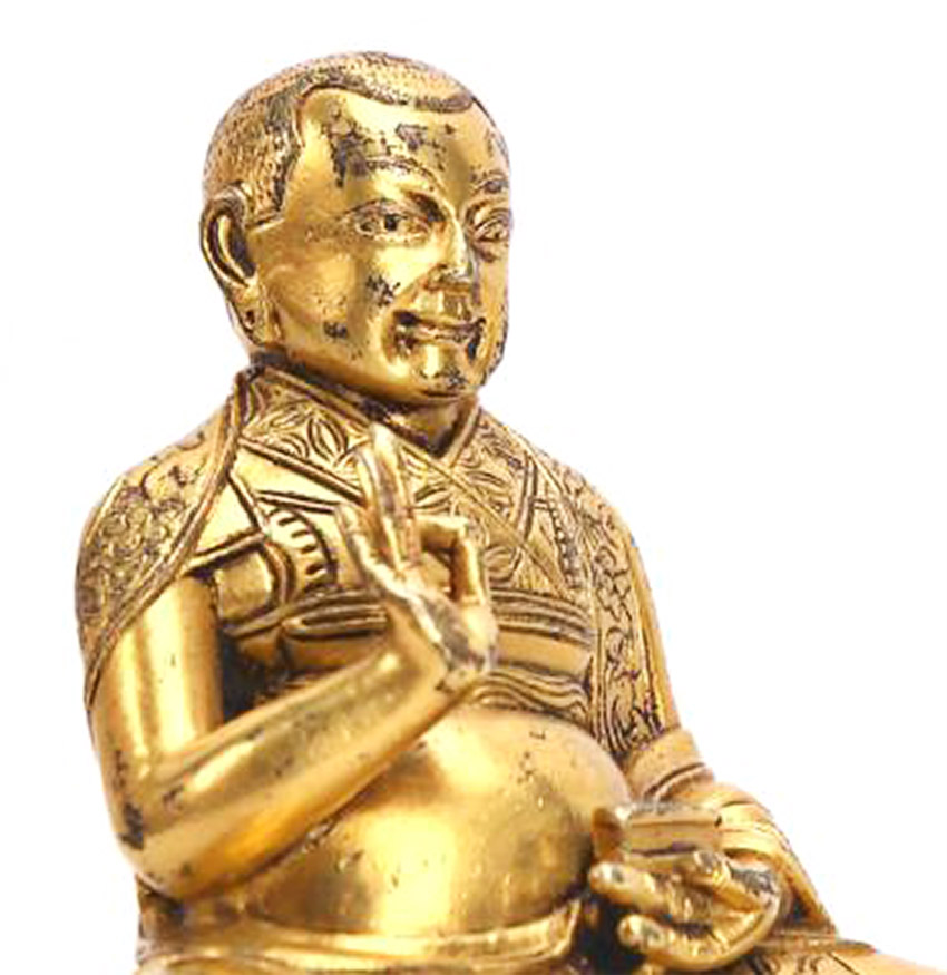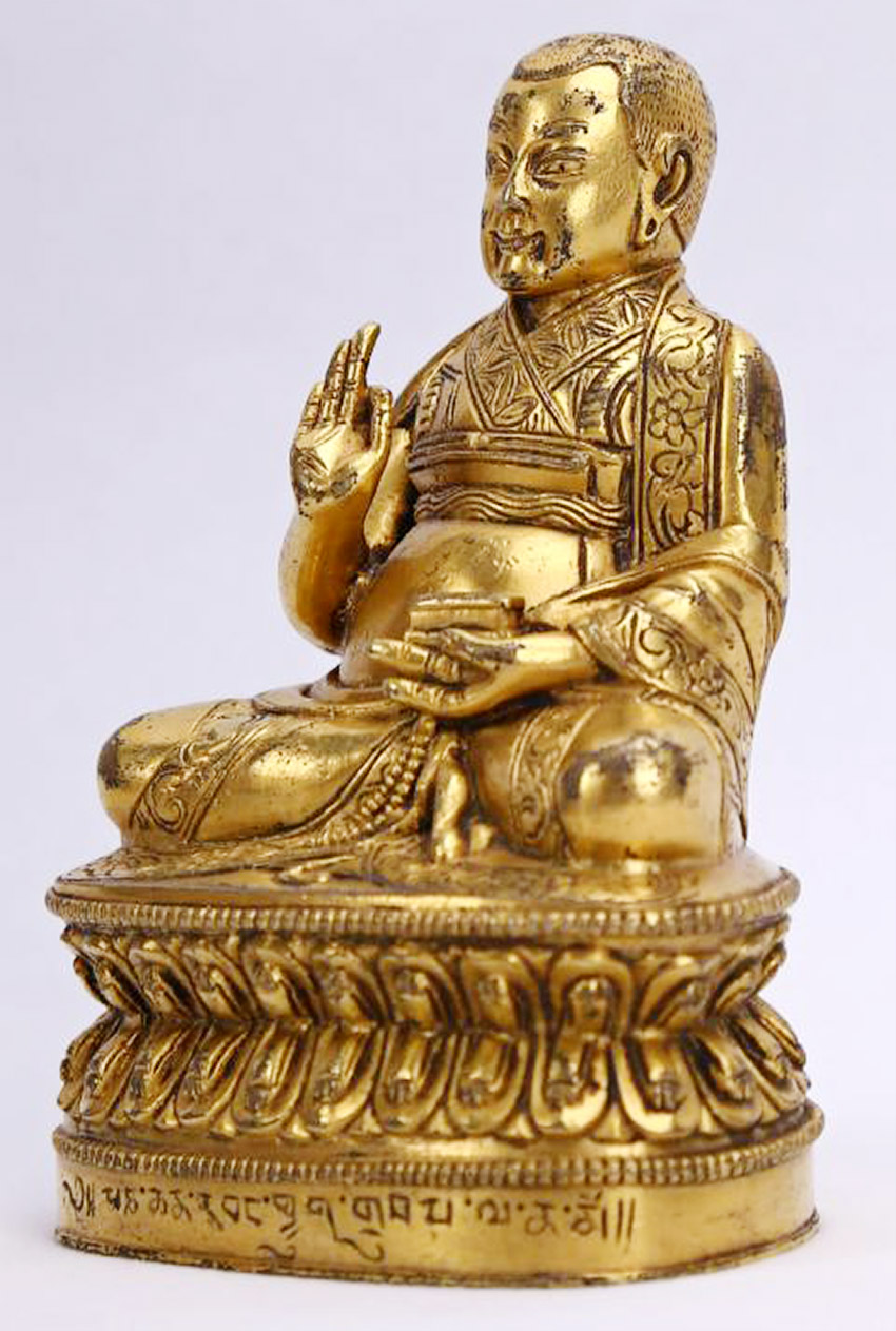 Fine antique Tibetan Bronze Portrait Statue. Very finely cast and gilded. Has writing on the front- probably says who this sculpture depicts. Beautiful face and overall detailing. This piece measures approximately 4" tall, and extremely heavy for its size. Exceptional!!.