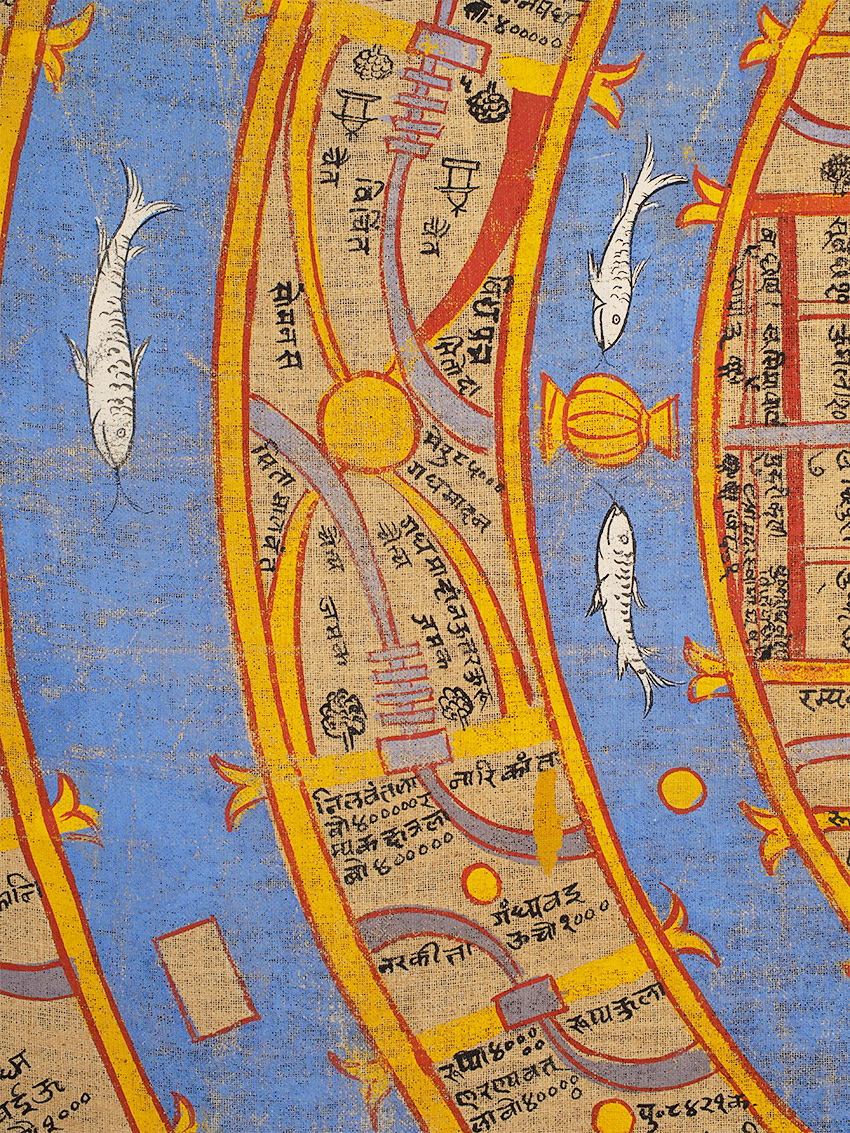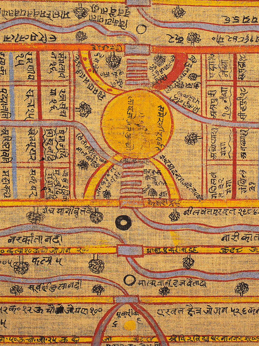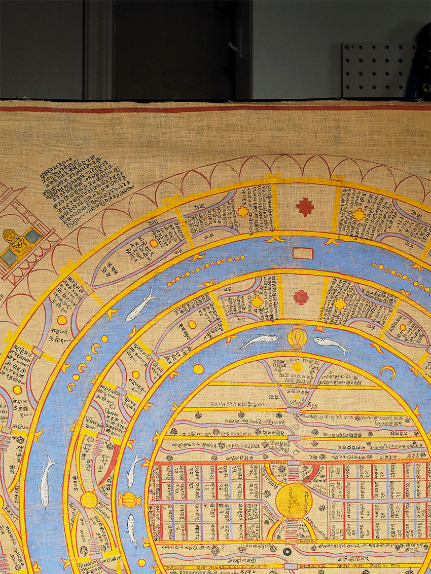 Jain Cosmic Diagram of the Universe. Purchased at Bonhams in the 1990's when deaccessioned from a wealthy foundation in Marin that was selling off a large collection of artifacts from a high level collection. Antique, though hard to date precisely,as it has been professionally cleaned, and these have been made in a similar way for a long time. Painted on hand spun cloth, the paint shows considerable wear, though the colors are bright and the images are clear. Probably 19/20thc. Size is large at approximately 42.5"x42.5". Would look amazing framed.