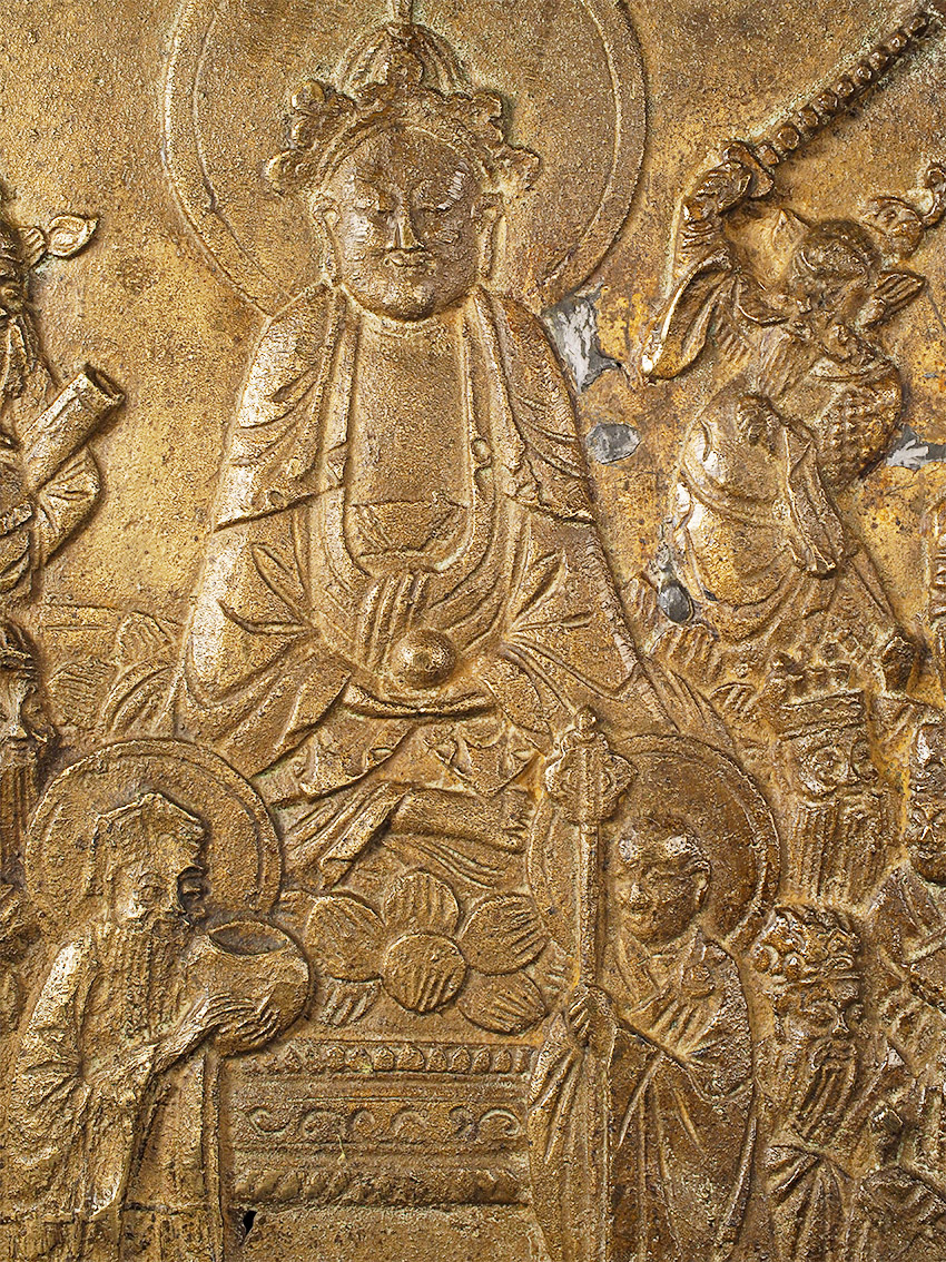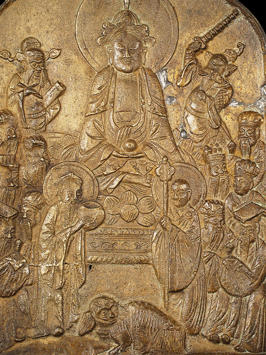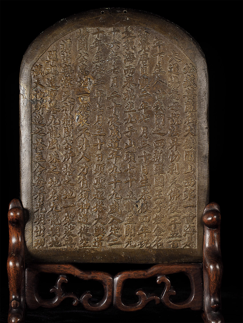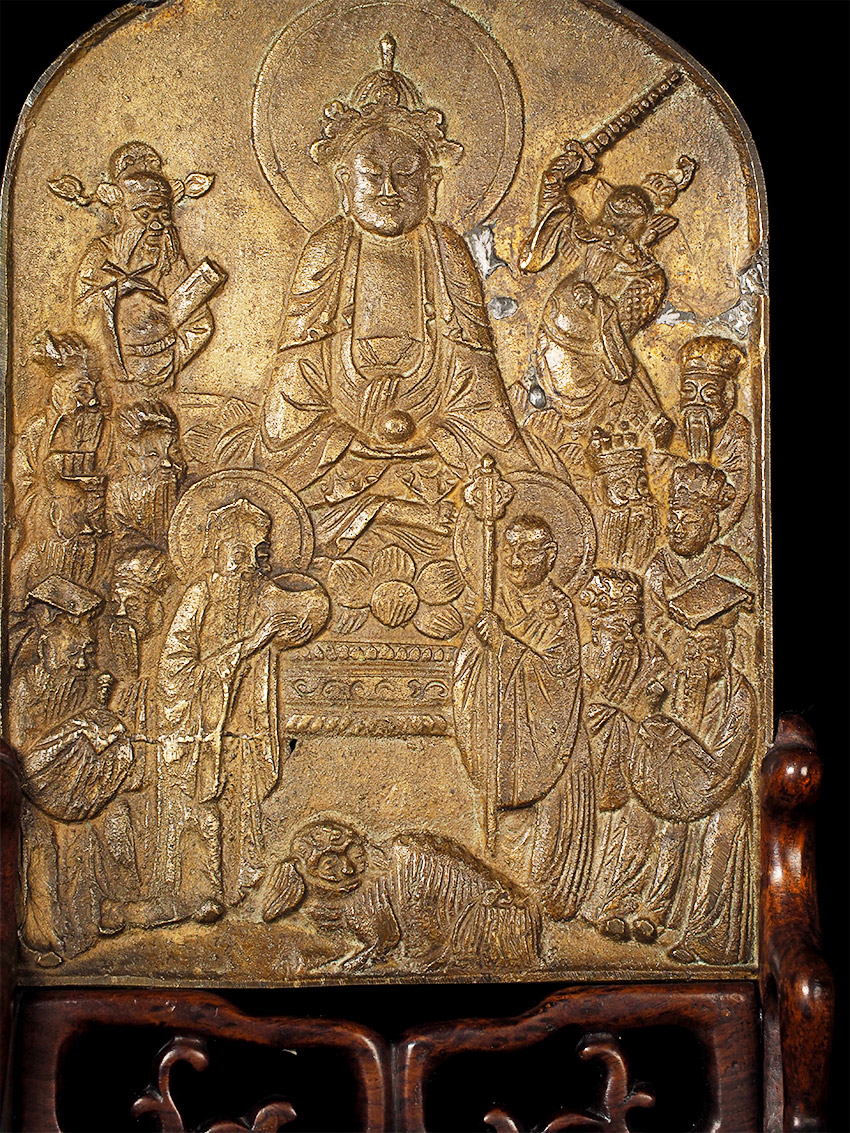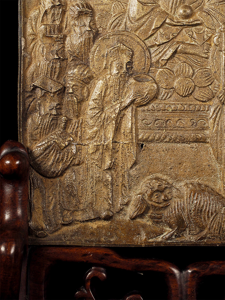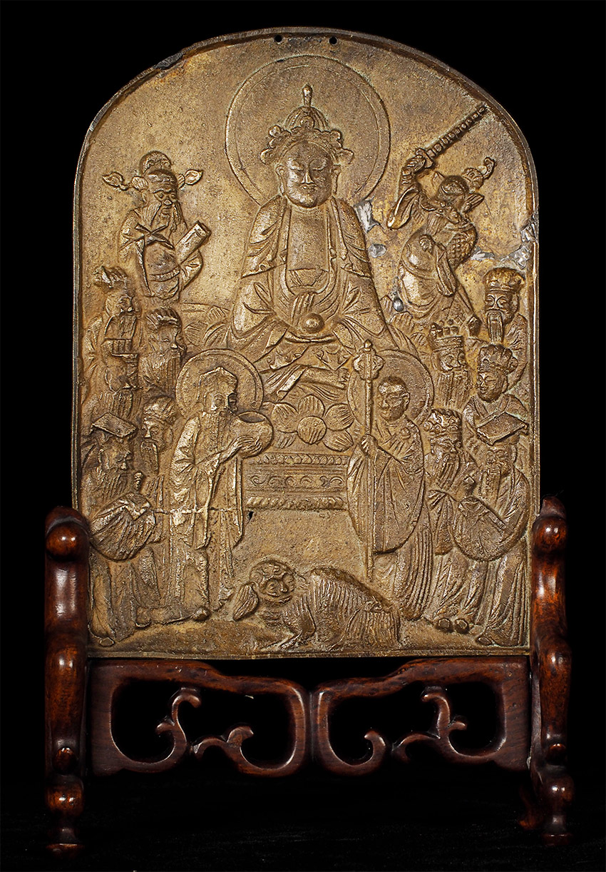 18/19th Chinese Cast Bronze Prayer with Religious scene on the back. Some original casting flaws repaired with lead. Beautiful custom stand. Very large example of its type at approximately 8.25" (at its highest point) x 6" and 10.5" tall on its stand.
