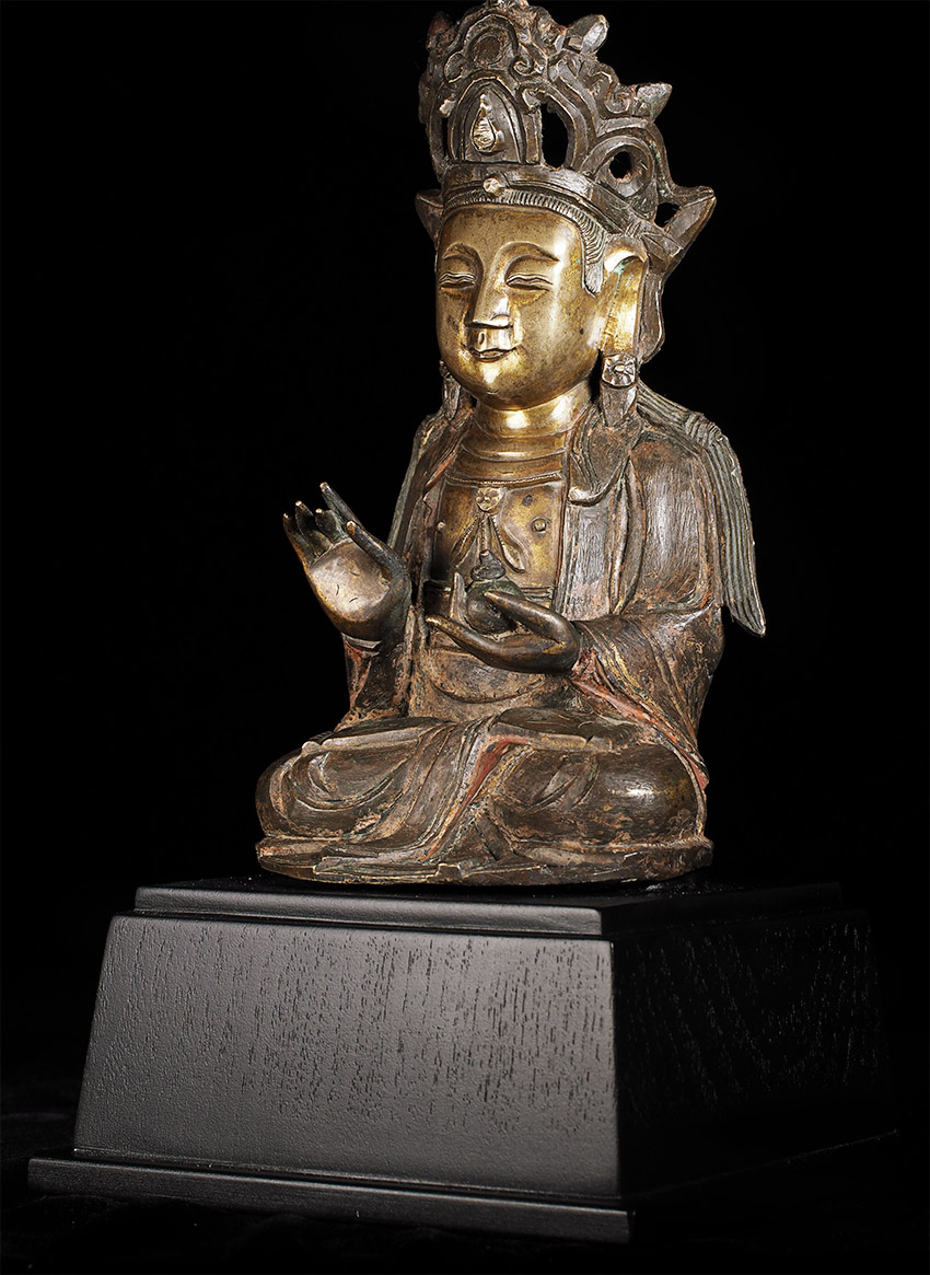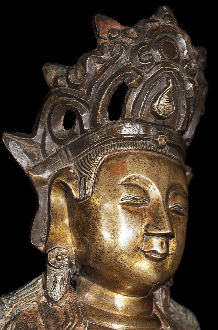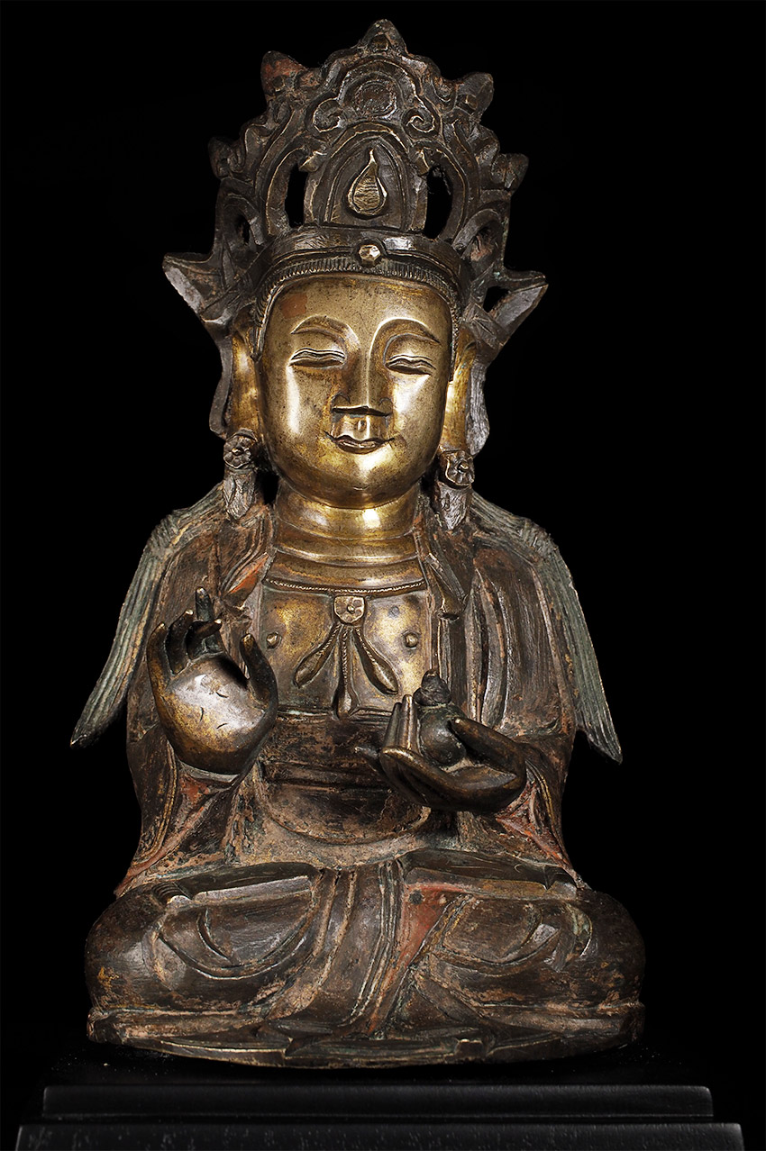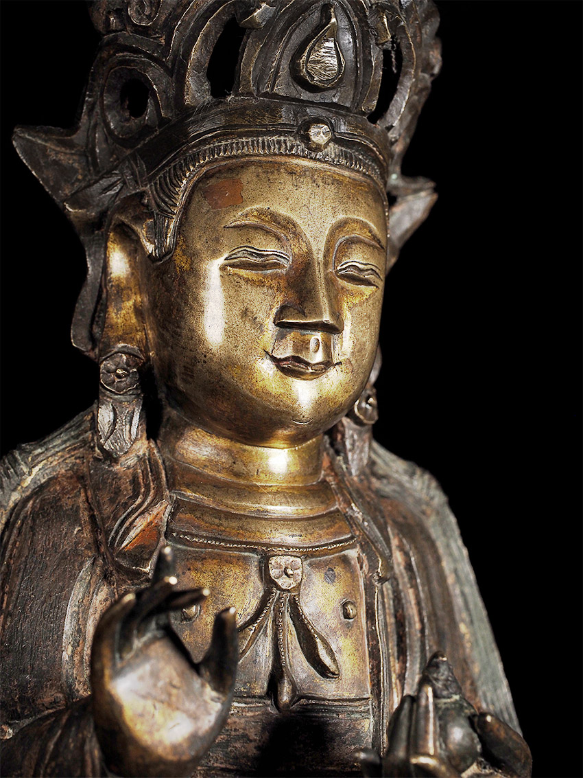 Incredible Ming Bronze Buddha is. Best of its type, with a supremely beautiful glass-like smooth face. Sits 8.25" tall and 11.25" on its custom base.The rest of the "skin" (and possible the entire piece) could/would have the same surface as the face if it were cleaned (including the hands)- I know this because when I got it the entire thing was thick with dirt and it had very little detail. I could tell there was a very finely cast figure underneath, and did what I rarely do, and cleaned it to its present level. I decided to only clean the face to its current level and leave the rest for the next person to decide- I only used a few bits of museum wax and soft brushes and q-tips to bring the to is current glass-sooth state. The gilding is the finest quality mercury gilding. Note that the face is not perfectly even, but that the sculptor took the time to make the expression more "realistic" and and alive by making the expression purposefully asymmetrical