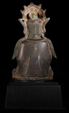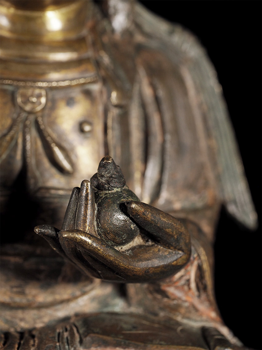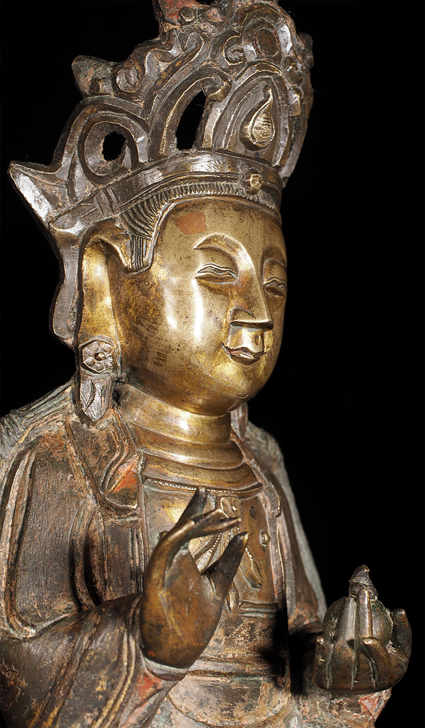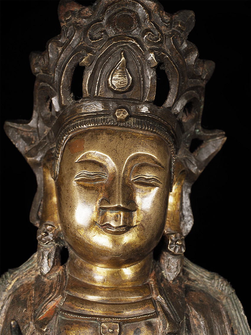 Incredible Ming Bronze Buddha is. Best of its type, with a supremely beautiful glass-like smooth face. Sits 8.25" tall and 11.25" on its custom base.The rest of the "skin" (and possible the entire piece) could/would have the same surface as the face if it were cleaned (including the hands)- I know this because when I got it the entire thing was thick with dirt and it had very little detail. I could tell there was a very finely cast figure underneath, and did what I rarely do, and cleaned it to its present level. I decided to only clean the face to its current level and leave the rest for the next person to decide- I only used a few bits of museum wax and soft brushes and q-tips to bring the to is current glass-sooth state. The gilding is the finest quality mercury gilding. Note that the face is not perfectly even, but that the sculptor took the time to make the expression more "realistic" and and alive by making the expression purposefully asymmetrical