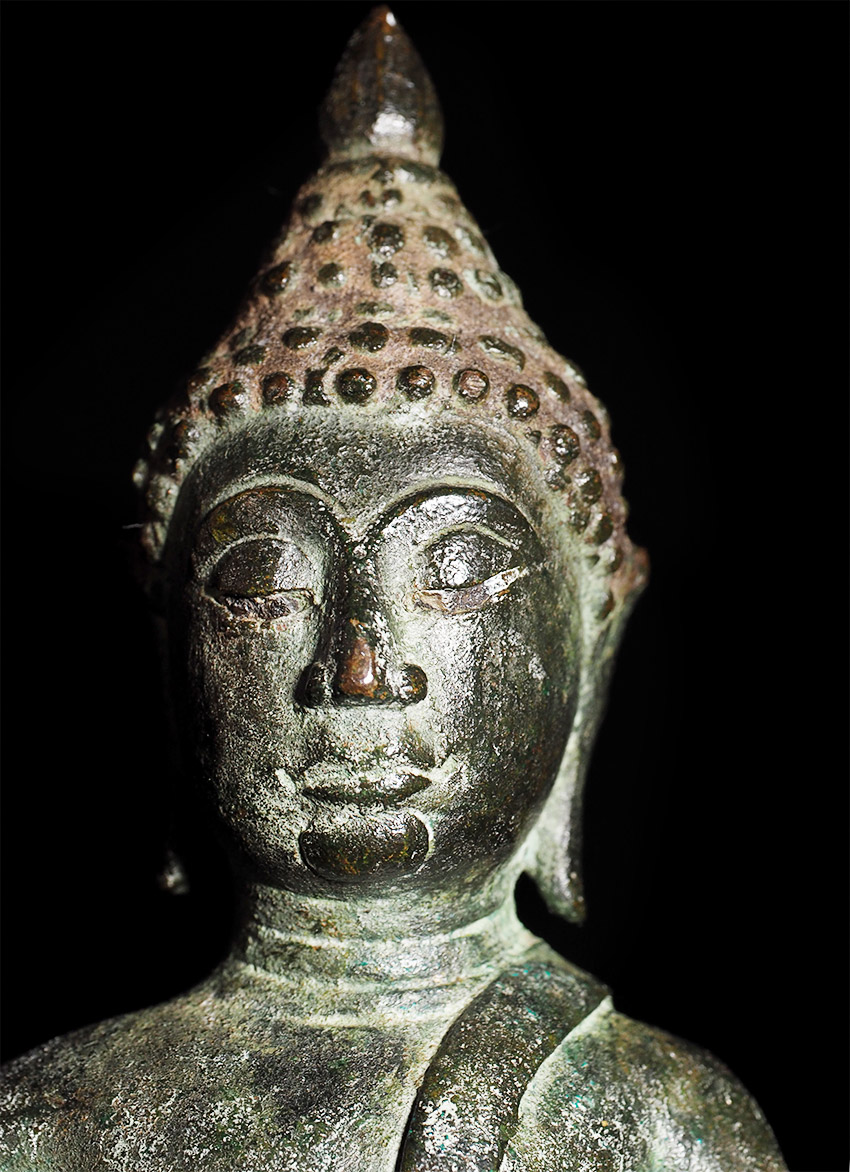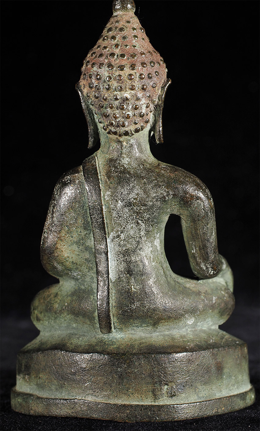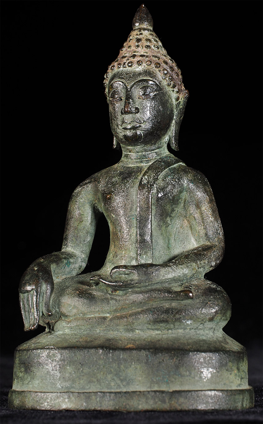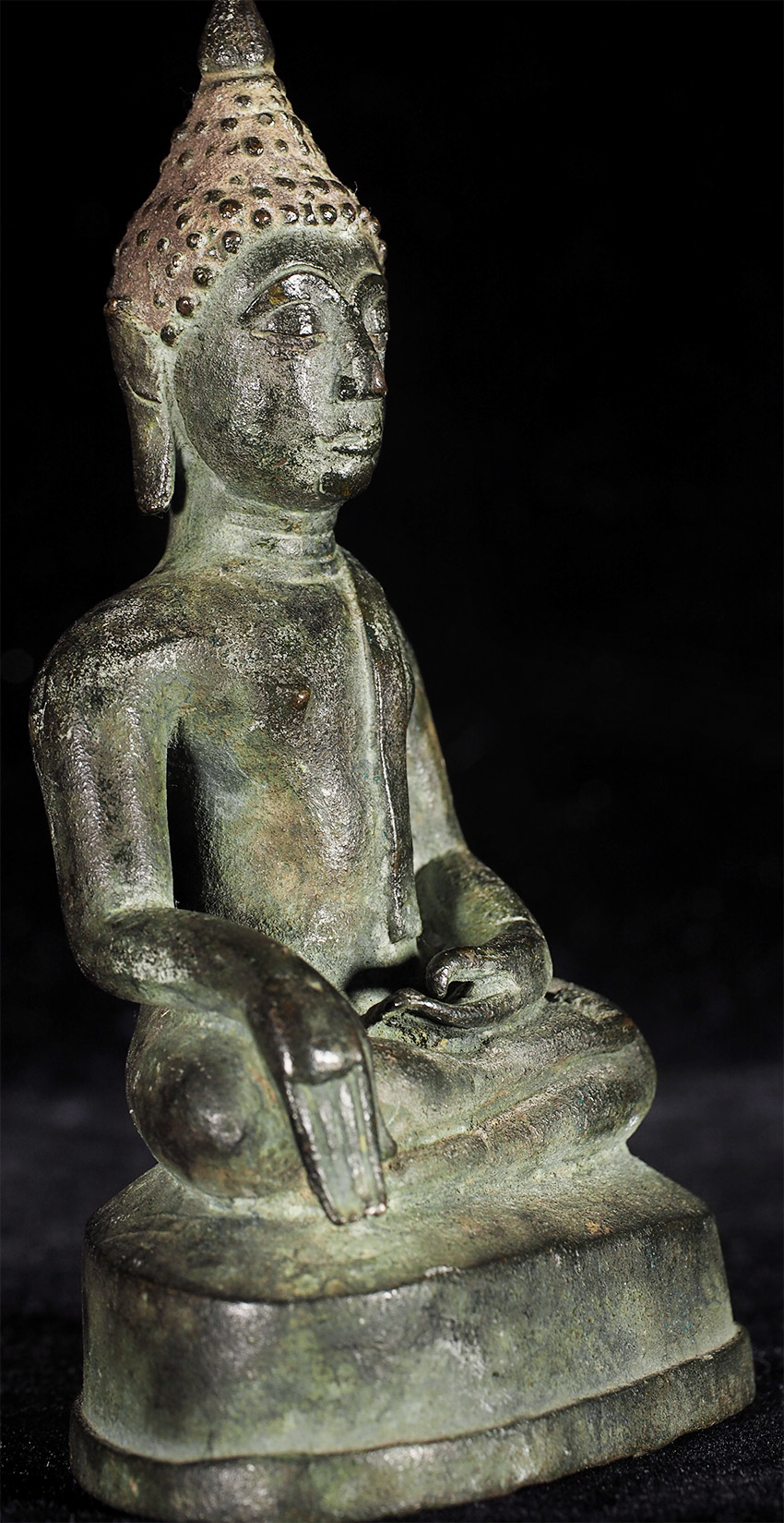 Excellent 15/16thC Northern Thai Bronze Buddha. Fine in every way- patina, casting, sculpting, finishing, patina, condition all first rate. This piece measures approximately 5.25" tall.