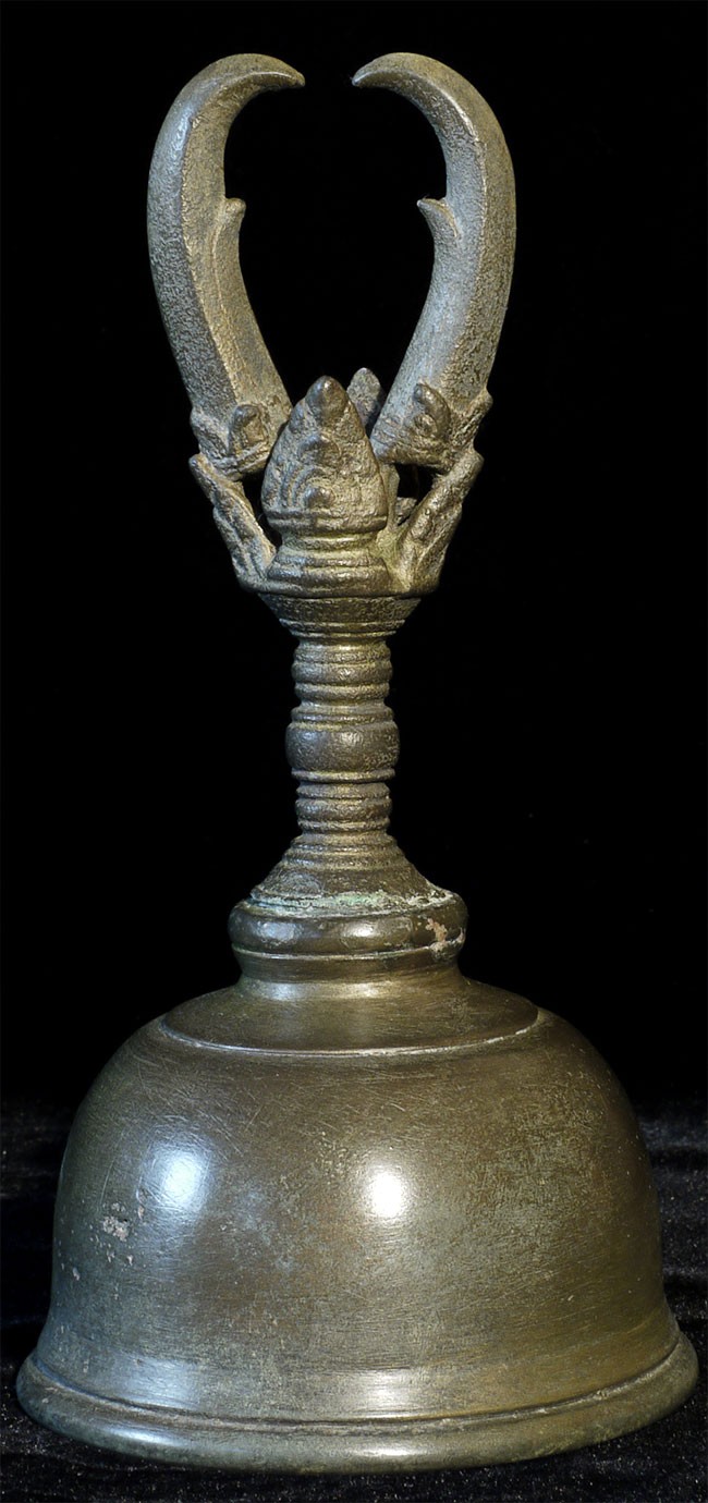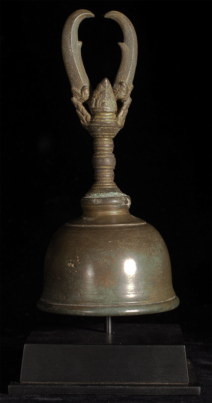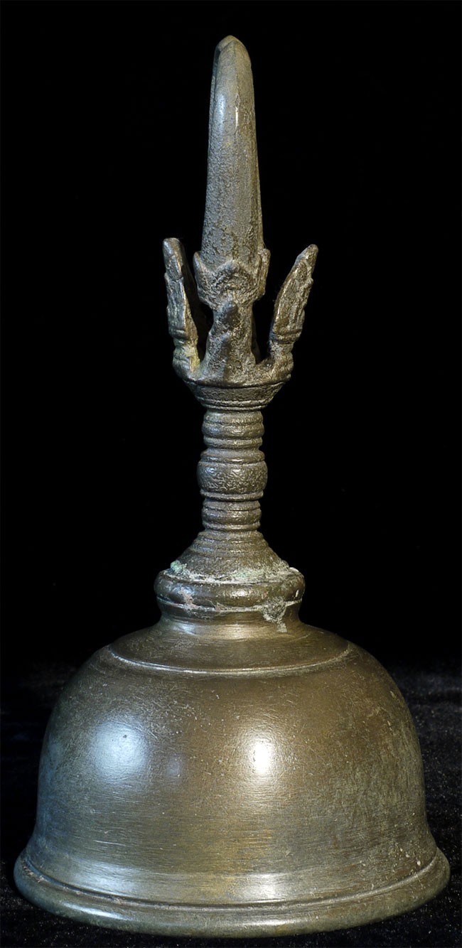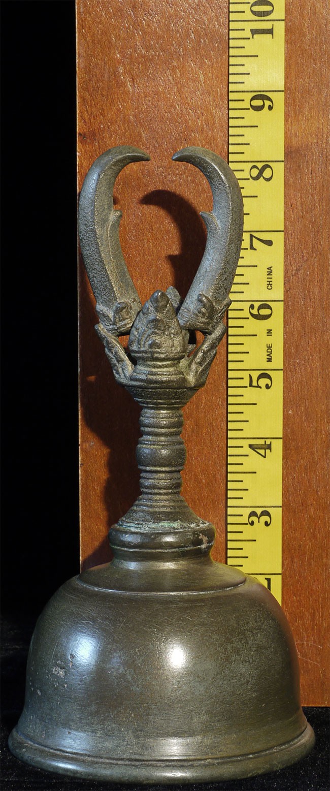 A large and superb 11-13thC Khmer bell. It measures 8 inches tall, 10.5 inches on its custom base, and a diameter of 4.25 inches. Bell and handle are different metals.