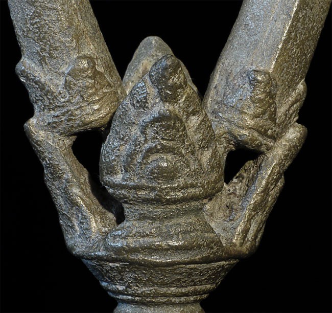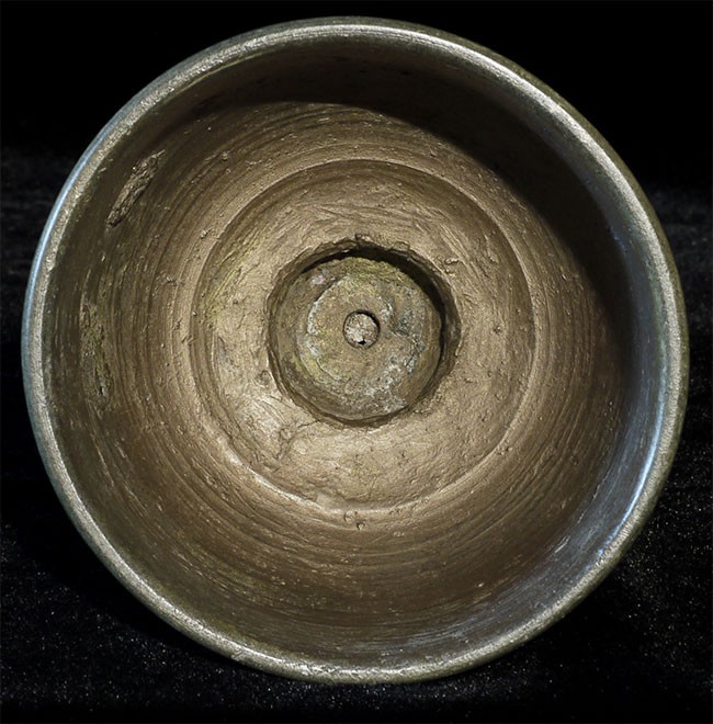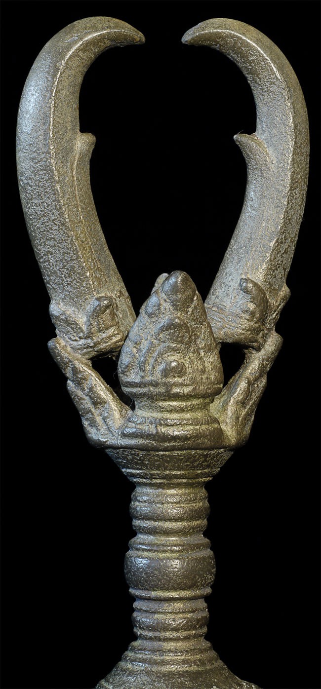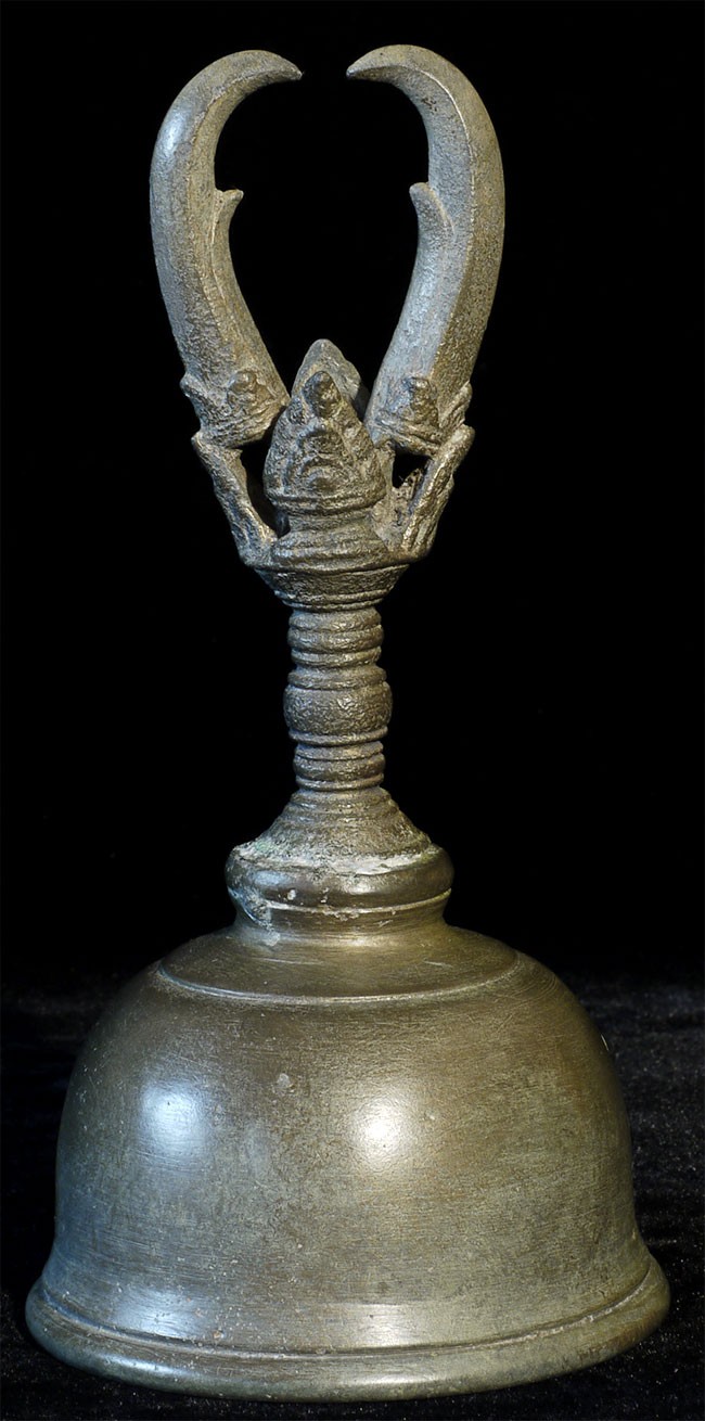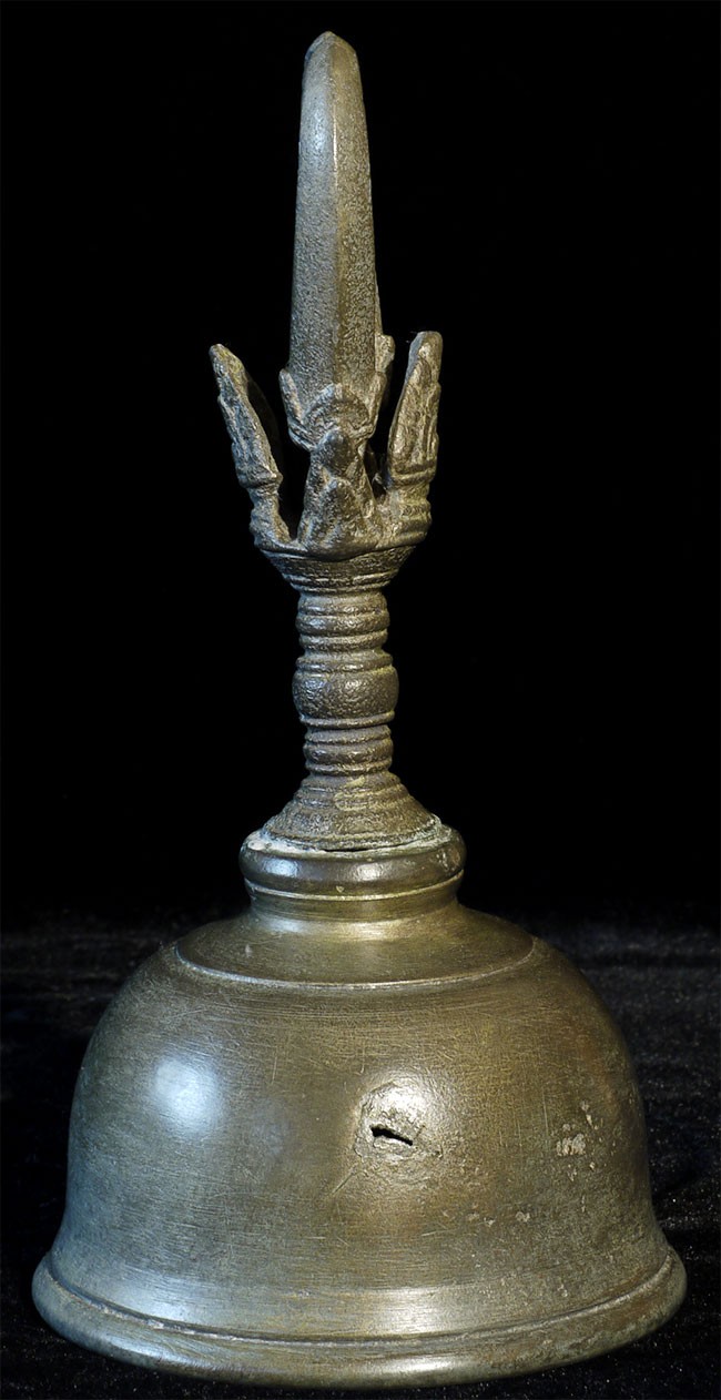 A large and superb 11-13thC Khmer bell. It measures 8 inches tall, 10.5 inches on its custom base, and a diameter of 4.25 inches. Bell and handle are different metals.