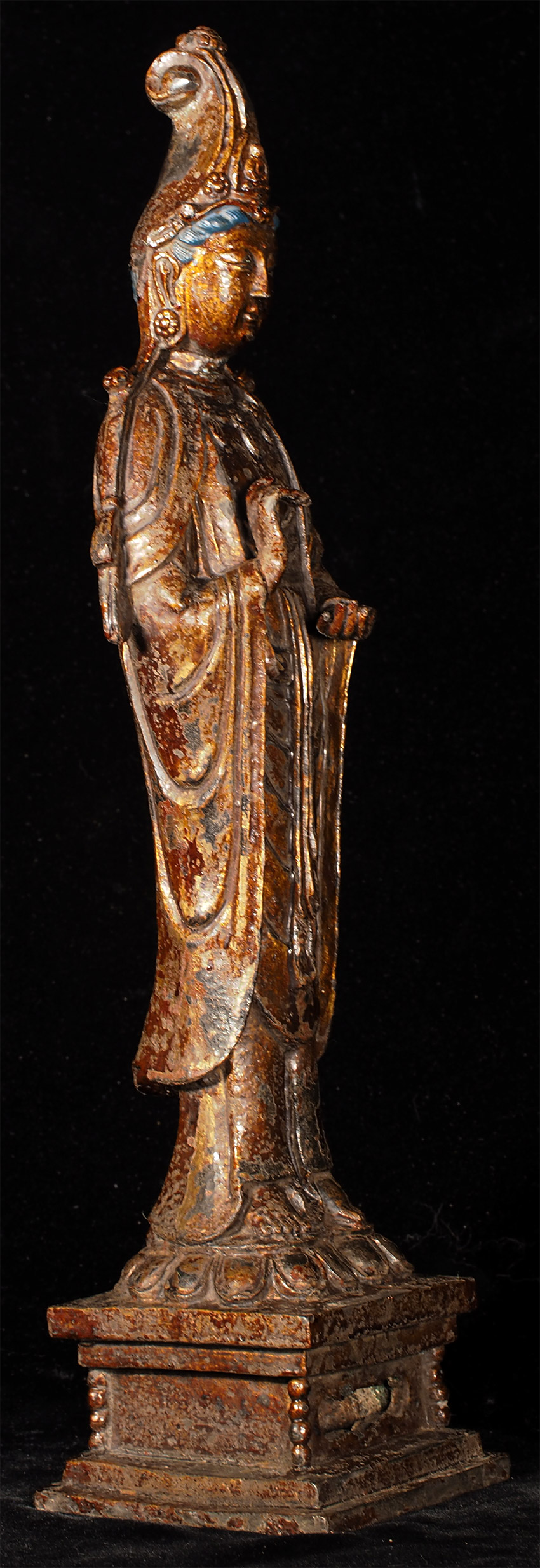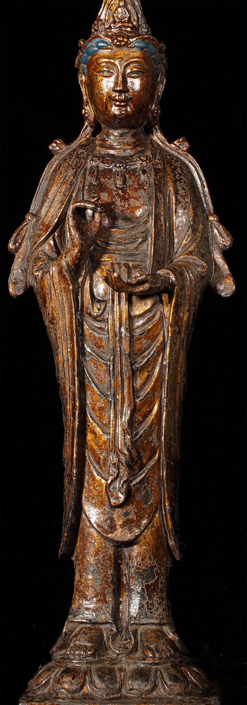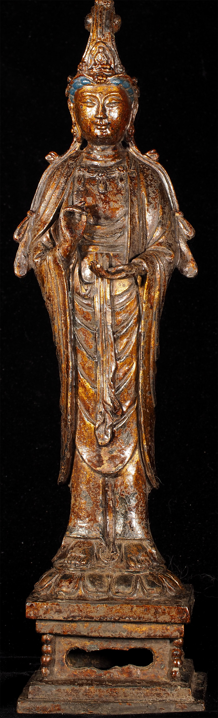 Lovely Chinese Liao style bronze Buddha. Probably early 20th century- hard to date. May have had losses painted over in the past. Well cast and finished- a beautifully decorative piece. Quite large and substantial at 14.5" tall (figure only) and 16.5" on its attached base. Graceful lines- the centerpoint of any room. The original Liao versions were typically 4 to 6 inches tall and solid cast. Only later emulations would ever be this large. This is the only one I've seen of this type.