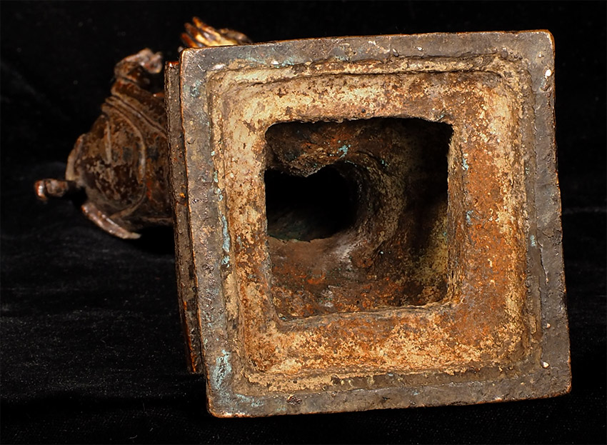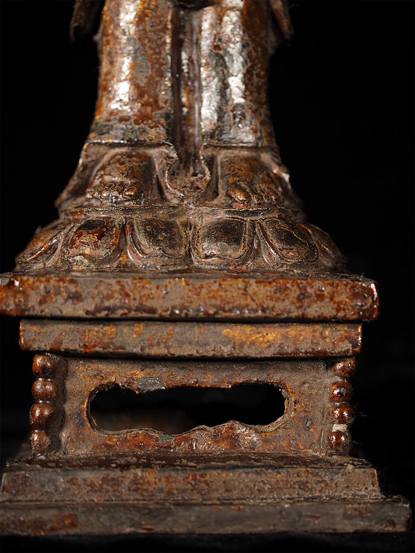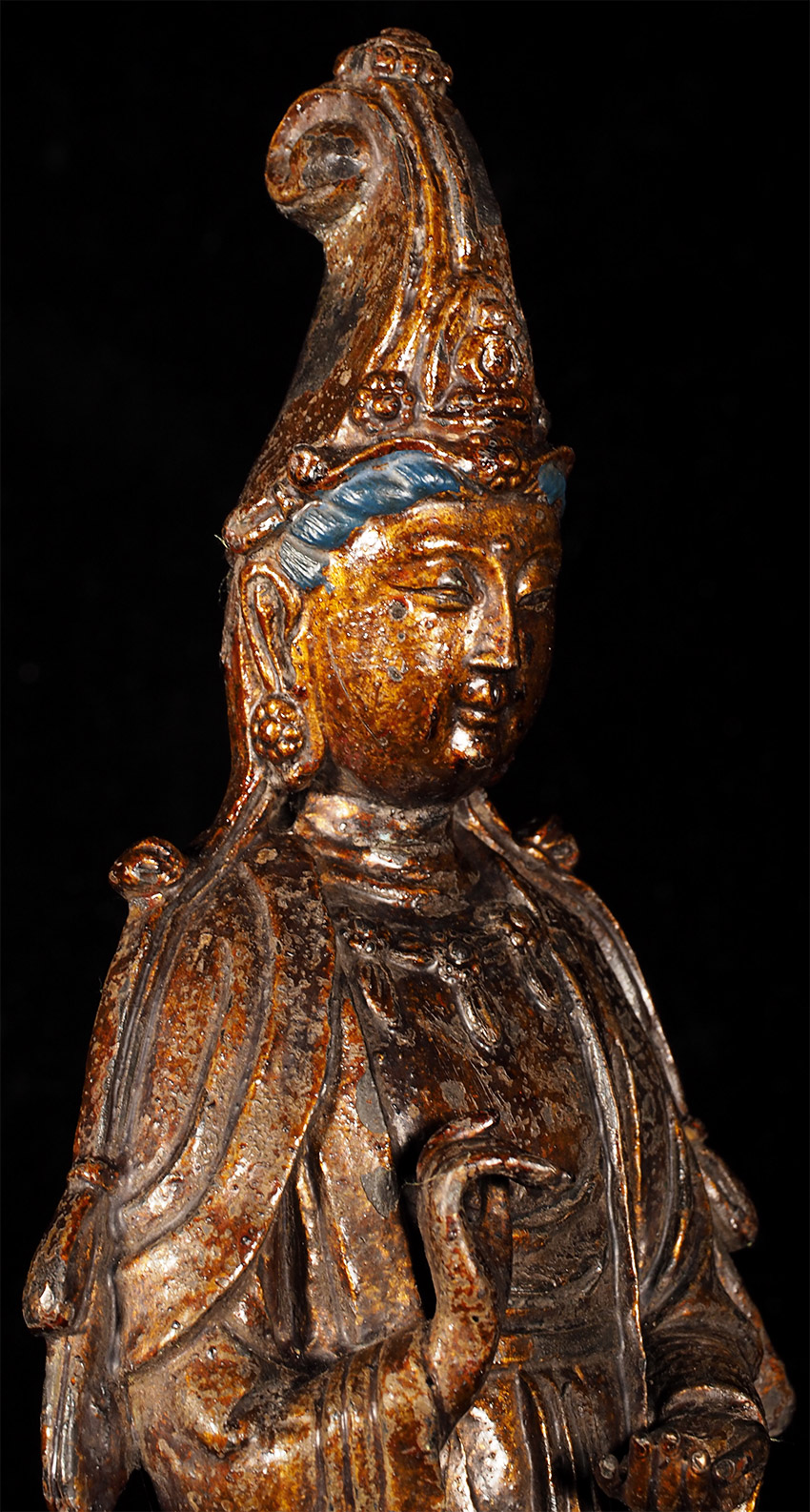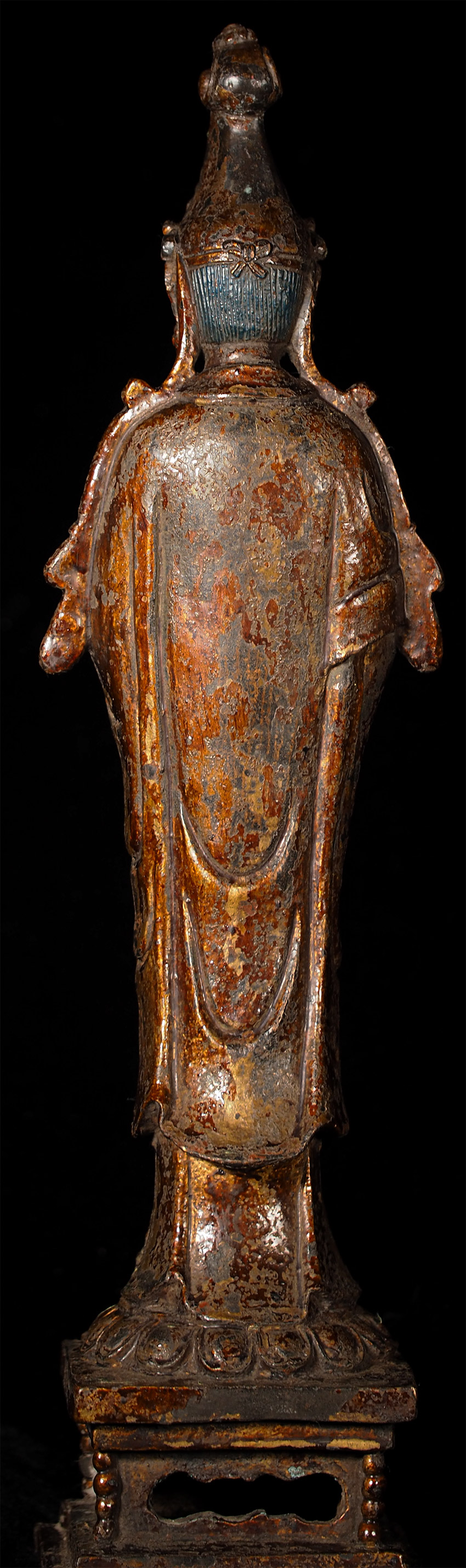 Lovely Chinese Liao style bronze Buddha. Probably early 20th century- hard to date. May have had losses painted over in the past. Well cast and finished- a beautifully decorative piece. Quite large and substantial at 14.5" tall (figure only) and 16.5" on its attached base. Graceful lines- the centerpoint of any room. The original Liao versions were typically 4 to 6 inches tall and solid cast. Only later emulations would ever be this large. This is the only one I've seen of this type.