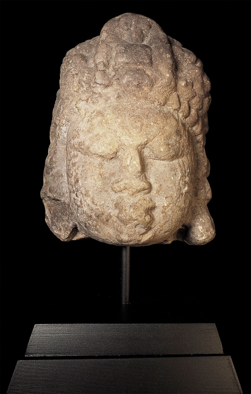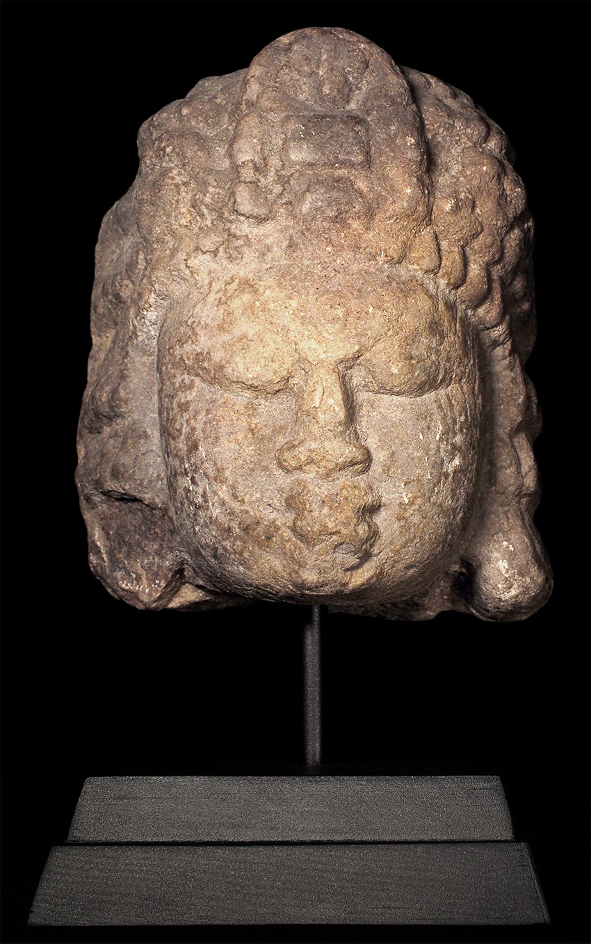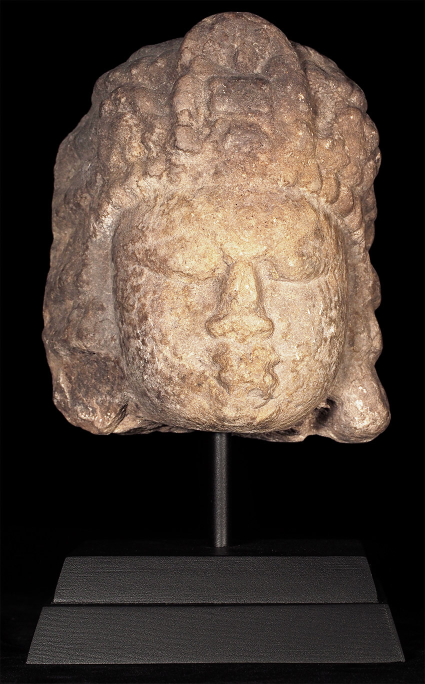 Superb Post-Gupta near-life-size 5-7th century stone head from a high level collector who donated much of his collection to the Cleveland Museum of Art in the 1980's. He did not have a paper trail that permitted him to donate this piece in the same tax credit on this piece, so I was able to purchase it in the early 1990's along with another remarkable stone piece. Shows expectable wear, but this only enhances his expressiveness and beauty. This is a high class piece of early sculpture- it almost seems alive. It radiates joy, peace, and happiness in a way that only great spiritual art manages to convey. The photos are only partially successful at showing the true beauty of this piece, as the patina and surface are so complex. This piece looks far more beautiful in person- as good as the pieces in the high end auctions. The actual head is close to 8" x 6.5" x 4.45", and is quite heavy. On its custom base, it stands at 11.5" tall at its highest point. It somehow seems much larger than the dimensions convey.