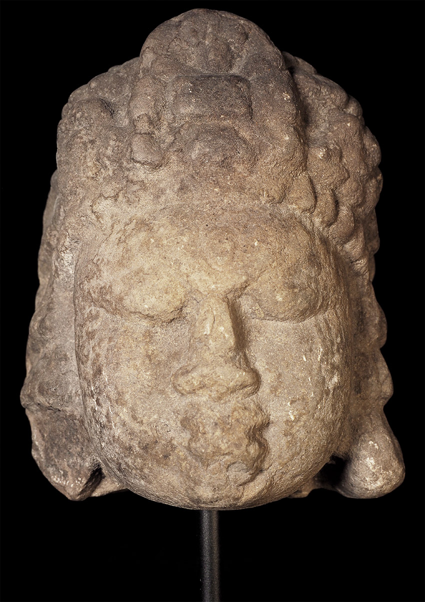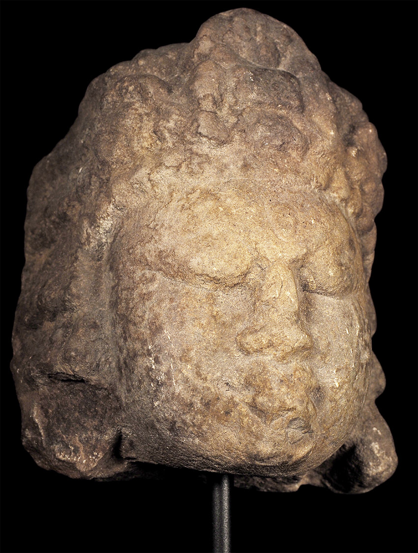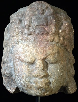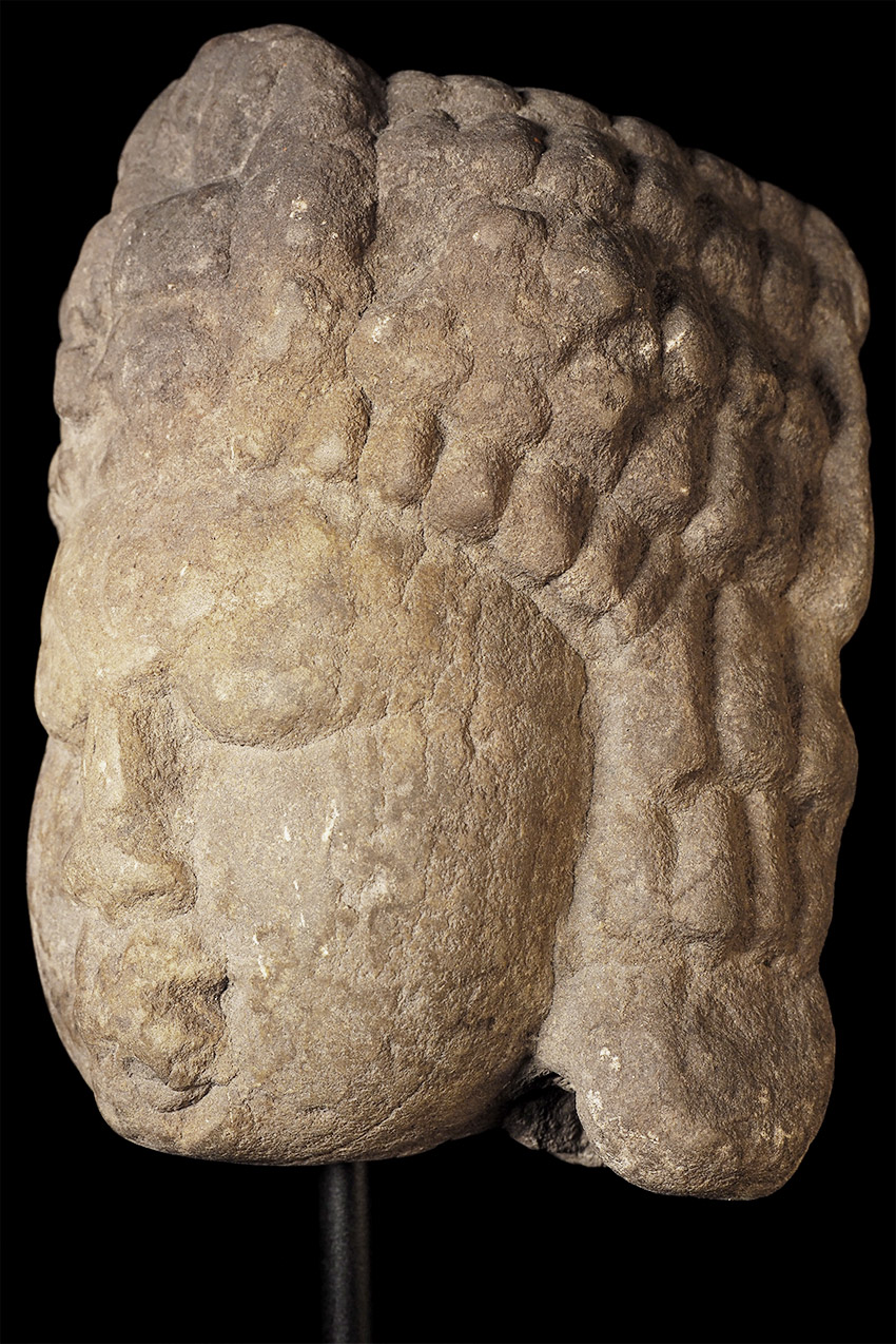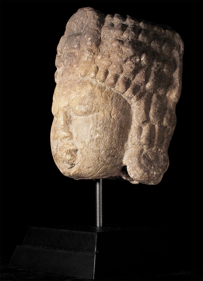 Superb Post-Gupta near-life-size 5-7th century stone head from a high level collector who donated much of his collection to the Cleveland Museum of Art in the 1980's. He did not have a paper trail that permitted him to donate this piece in the same tax credit on this piece, so I was able to purchase it in the early 1990's along with another remarkable stone piece. Shows expectable wear, but this only enhances his expressiveness and beauty. This is a high class piece of early sculpture- it almost seems alive. It radiates joy, peace, and happiness in a way that only great spiritual art manages to convey. The photos are only partially successful at showing the true beauty of this piece, as the patina and surface are so complex. This piece looks far more beautiful in person- as good as the pieces in the high end auctions. The actual head is close to 8" x 6.5" x 4.45", and is quite heavy. On its custom base, it stands at 11.5" tall at its highest point. It somehow seems much larger than the dimensions convey.