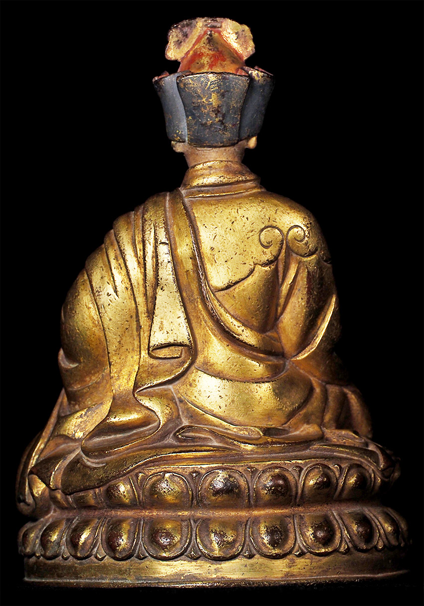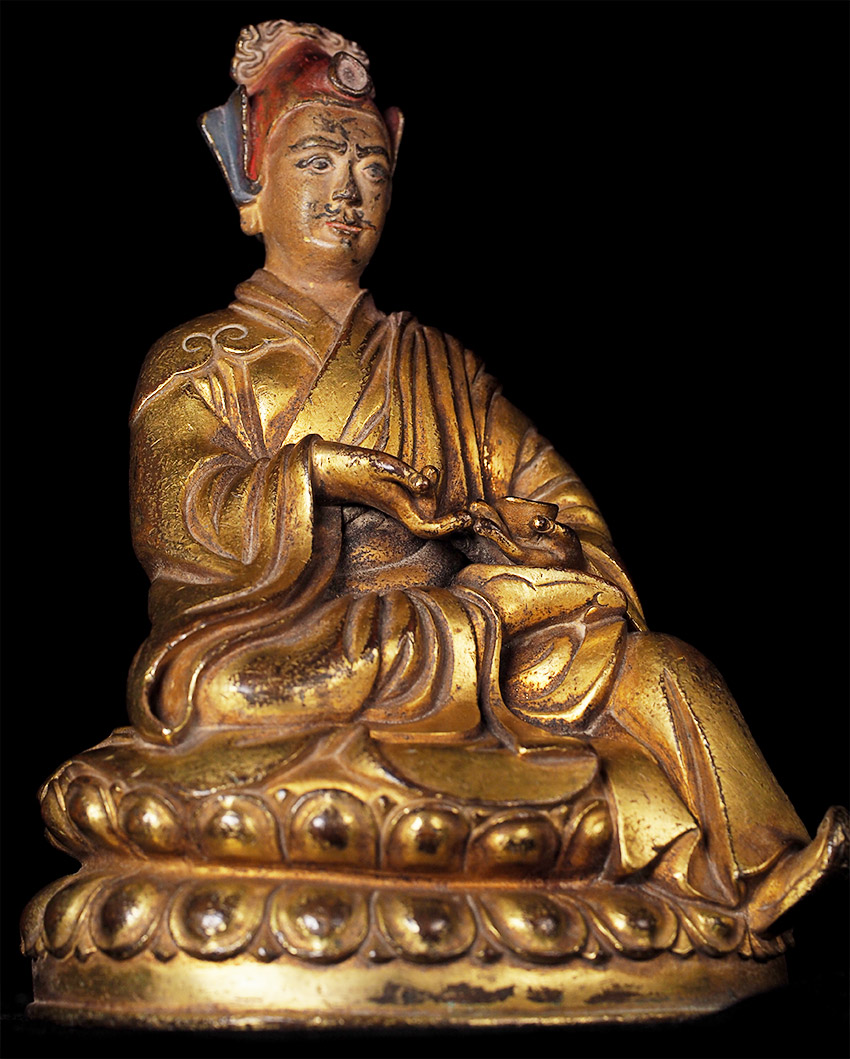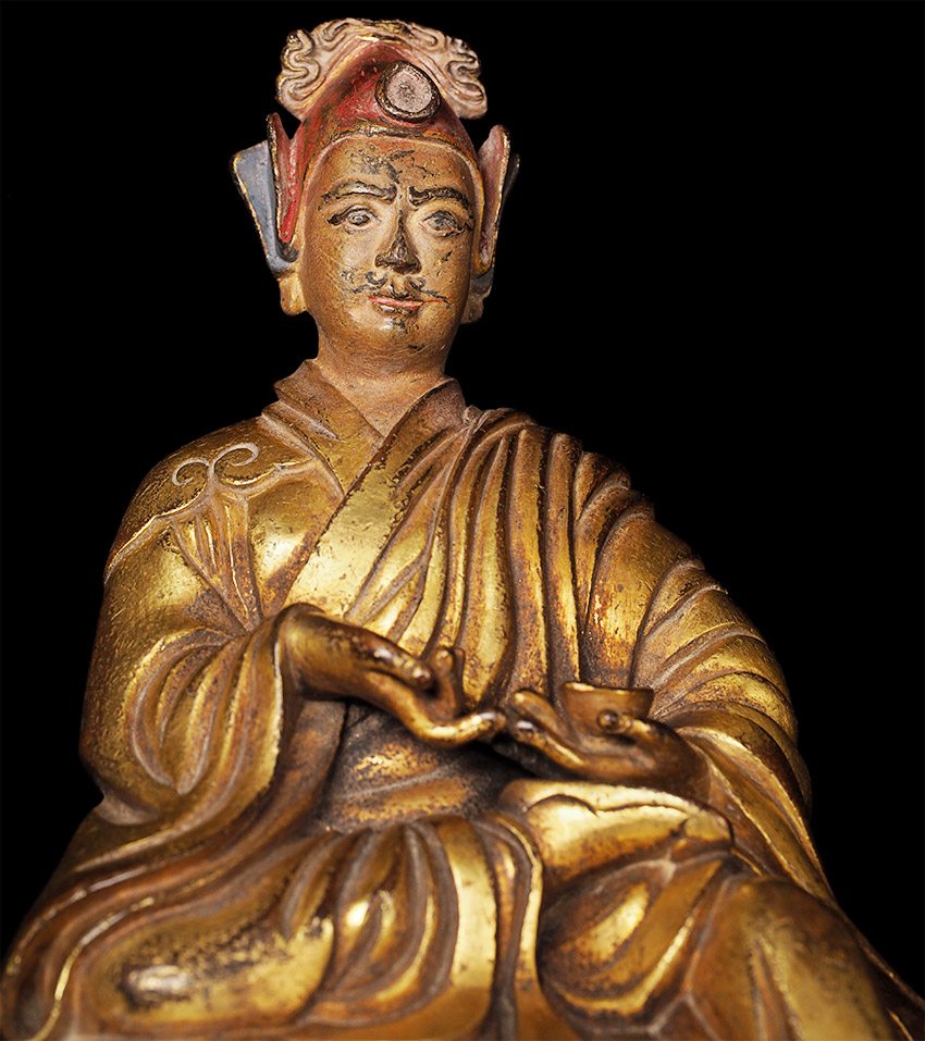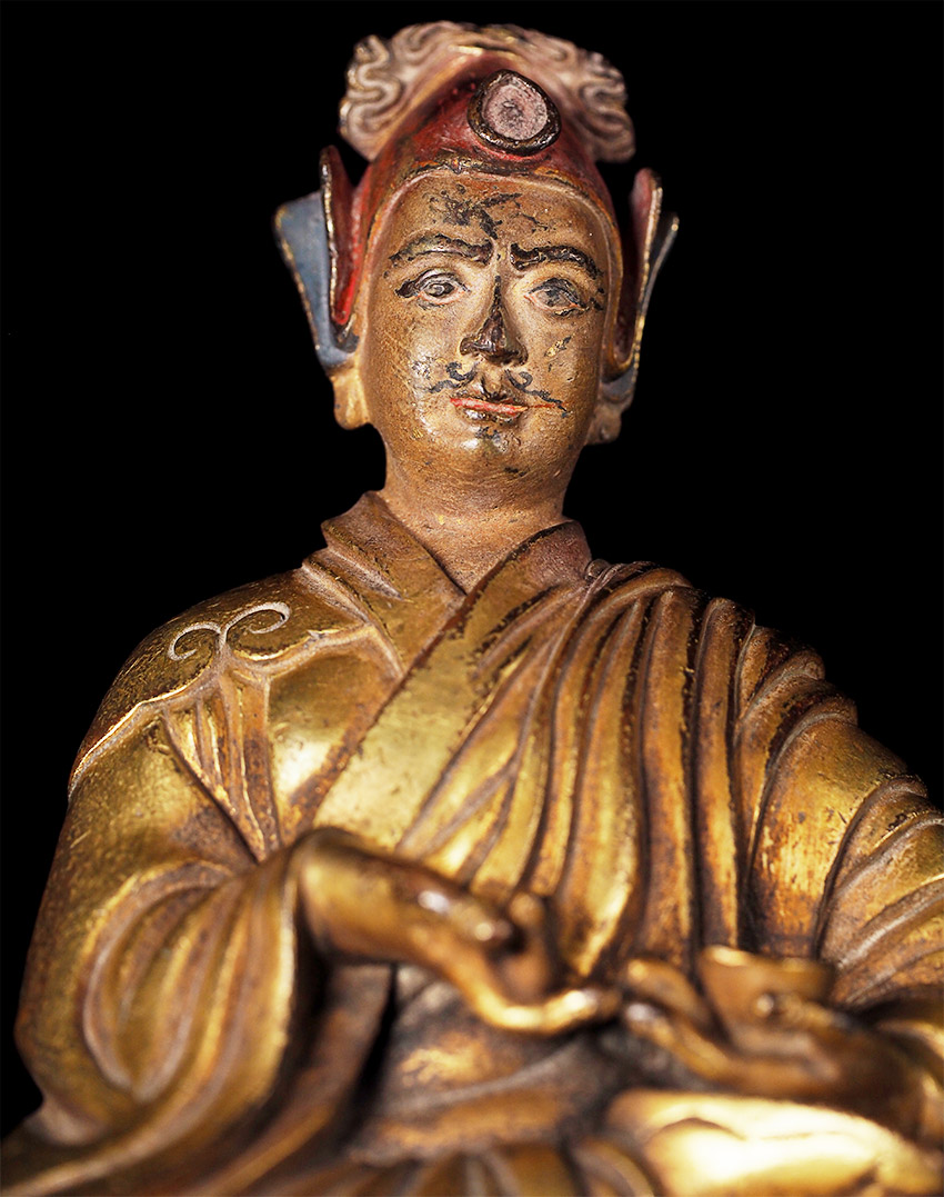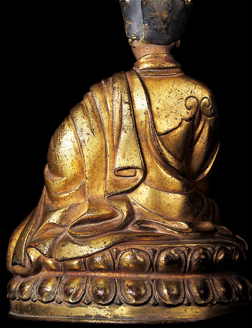 Materpiece Tibetan Bronze Portrait Sculpture. Look at the photos to see the incredible finesse in the robes- the sculpting and casting iis amazing. Note the amzing way the lotus base is "soft"-almost like a cushion. Looks to have good age- unsure how to date-likely several hundred years old. Measures 7" tall.
