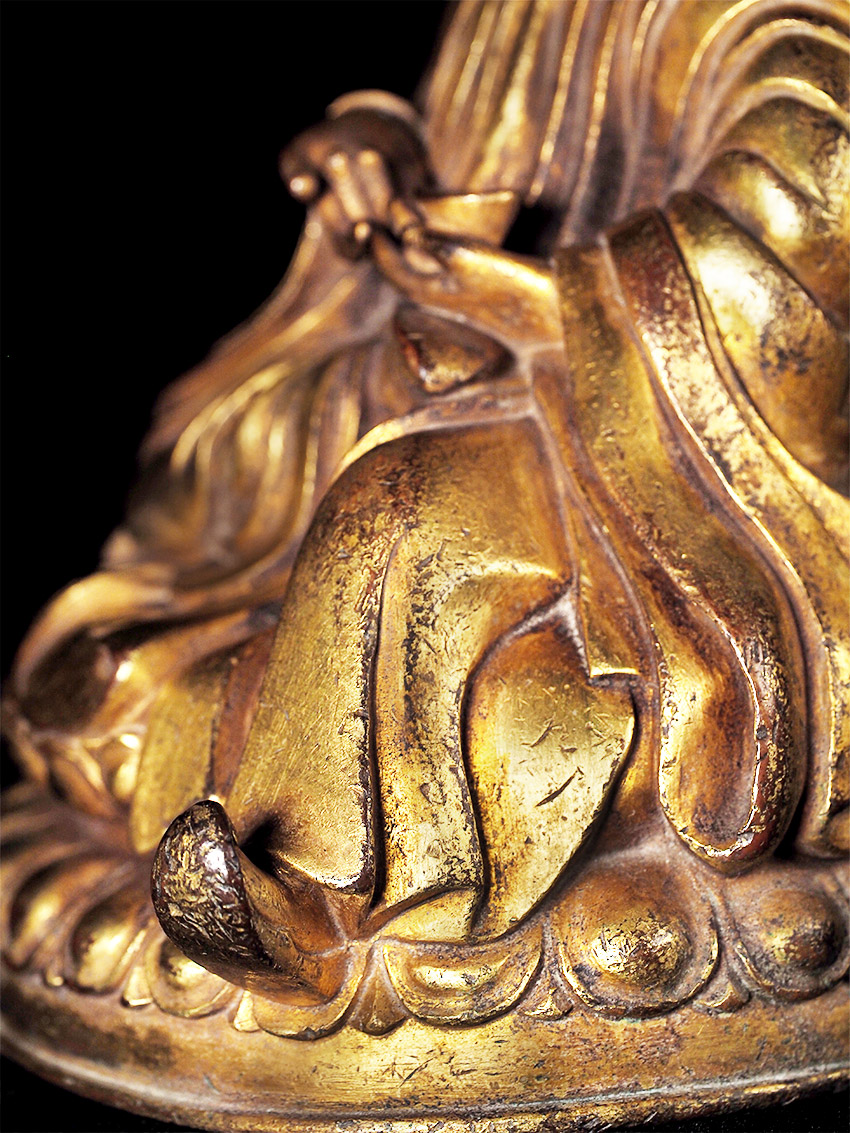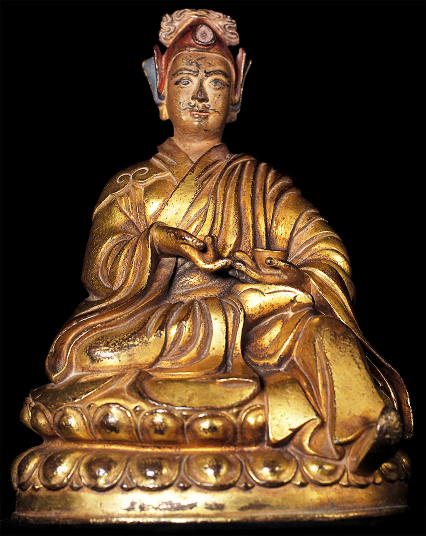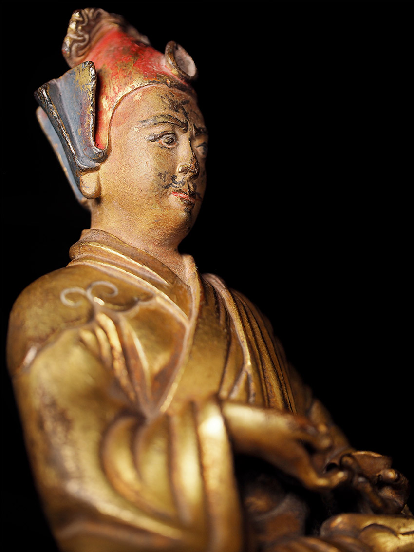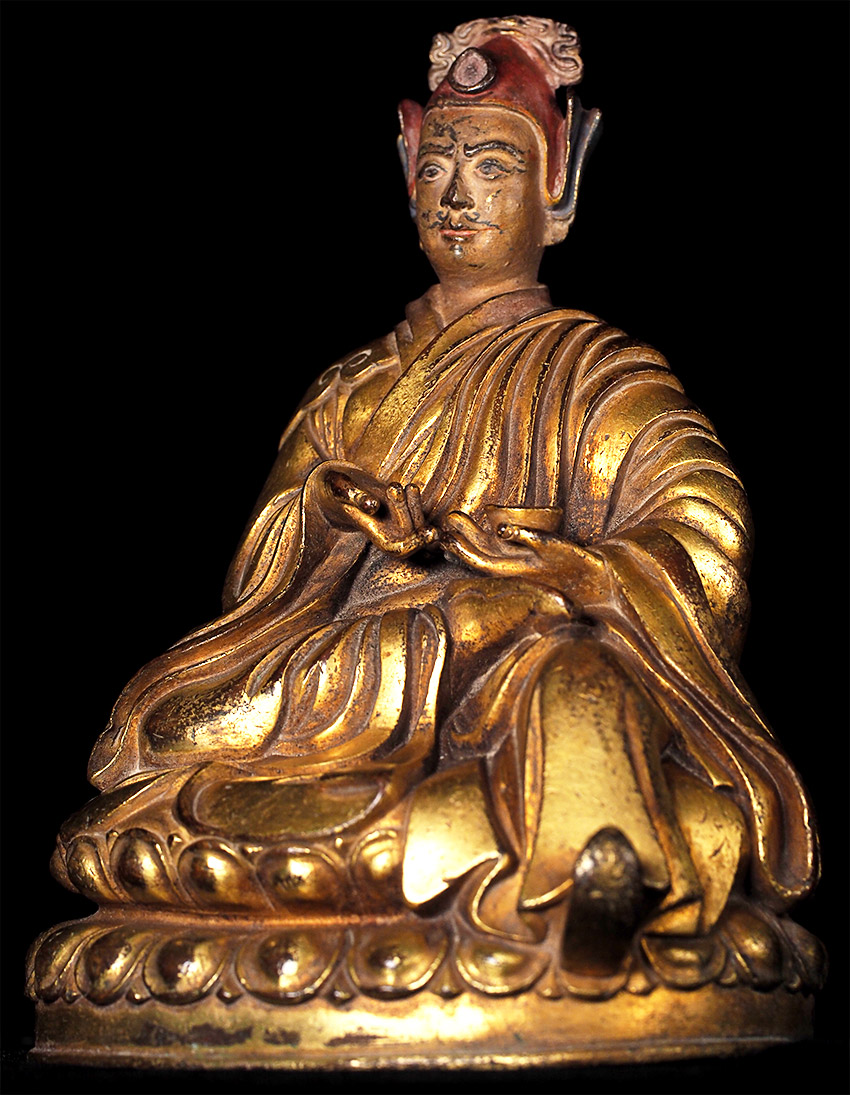 Materpiece Tibetan Bronze Portrait Sculpture. Look at the photos to see the incredible finesse in the robes- the sculpting and casting iis amazing. Note the amzing way the lotus base is "soft"-almost like a cushion. Looks to have good age- unsure how to date-likely several hundred years old. Measures 7" tall.