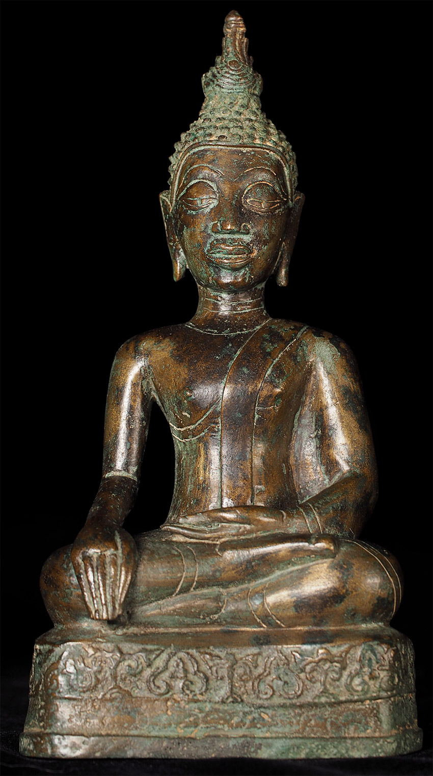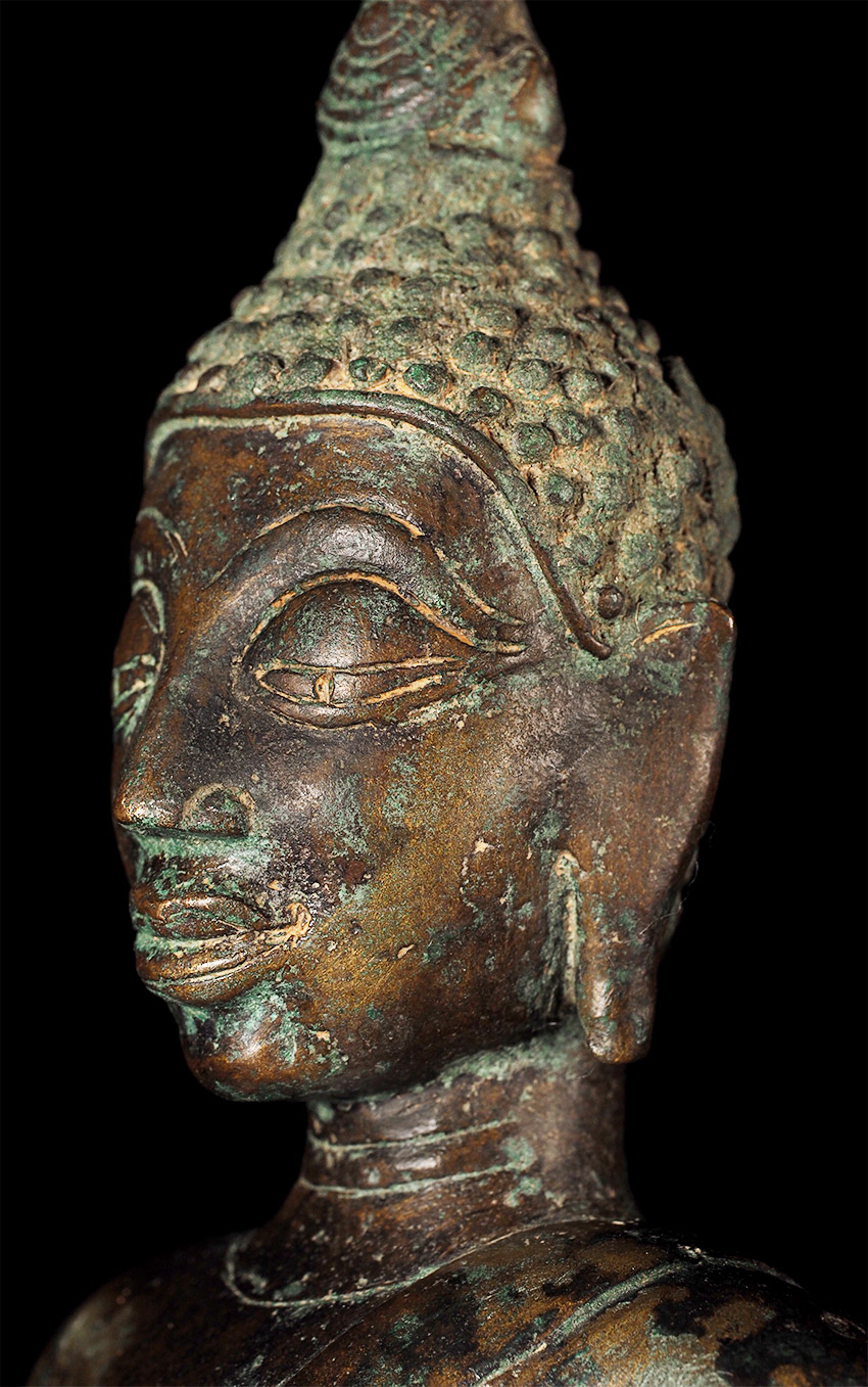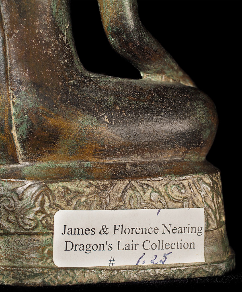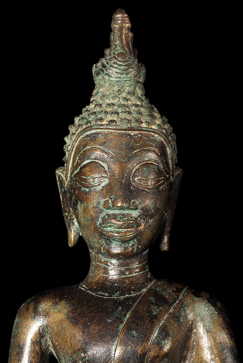 Authentic 15thC Fang (Northern Thai) Buddha. Very distinctive type, with its detailed finial, long neck, big eyes which originally had black stone pupils, and distinctive body shape. This Buddha is exceptional in the beautiful design on the base. I've seen this type of design on a few other examples, but it was not as well executed as on this one. This piece measures at 8 5/8", which is larger than the majority of its type that are typically 25% smaller in size. The patina is in the process of changing into what the Thai's refer to as a "green skin", which means the minerals are leeching out of the metal and causing the surface to change from brown to green, literally from the inside-out. Old collection sticker on the back, as shown in one photo.