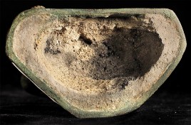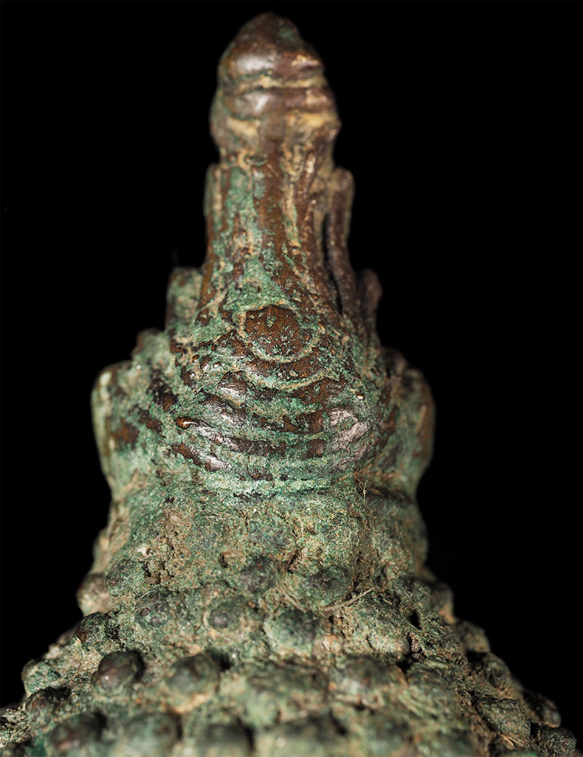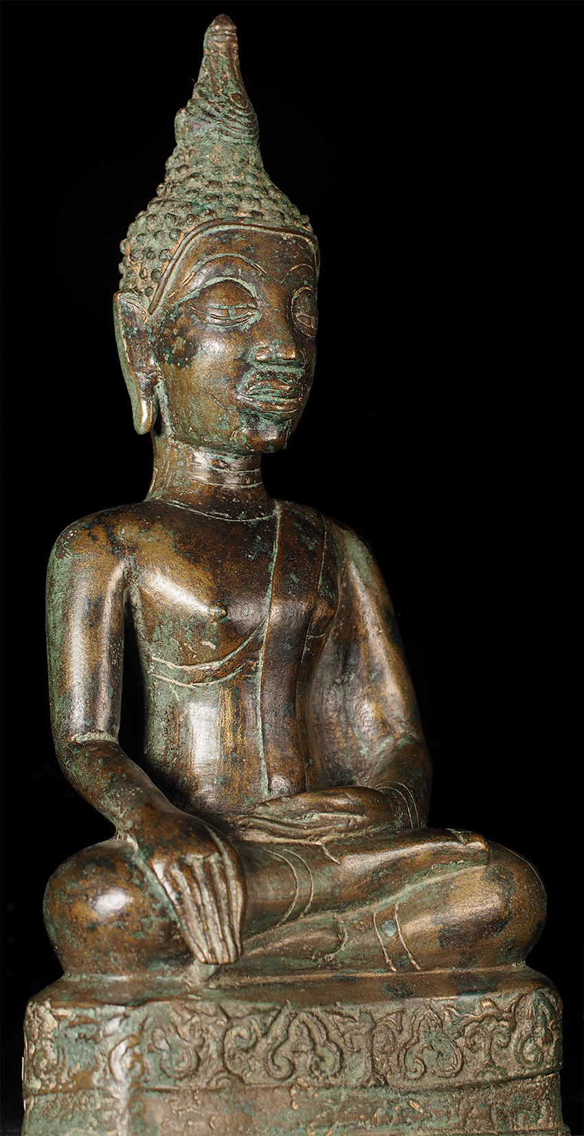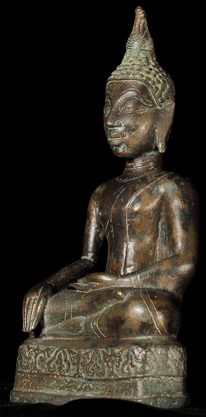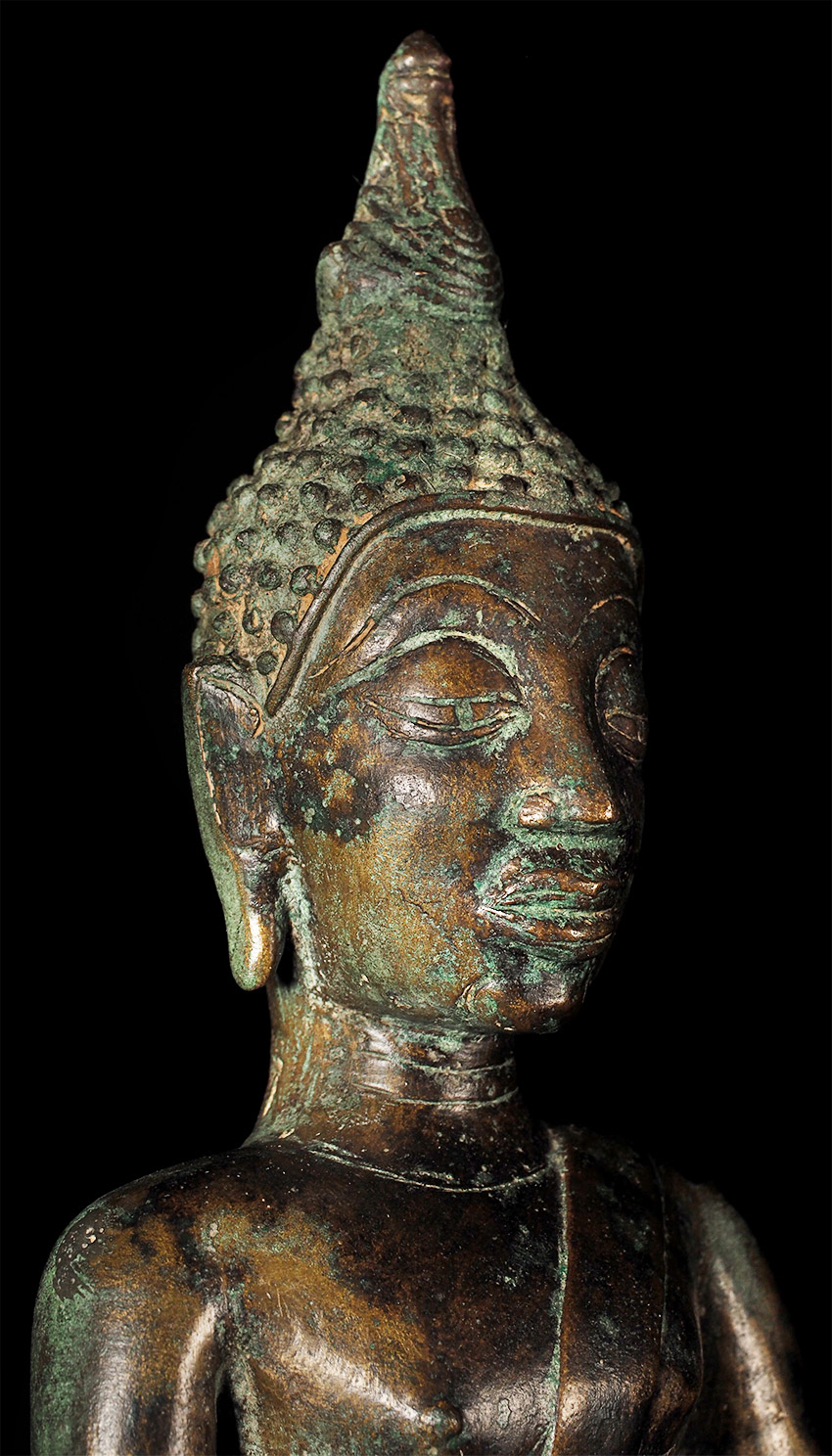 Authentic 15thC Fang (Northern Thai) Buddha. Very distinctive type, with its detailed finial, long neck, big eyes which originally had black stone pupils, and distinctive body shape. This Buddha is exceptional in the beautiful design on the base. I've seen this type of design on a few other examples, but it was not as well executed as on this one. This piece measures at 8 5/8", which is larger than the majority of its type that are typically 25% smaller in size. The patina is in the process of changing into what the Thai's refer to as a "green skin", which means the minerals are leeching out of the metal and causing the surface to change from brown to green, literally from the inside-out. Old collection sticker on the back, as shown in one photo.