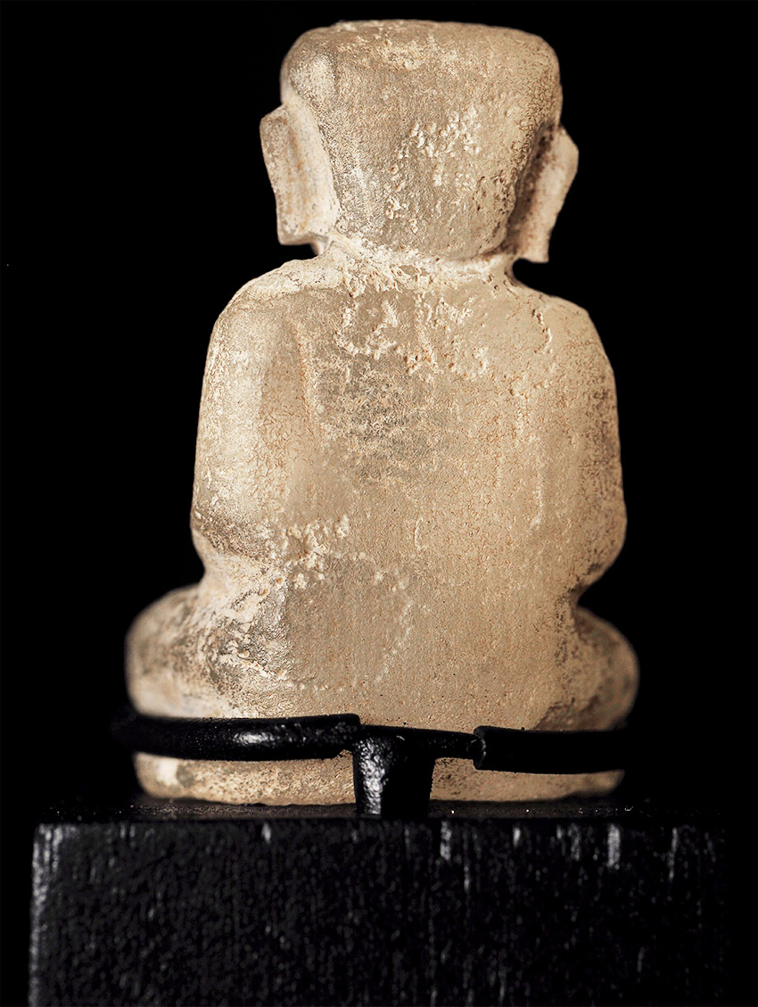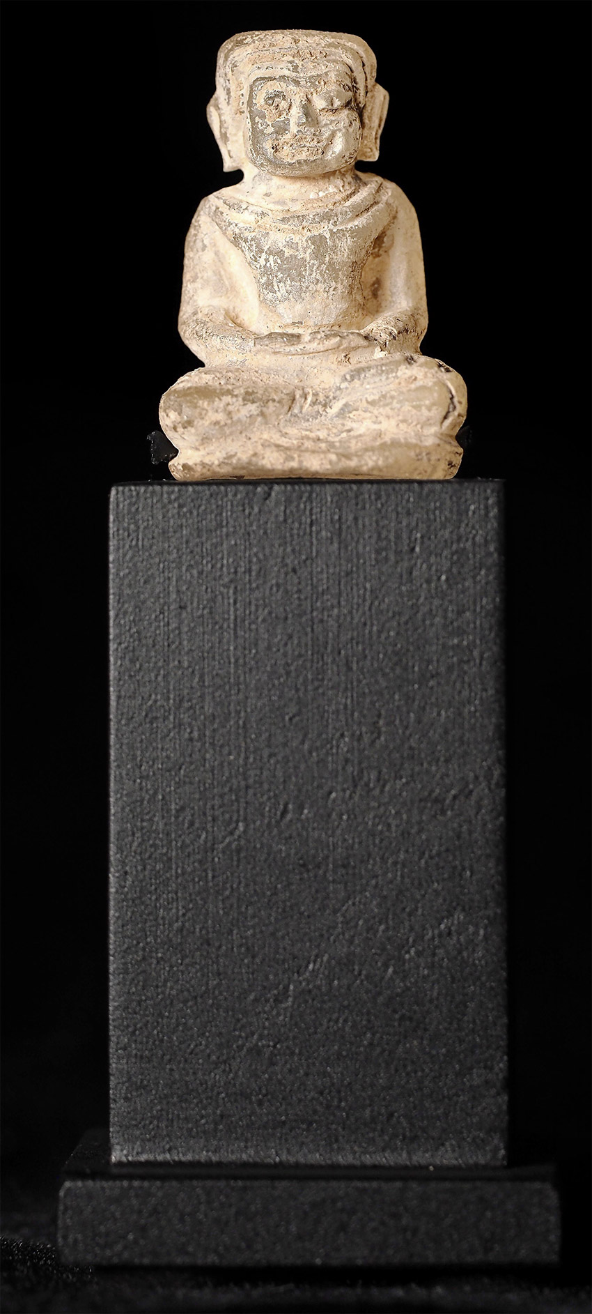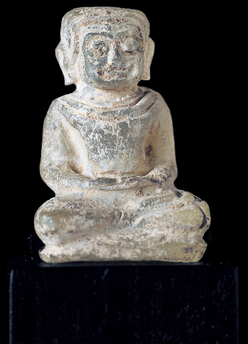 Scarce Haripunchai style glass Buddha from the 12/13th century. This type is generally in stucco or stone and occasionally in bronze. This is one of only two glass ones I've seen in over 25 years of searching, and the other was not made of this special, very heavy, distinctive glass and did not have such a compelling face. It is also the oldest Thai glass Buddha I have seen by at least 100+ years. Sits 1 3/8" tall and 3 3/8" on its custom base. Beautifully carved and in excellent condition. This kind of glass reportedly has precious metal mixed into it, so it develops a patina as it reacts with the soil during long burial. You will never see another. Could probably be cleaned to bring out a much clearer face and other features, but I've not wanted to touch it(I bought it from a farmer in 1987 who dug it up in the jungle in the 1960s near Lamphun, Thailand, which was the site of the old center of the ancient Haripunchai Kingdom)Domestic shipping is included, and international shipping is $50, including packing and insurance to anywhere in the world.
