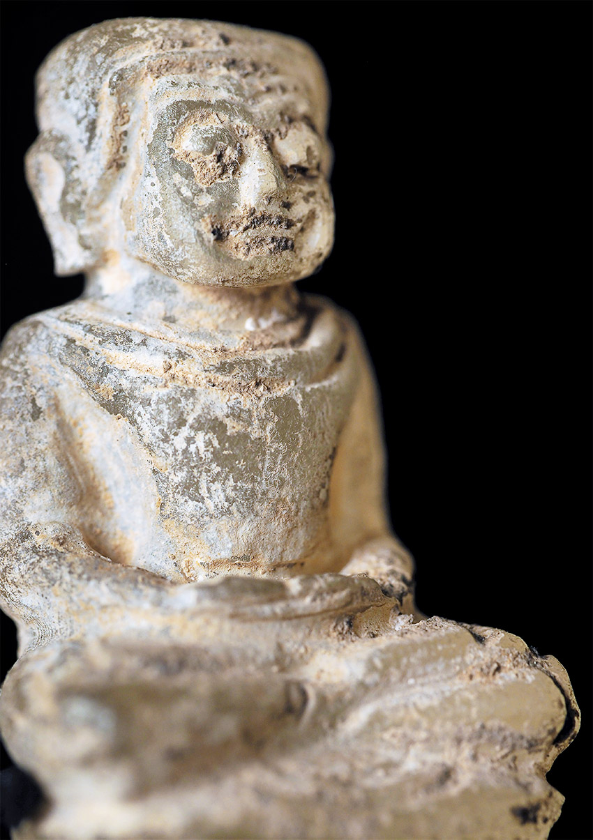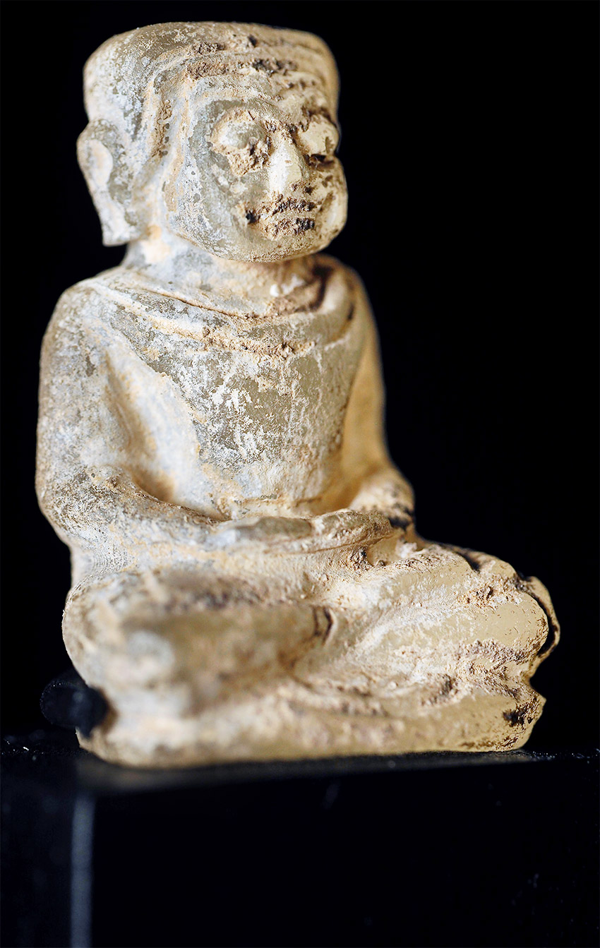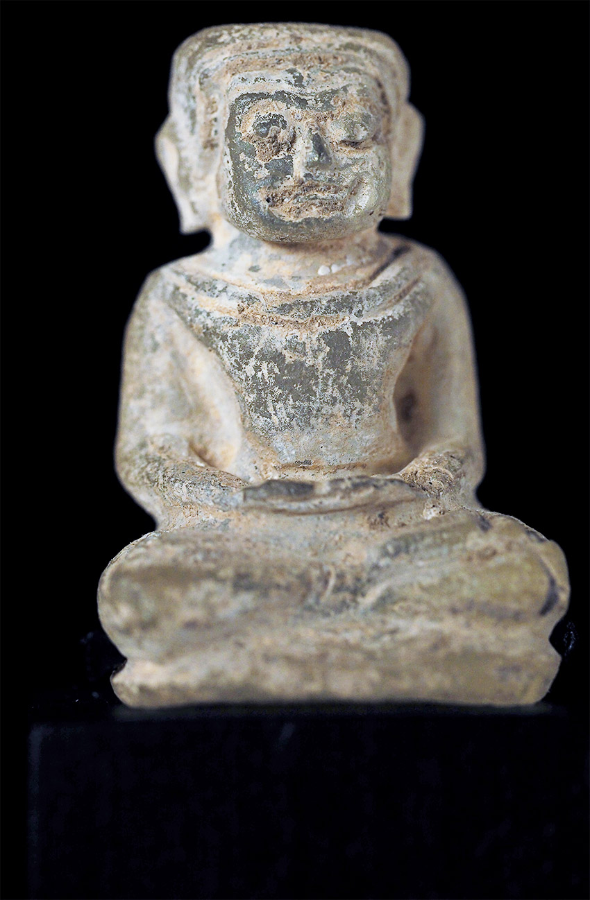 Scarce Haripunchai style glass Buddha from the 12/13th century. This type is generally in stucco or stone and occasionally in bronze. This is one of only two glass ones I've seen in over 25 years of searching, and the other was not made of this special, very heavy, distinctive glass and did not have such a compelling face. It is also the oldest Thai glass Buddha I have seen by at least 100+ years. Sits 1 3/8" tall and 3 3/8" on its custom base. Beautifully carved and in excellent condition. This kind of glass reportedly has precious metal mixed into it, so it develops a patina as it reacts with the soil during long burial. You will never see another. Could probably be cleaned to bring out a much clearer face and other features, but I've not wanted to touch it(I bought it from a farmer in 1987 who dug it up in the jungle in the 1960s near Lamphun, Thailand, which was the site of the old center of the ancient Haripunchai Kingdom)Domestic shipping is included, and international shipping is $50, including packing and insurance to anywhere in the world.