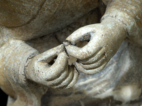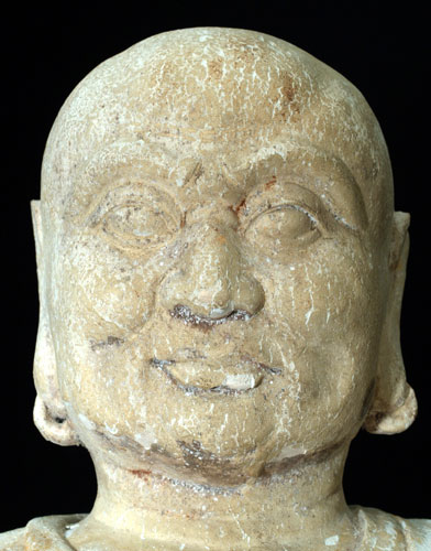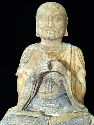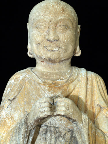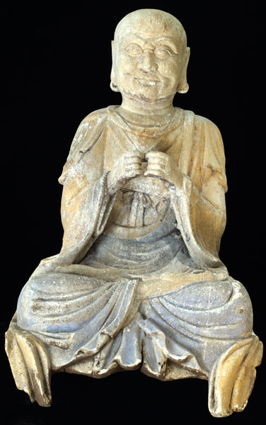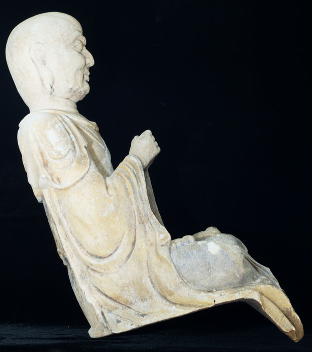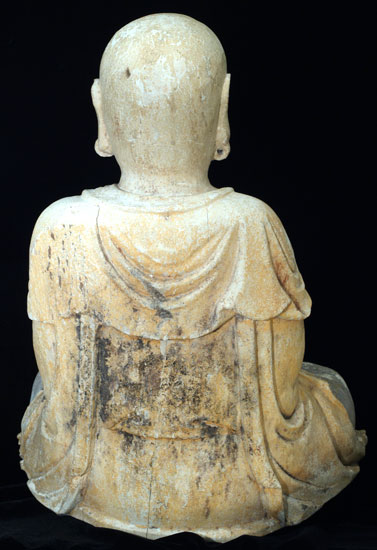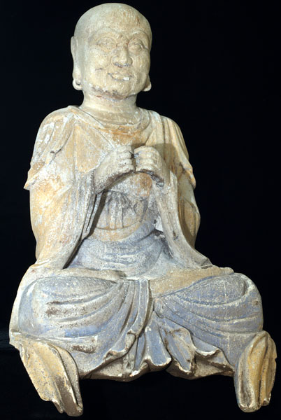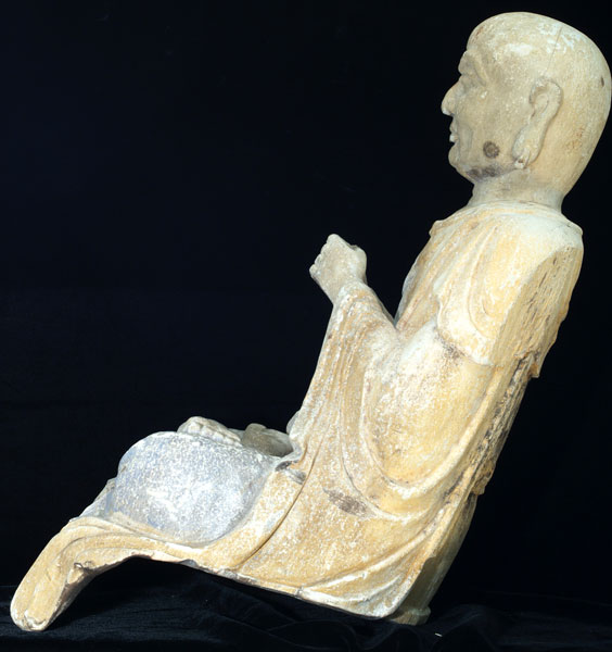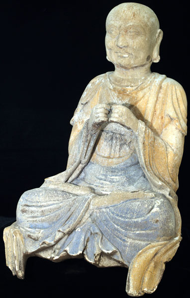 Fabulous and large Chinese Monk from a high end, old east coast collection which goes back several generations. Pieces of this quality and condition (authentic ones) have not been available in China for sale for affordable prices for a very long time. The vast majority of those for sale on Ebay and from most non-high end sources tend to be modern copies or to be re-worked in some way. This one is authentic and untouched. The sculpting is extremely fine- he is sculpted from one piece of wood. A good amount of the original polychrome remains. There is wear and minor loss as expected from over 200 years of existence, but no significant damage or repairs or re-working of the patina. This is an A+ example of its type. The front of the robe is made to hang over a ledge- this gives him an even more spectacular look. He sits 17 inches up from where he sits plus 3 inches down over the edge with his robes for a total of 20 inches. He is 13 inches wide by 10 inches deep. Wonderful!!!.