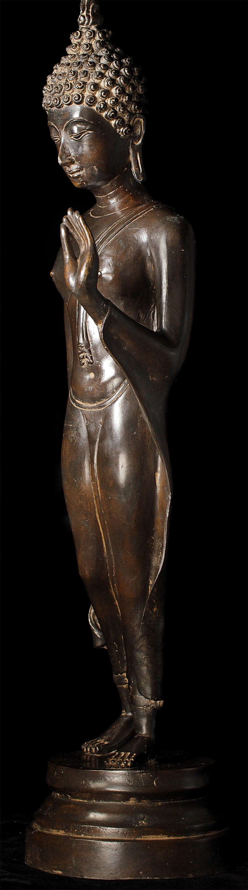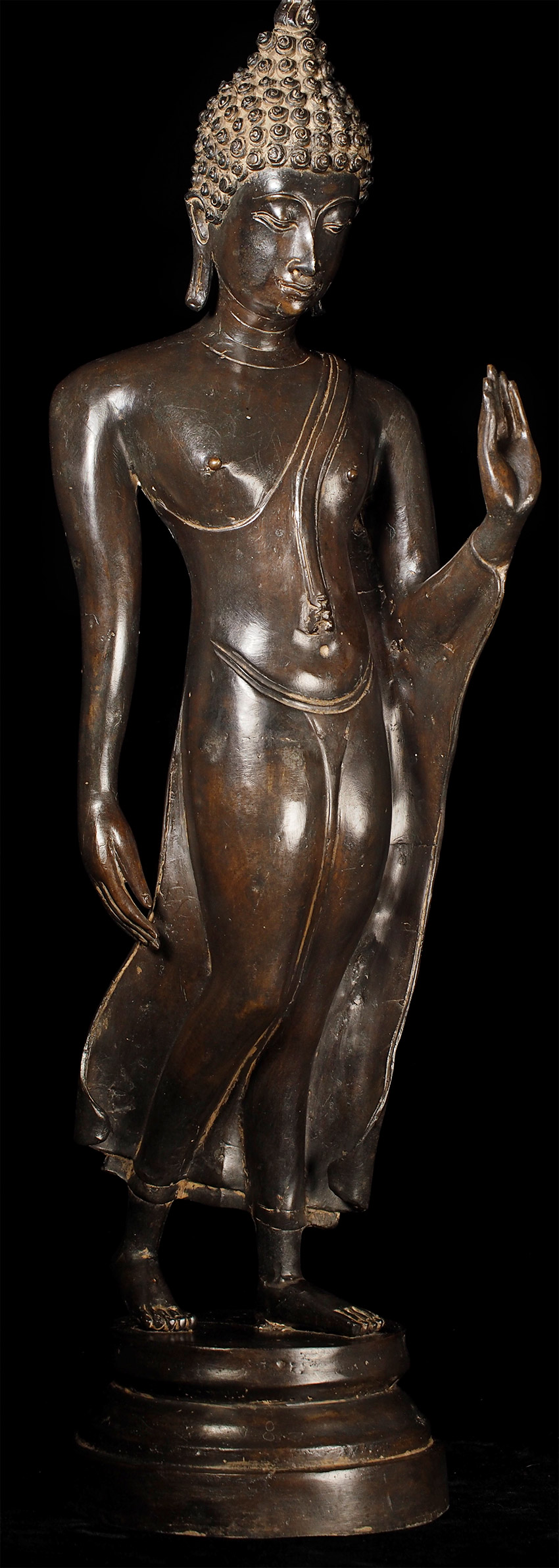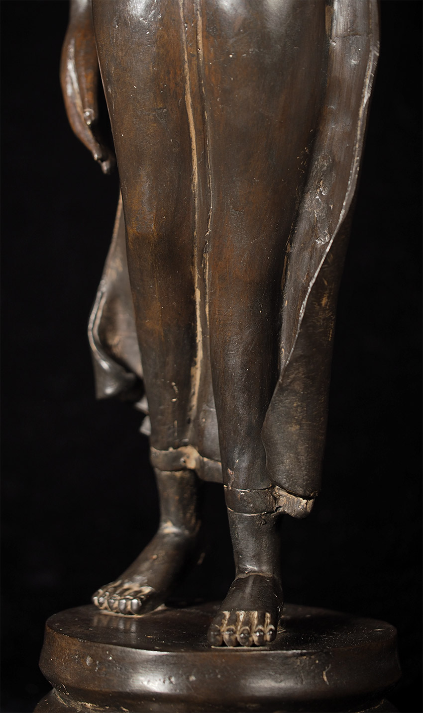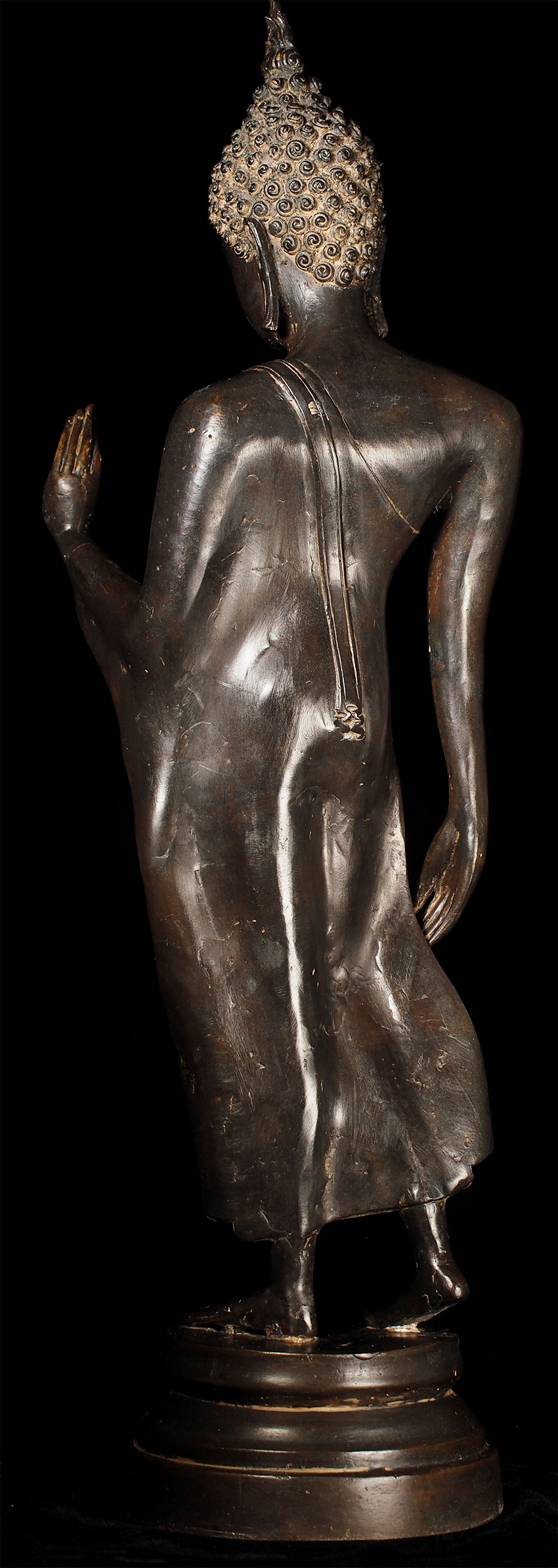 Superb late 19thC Thai Bronze Walking Buddha. Large at 23 7/8" tall including integral base. This is almost certainly a revival piece brought about by Rama V (the King and I King) in the end of the 19th century. He loved this form and brought hundreds of large 14/15thC Sukhothai statues from the ancient capital city of Sukhothai to Bangkok, and commissioned and encouraged the making of large numbers of this type to honor the Sukhothai period and its greatest artistic achievement- this form of The Walking Buddha. This is a particularly large and fine example that was cast and finished with great care. It is finer than 99% of its type (search the web and you will see), and took great skill and significant time and care to create. This type is sometimes sold for high amounts of money (2 to 4 times what I am selling it for), and is even sometimes sold as period (14/15thC). The reality is that VERY few period pieces of this size were made, and if it were a period piece in this size and quality it could sell at a high end auction house for $30,00 or much more. This piece is less than 1/10th that price- and nearly as beautiful-and hard to distinguish across a room. From a US estate, collected by the previous owner in the 1960's. There are some small white spots on the surface-not sure what they are from or if they can be removed- they could be easily covered-I am leaving the piece as found.