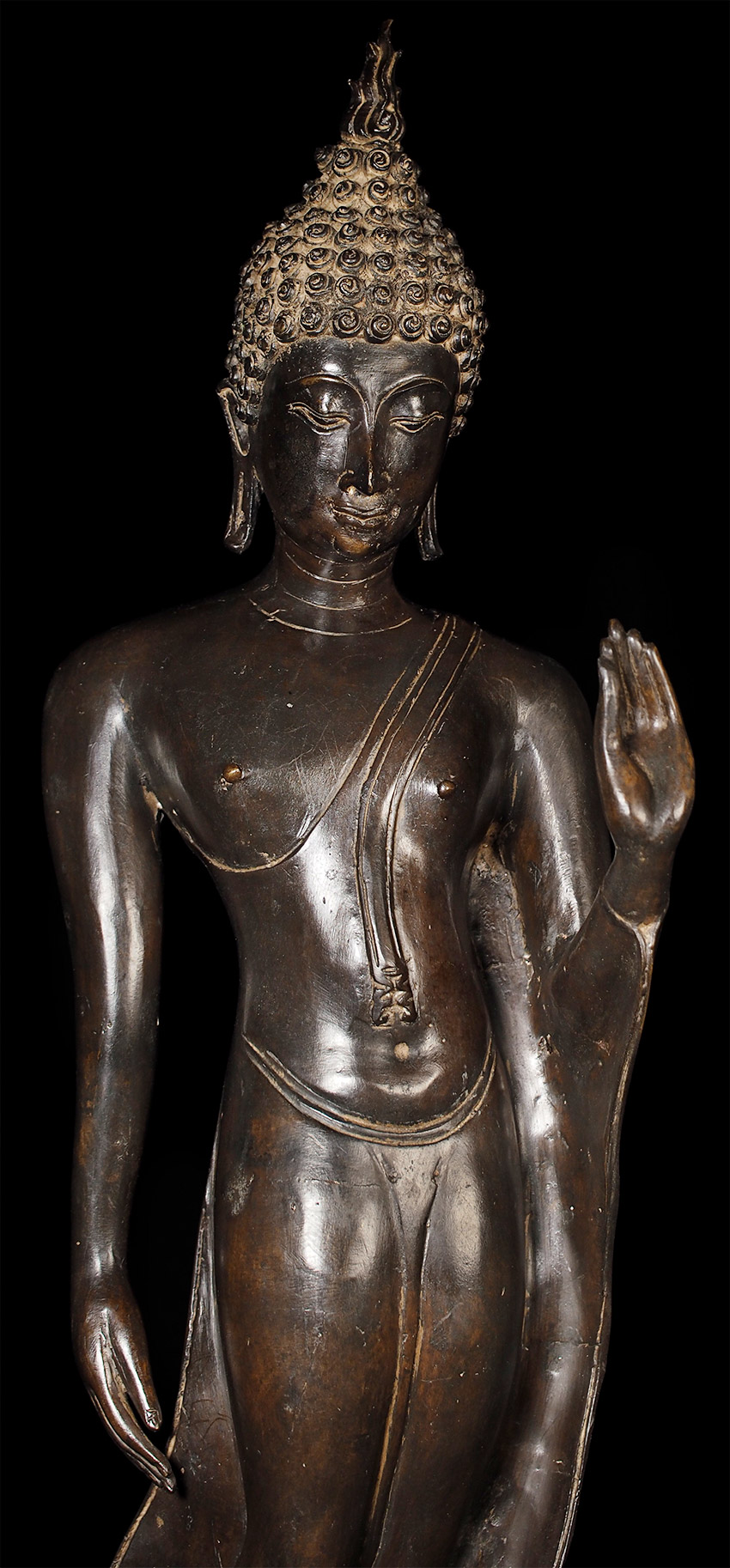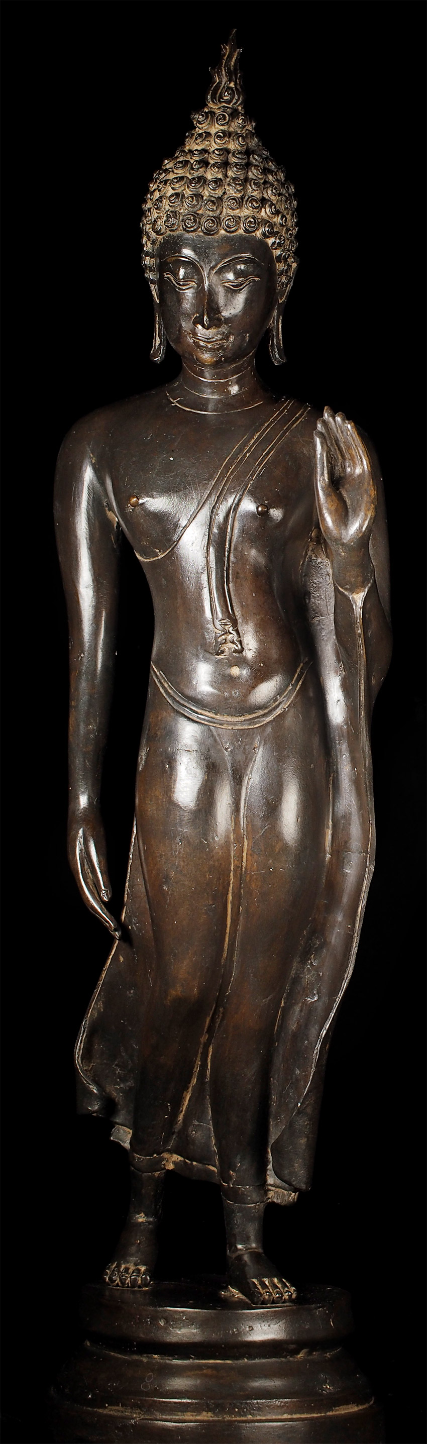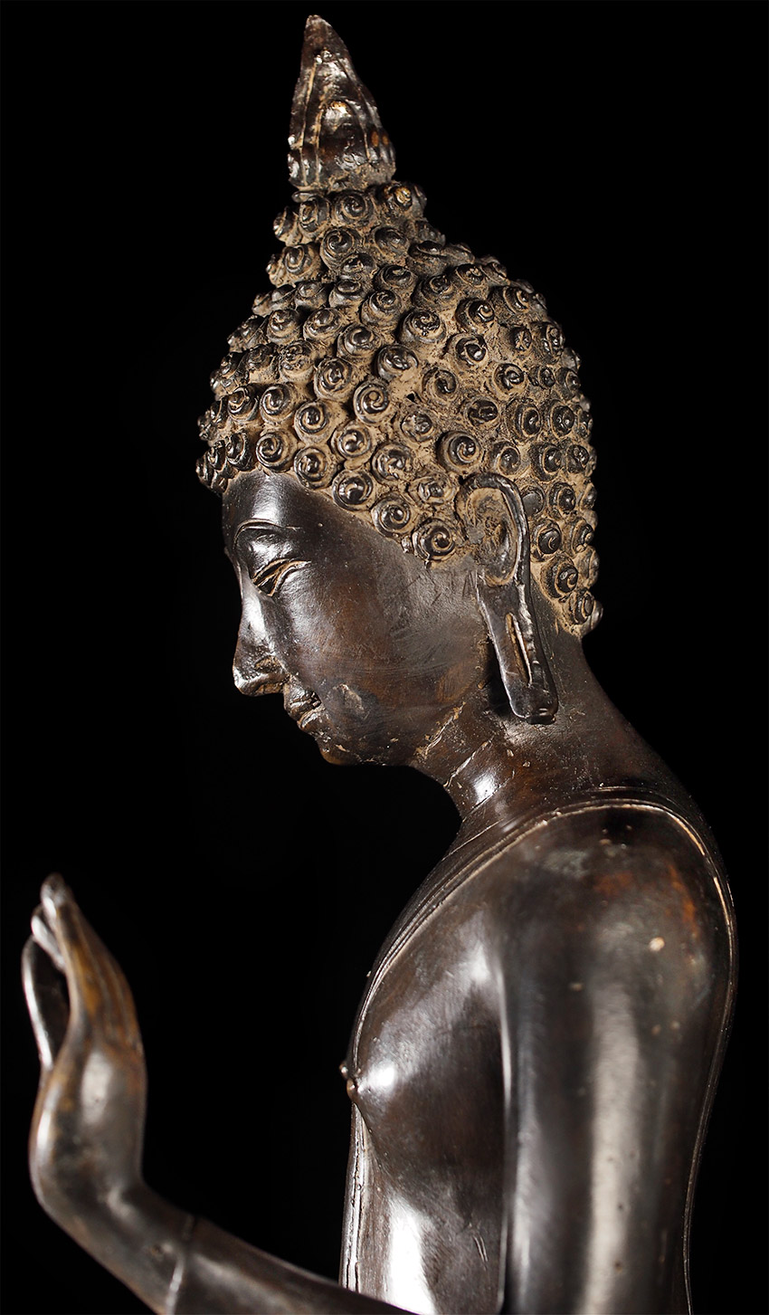 Superb late 19thC Thai Bronze Walking Buddha. Large at 23 7/8" tall including integral base. This is almost certainly a revival piece brought about by Rama V (the King and I King) in the end of the 19th century. He loved this form and brought hundreds of large 14/15thC Sukhothai statues from the ancient capital city of Sukhothai to Bangkok, and commissioned and encouraged the making of large numbers of this type to honor the Sukhothai period and its greatest artistic achievement- this form of The Walking Buddha. This is a particularly large and fine example that was cast and finished with great care. It is finer than 99% of its type (search the web and you will see), and took great skill and significant time and care to create. This type is sometimes sold for high amounts of money (2 to 4 times what I am selling it for), and is even sometimes sold as period (14/15thC). The reality is that VERY few period pieces of this size were made, and if it were a period piece in this size and quality it could sell at a high end auction house for $30,00 or much more. This piece is less than 1/10th that price- and nearly as beautiful-and hard to distinguish across a room. From a US estate, collected by the previous owner in the 1960's. There are some small white spots on the surface-not sure what they are from or if they can be removed- they could be easily covered-I am leaving the piece as found.
