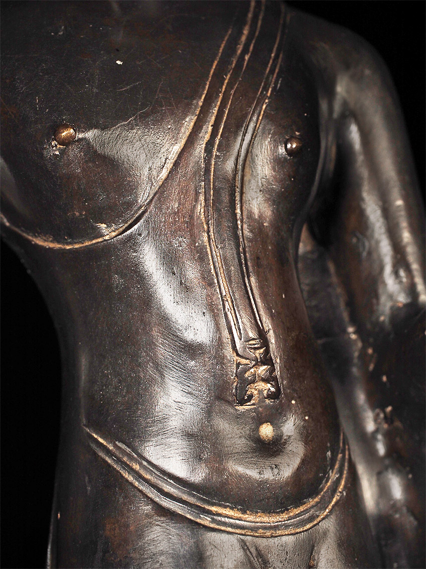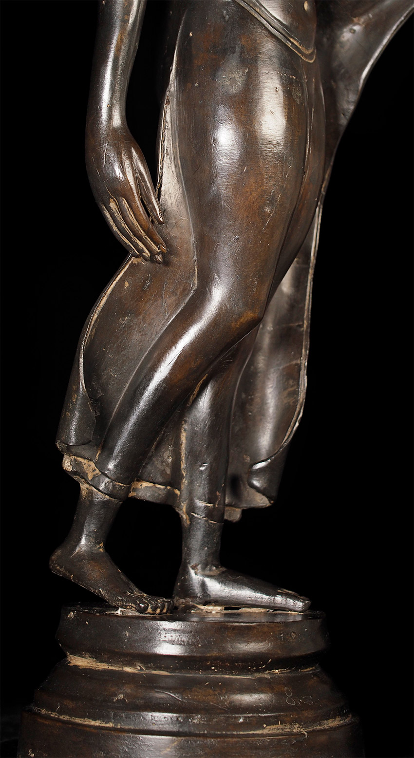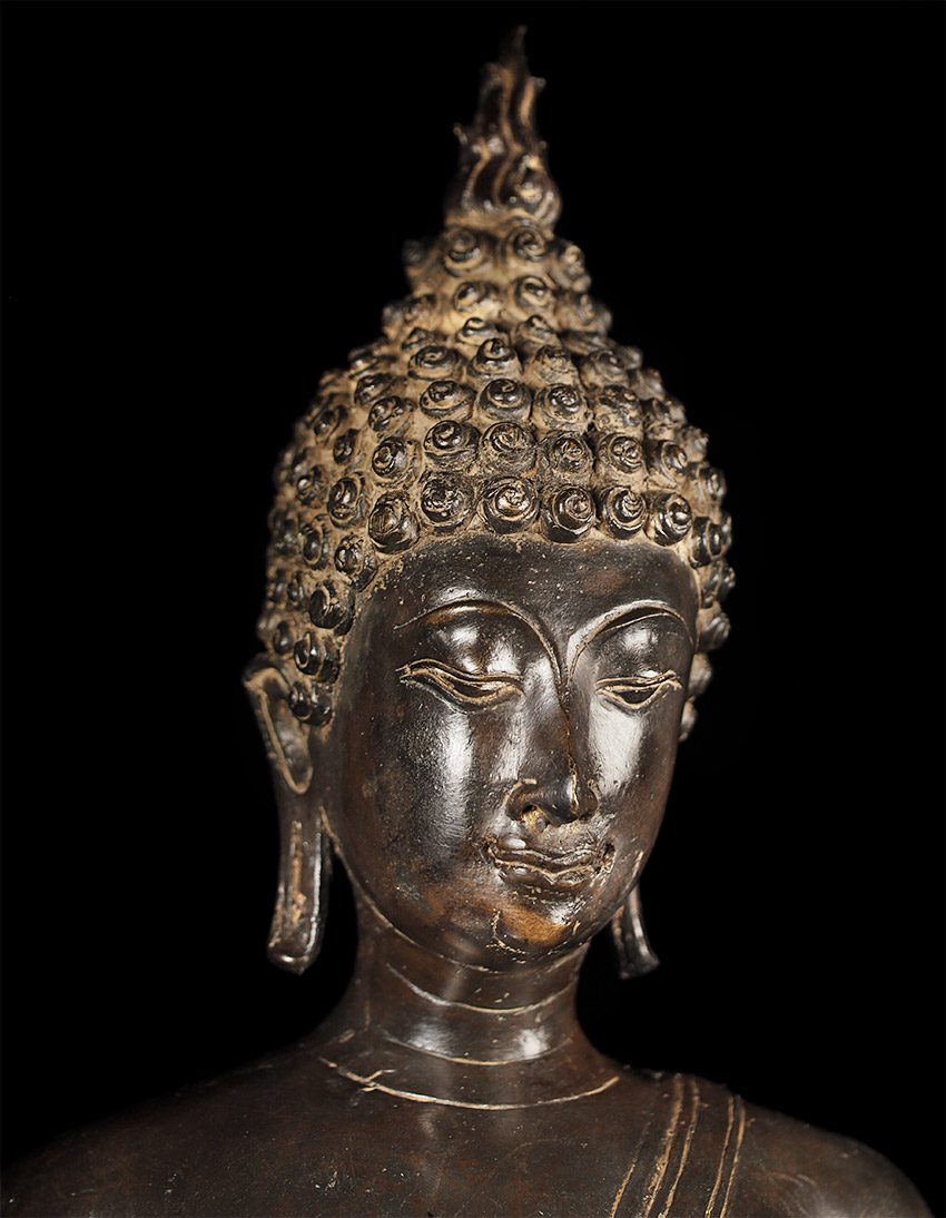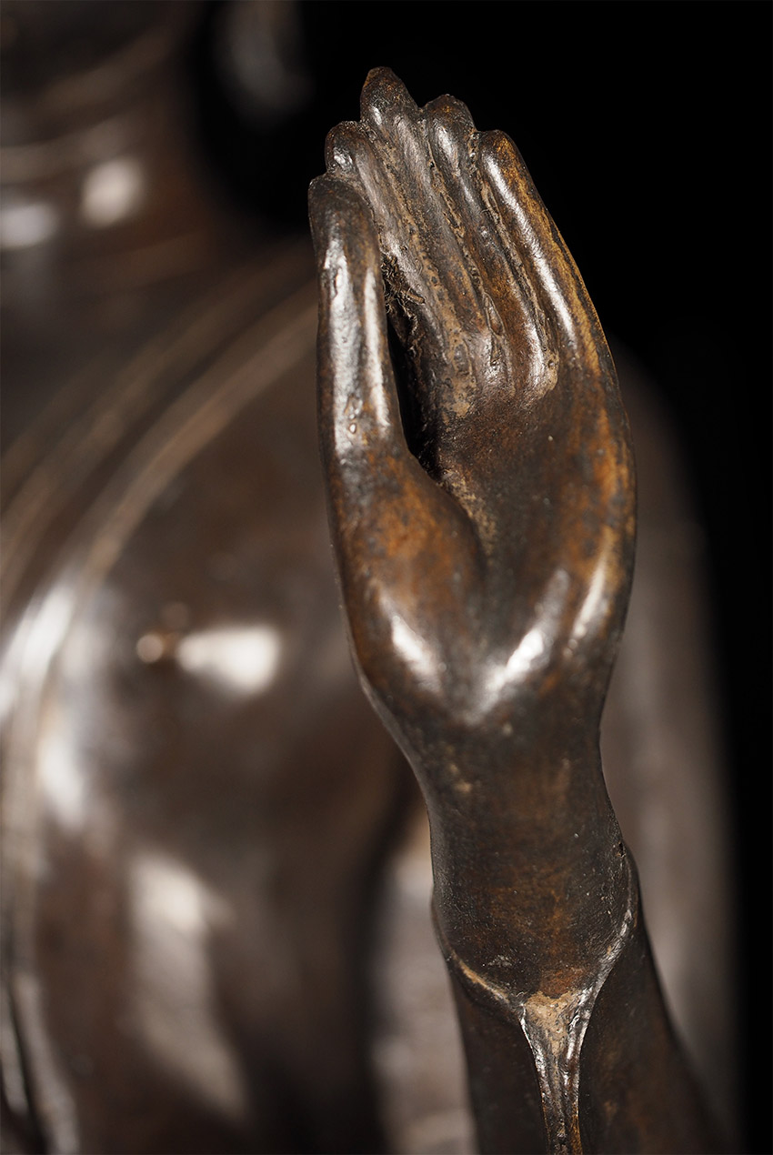Superb late 19thC Thai Bronze Walking Buddha. Large at 23 7/8" tall including integral base. This is almost certainly a revival piece brought about by Rama V (the King and I King) in the end of the 19th century. He loved this form and brought hundreds of large 14/15thC Sukhothai statues from the ancient capital city of Sukhothai to Bangkok, and commissioned and encouraged the making of large numbers of this type to honor the Sukhothai period and its greatest artistic achievement- this form of The Walking Buddha. This is a particularly large and fine example that was cast and finished with great care. It is finer than 99% of its type (search the web and you will see), and took great skill and significant time and care to create. This type is sometimes sold for high amounts of money (2 to 4 times what I am selling it for), and is even sometimes sold as period (14/15thC). The reality is that VERY few period pieces of this size were made, and if it were a period piece in this size and quality it could sell at a high end auction house for $30,00 or much more. This piece is less than 1/10th that price- and nearly as beautiful-and hard to distinguish across a room. From a US estate, collected by the previous owner in the 1960's. There are some small white spots on the surface-not sure what they are from or if they can be removed- they could be easily covered-I am leaving the piece as found.