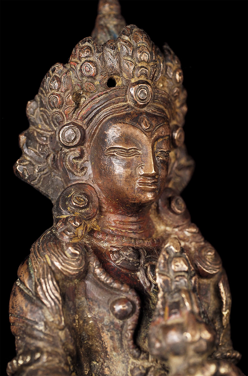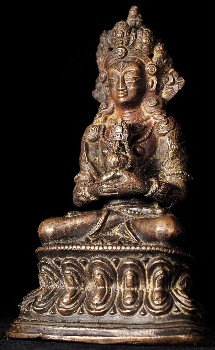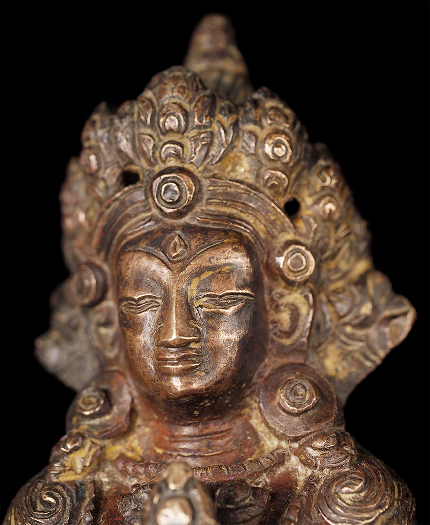 18/19thC West Tibet Bronze Buddha- Great classic face, well cast. Remains of gilding. From a high end New York City collection. Radiates equanimity, and has the feel that truly successful classic pieces manage to convey. This piece measures 5.5" tall. Domestic shipping is included, and international shipping is $50, including packing and insurance to anywhere in the world.
