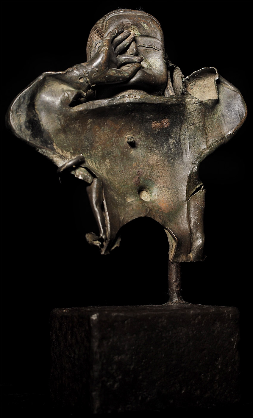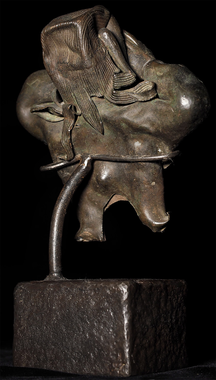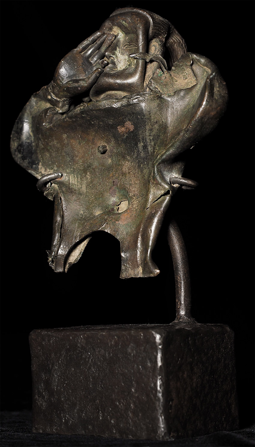 On his custom metal stand (crafted by a metal sculptor specifically for him), this very unique figure stands 10.5" high (figure alone is close to 7 inches). The base measures 2.5" tall x 4" x 3". He is a unique figure that has been shaped by an unusual history. When the Russians marched occupied Mongolia in the late 1920's and destroyed over 2000 temples in a day, he was flattened, burned, and finally buried under rubble. (I have no proof of this. I did purchase him in the 1980's from a Mongolian farmer who found him with a metal detector. I do not know what his original shape and purpose was, but He has no hands or feet. He was likely shot in the stomach You can see evidence if you look in the middle of his belly- you can see the distinctive deep classic bullet indentation in his stomach that almost looks like a belly button. Likely done during the initial Russian takeover in the late 1920's. On his custom stand he almost lookalike he is smoking- (a habit he only picked up recently). He has real charisma.
