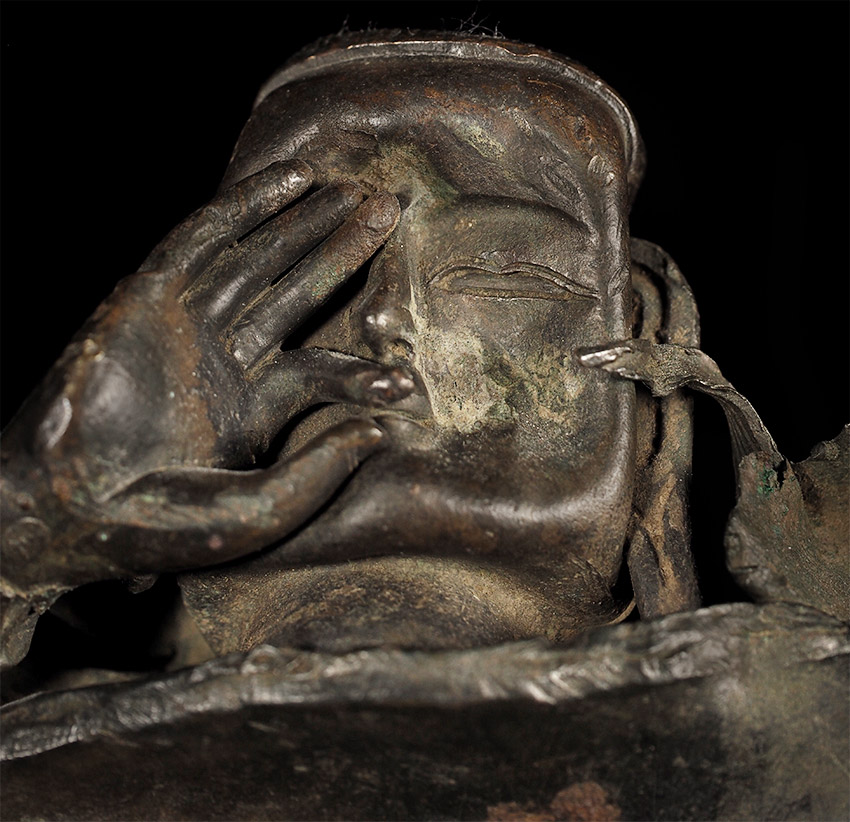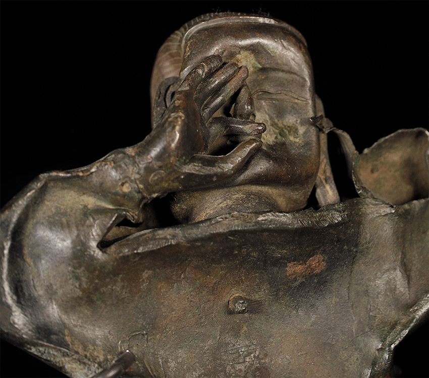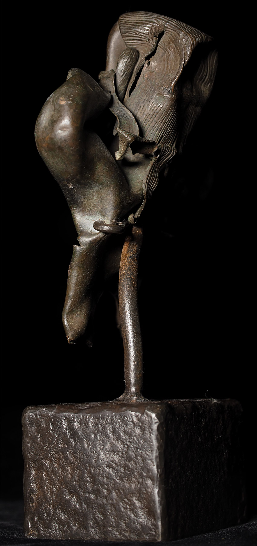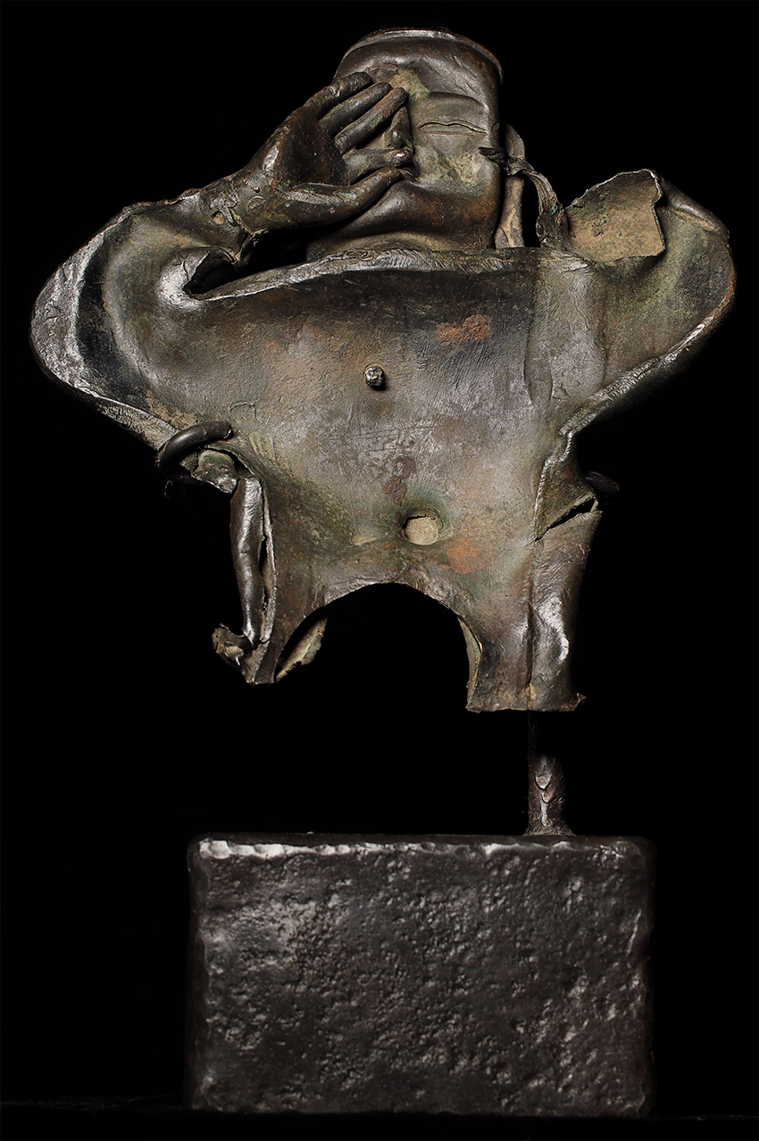 On his custom metal stand (crafted by a metal sculptor specifically for him), this very unique figure stands 10.5" high (figure alone is close to 7 inches). The base measures 2.5" tall x 4" x 3". He is a unique figure that has been shaped by an unusual history. When the Russians marched occupied Mongolia in the late 1920's and destroyed over 2000 temples in a day, he was flattened, burned, and finally buried under rubble. (I have no proof of this. I did purchase him in the 1980's from a Mongolian farmer who found him with a metal detector. I do not know what his original shape and purpose was, but He has no hands or feet. He was likely shot in the stomach You can see evidence if you look in the middle of his belly- you can see the distinctive deep classic bullet indentation in his stomach that almost looks like a belly button. Likely done during the initial Russian takeover in the late 1920's. On his custom stand he almost lookalike he is smoking- (a habit he only picked up recently). He has real charisma.