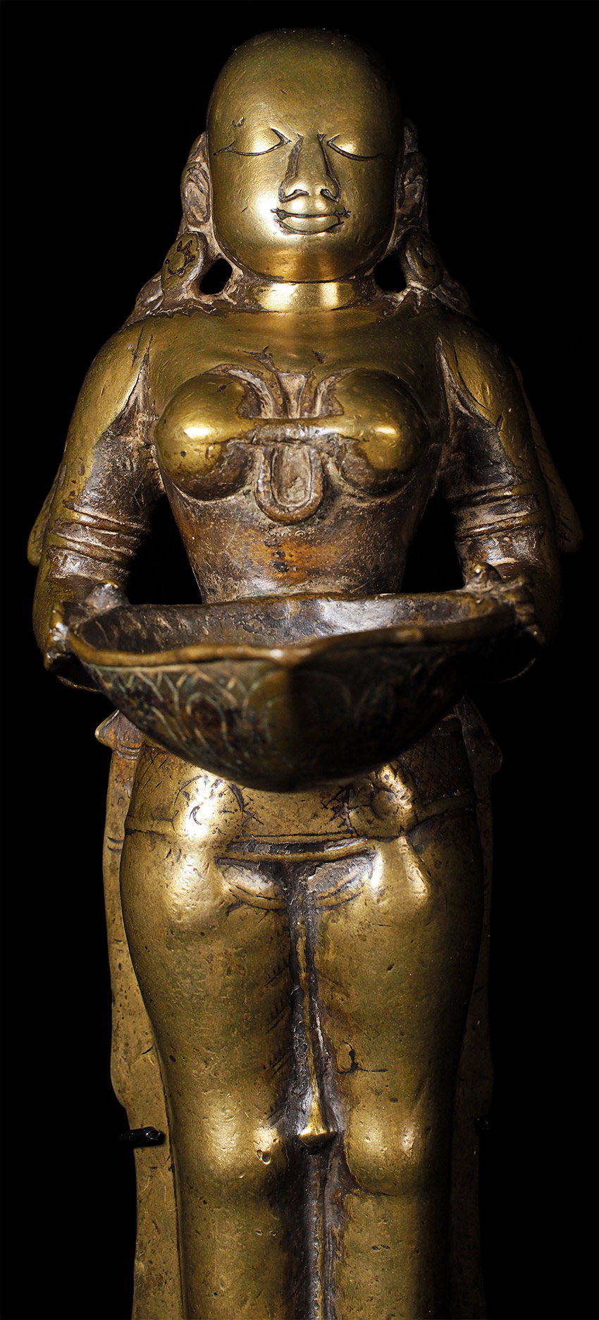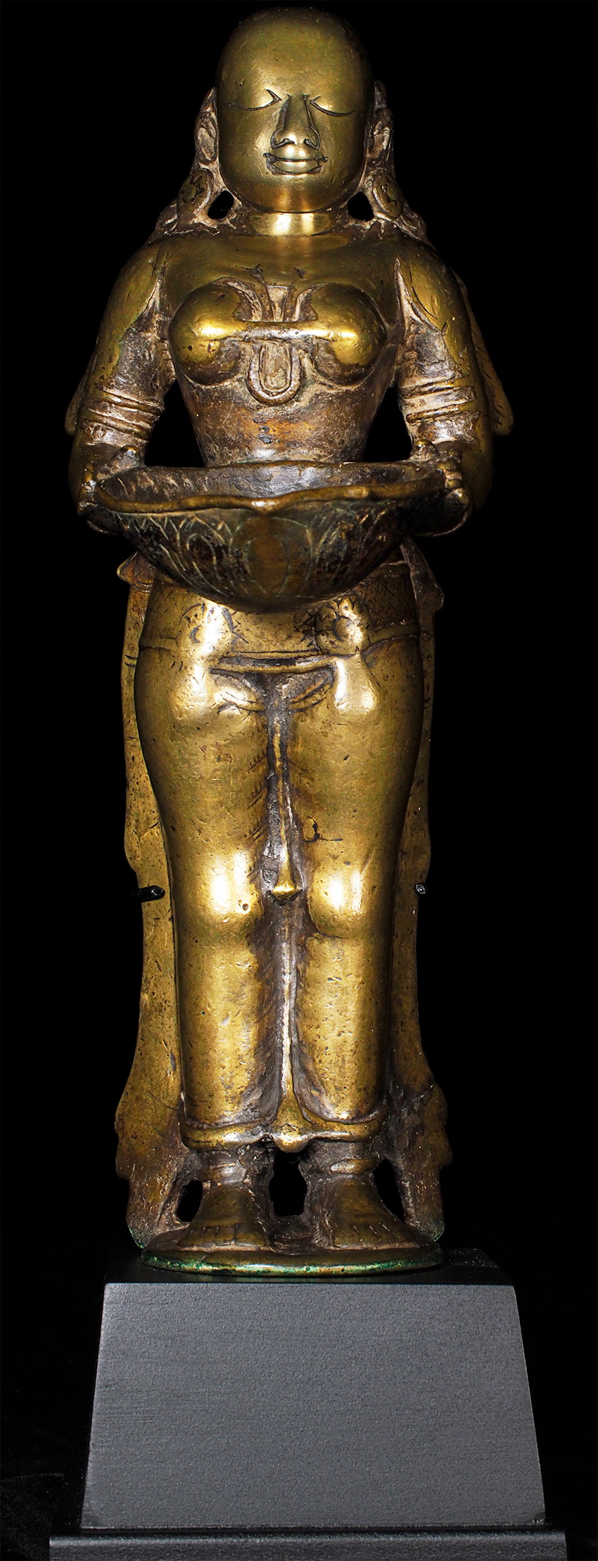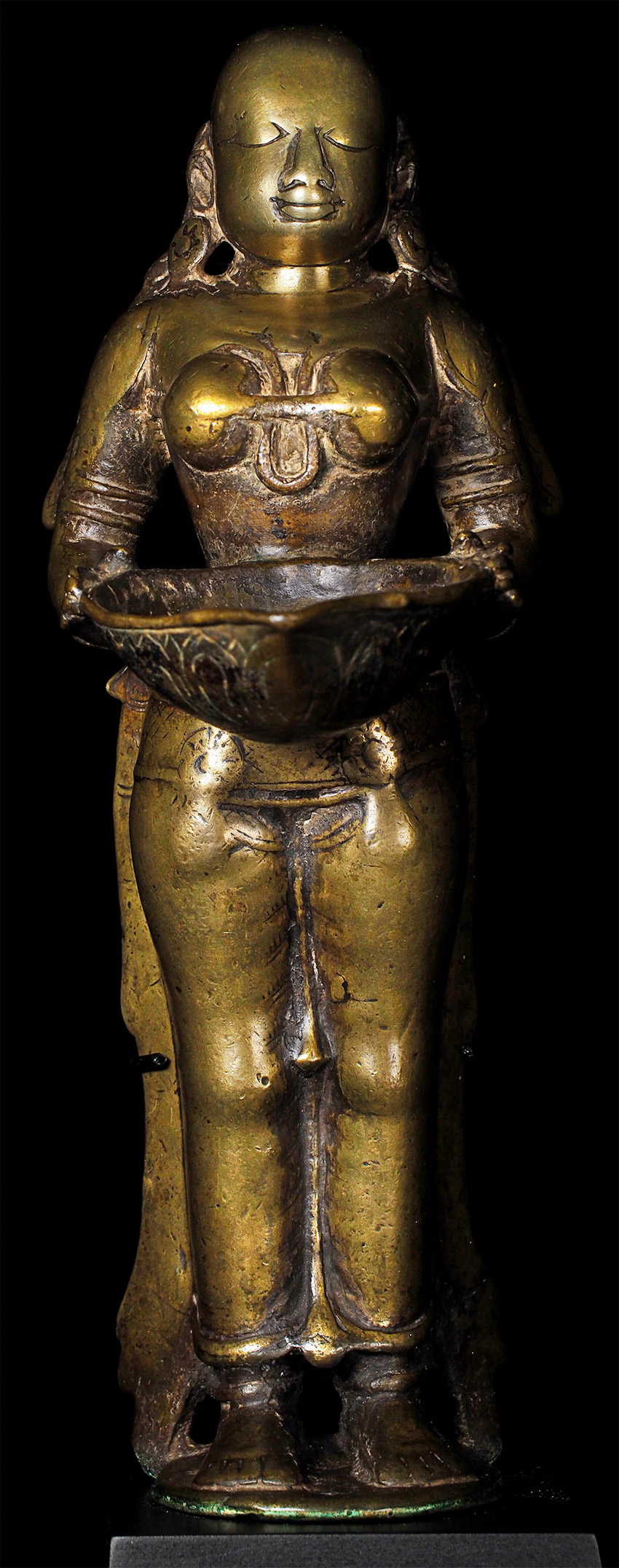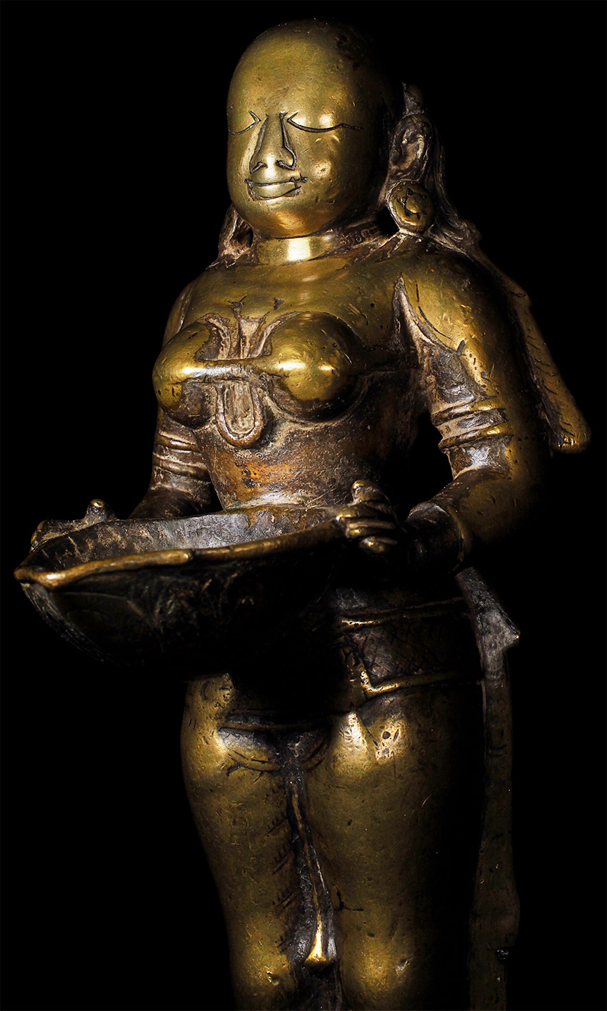 Superb 17th/18th Century Hindu figural oil lamp, with a sublime face. Stands 11 3/5 inches tall, custom base adds almost another 2 3/4 inches in height. Cast from a very high quality alloy, possibly containing precious metal. This is the best of this type I have ever seen in the 25+ years I have been collecting and selling Asian sculpture by far. The wear has greatly increased her charisma and amplified her spiritual energy. The piece is incredibly heavy for her size. An all time favorite that has been with me for 20+ years. It was the signature piece from the collection it came from- a lifetime collection this type of figural oil lamp. I purchased about a dozen of the best examples in the collection (of which this was the best) when the Southern California owner was selling the collection in the 1990's before retiring to Mexico.SPECIAL!!!!!