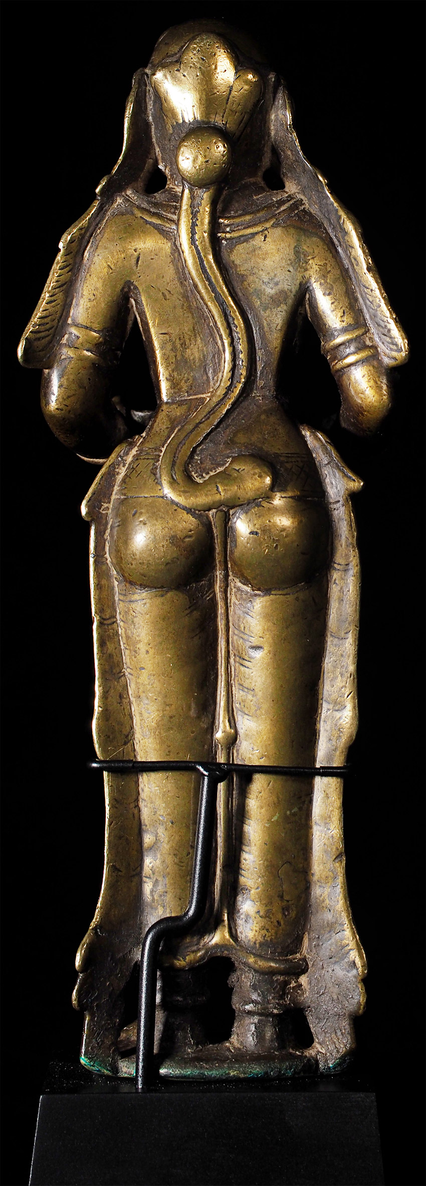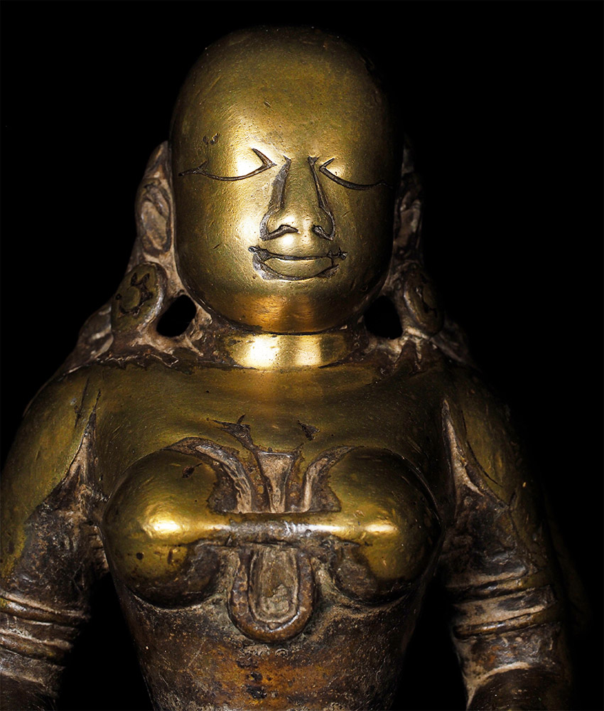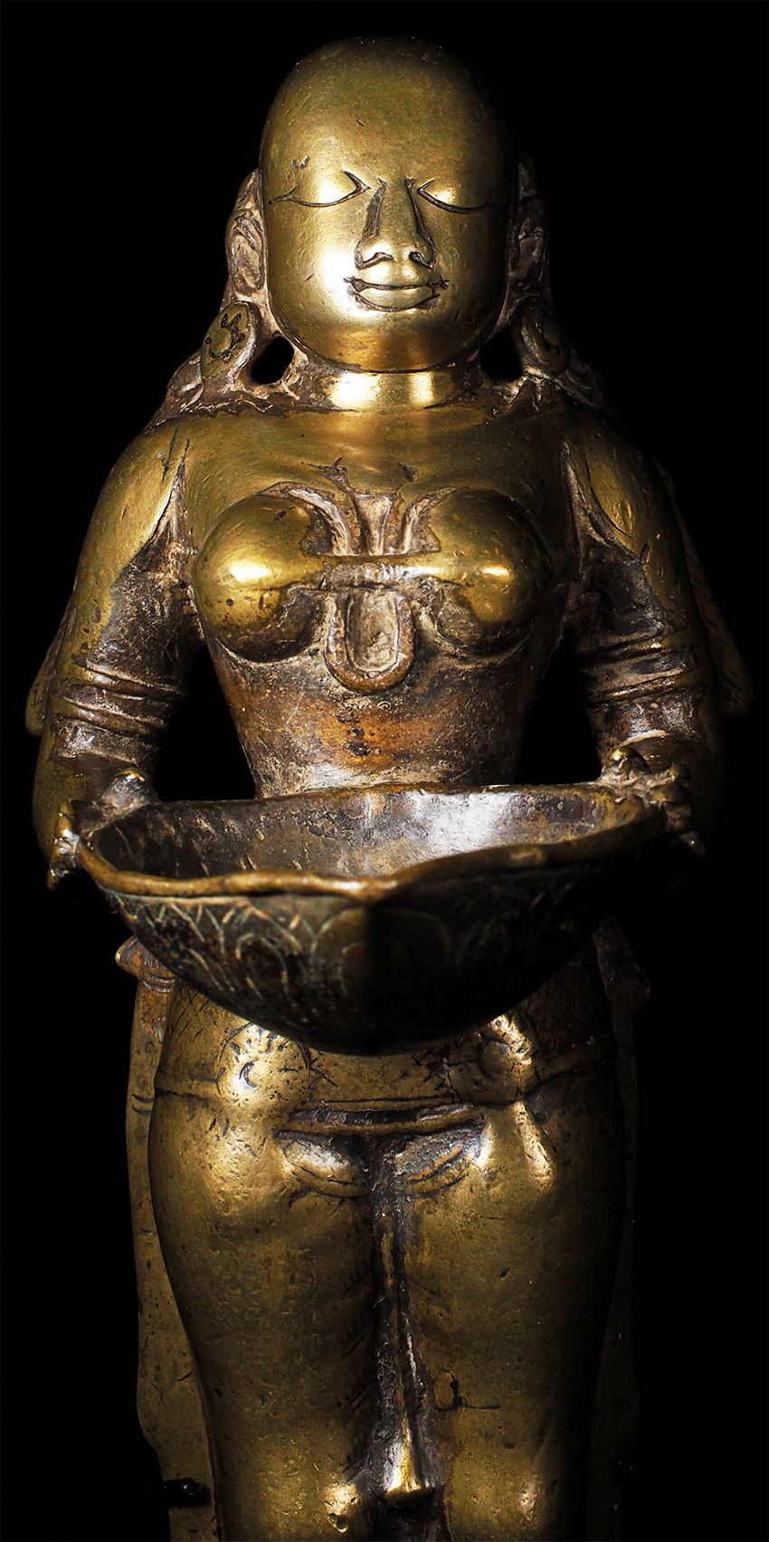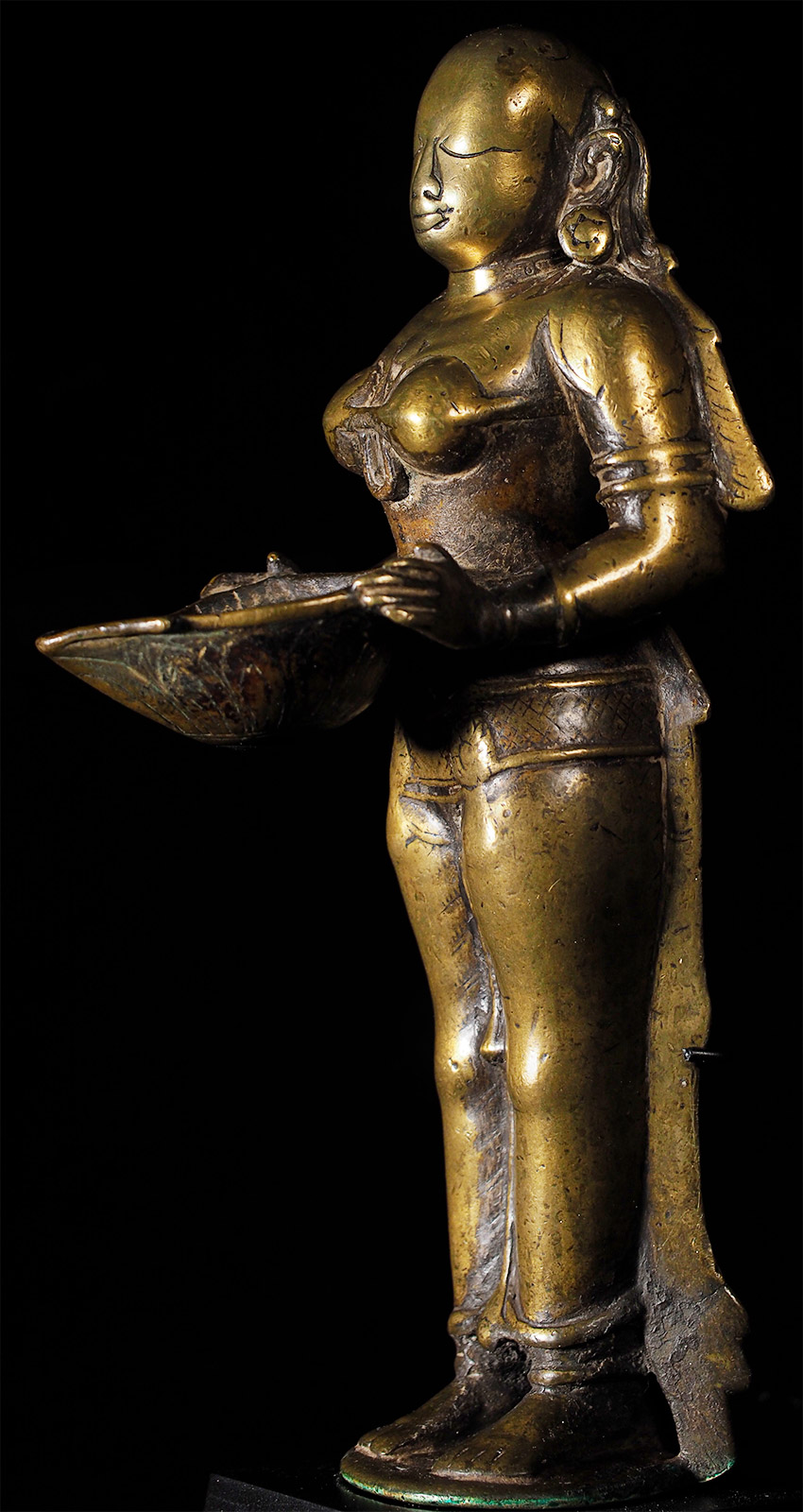 Superb 17th/18th Century Hindu figural oil lamp, with a sublime face. Stands 11 3/5 inches tall, custom base adds almost another 2 3/4 inches in height. Cast from a very high quality alloy, possibly containing precious metal. This is the best of this type I have ever seen in the 25+ years I have been collecting and selling Asian sculpture by far. The wear has greatly increased her charisma and amplified her spiritual energy. The piece is incredibly heavy for her size. An all time favorite that has been with me for 20+ years. It was the signature piece from the collection it came from- a lifetime collection this type of figural oil lamp. I purchased about a dozen of the best examples in the collection (of which this was the best) when the Southern California owner was selling the collection in the 1990's before retiring to Mexico.SPECIAL!!!!!