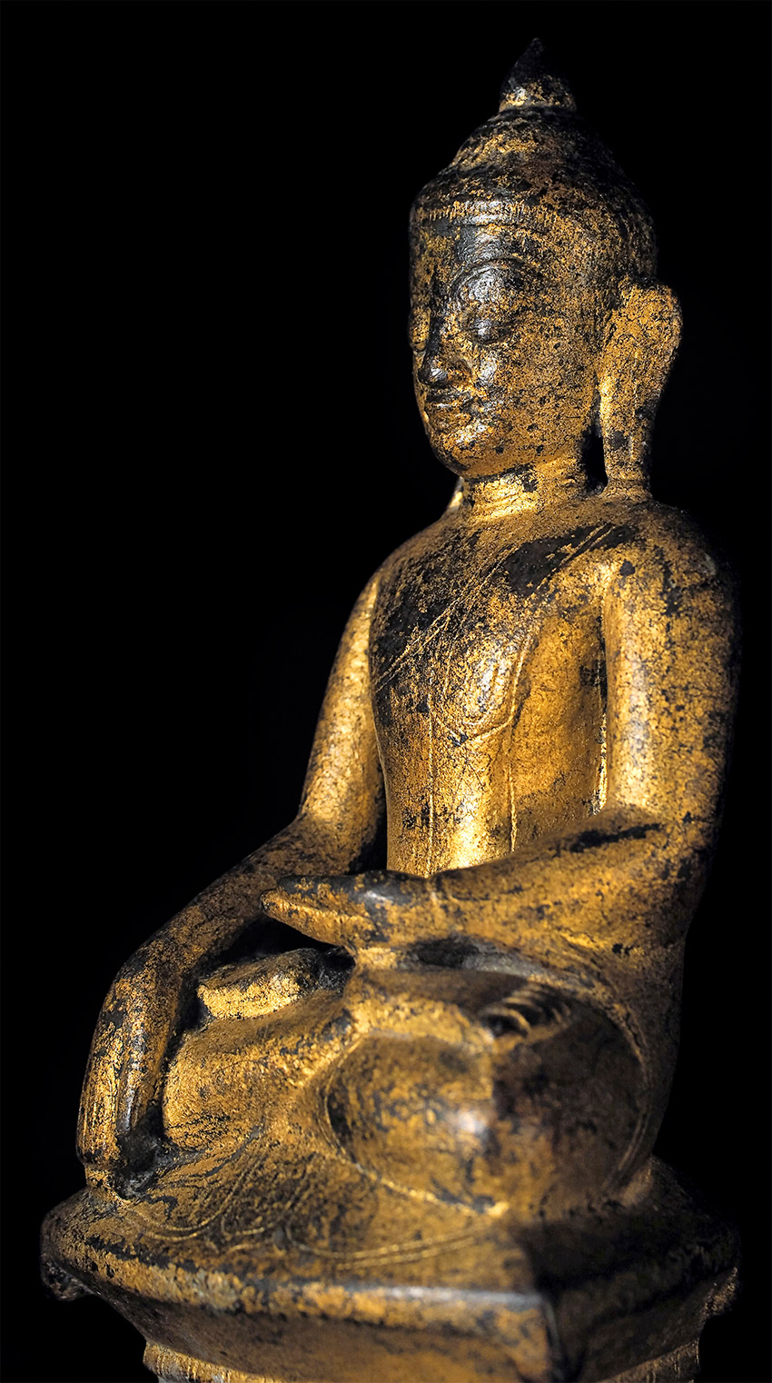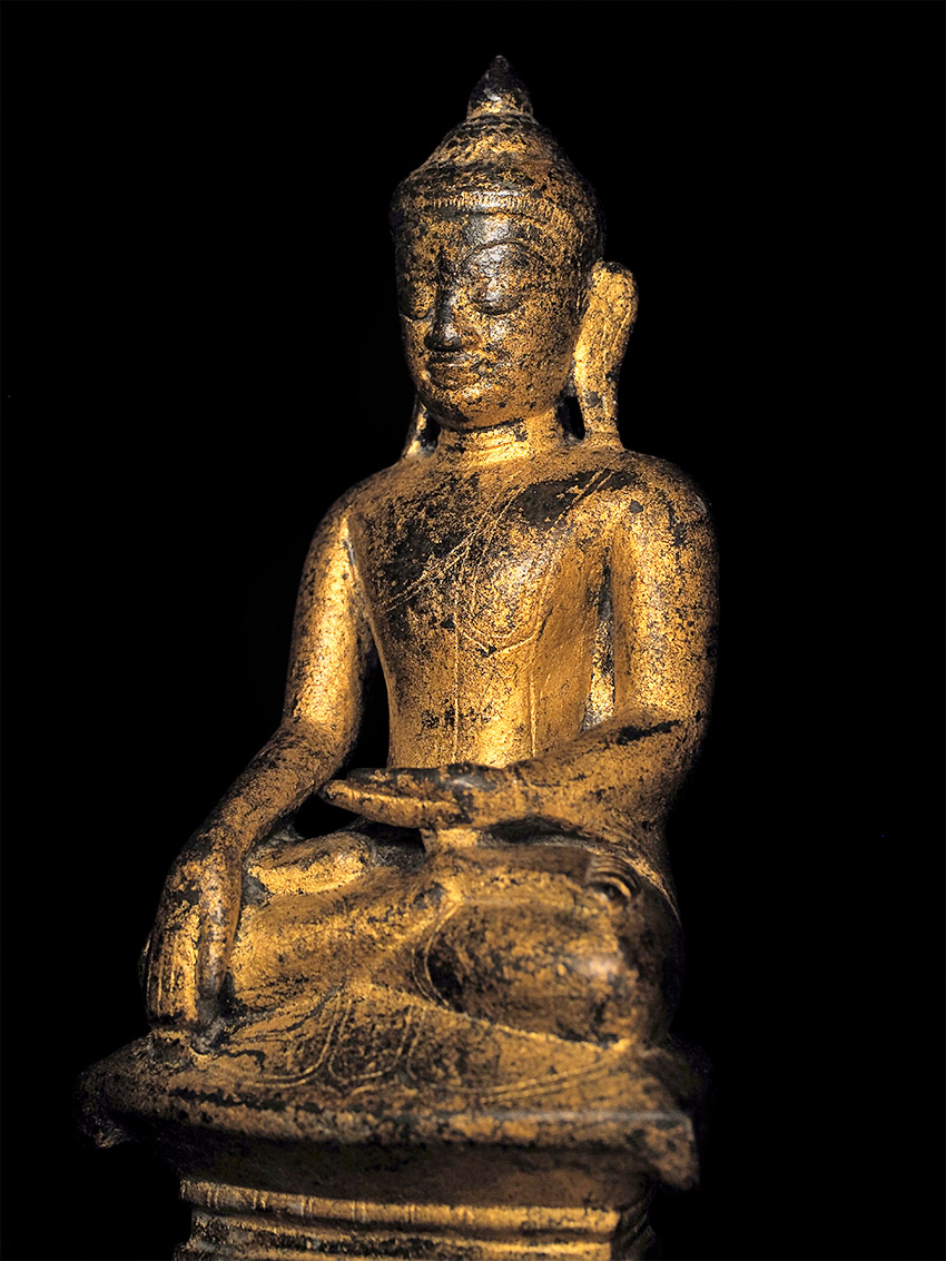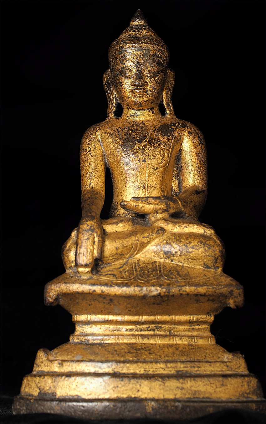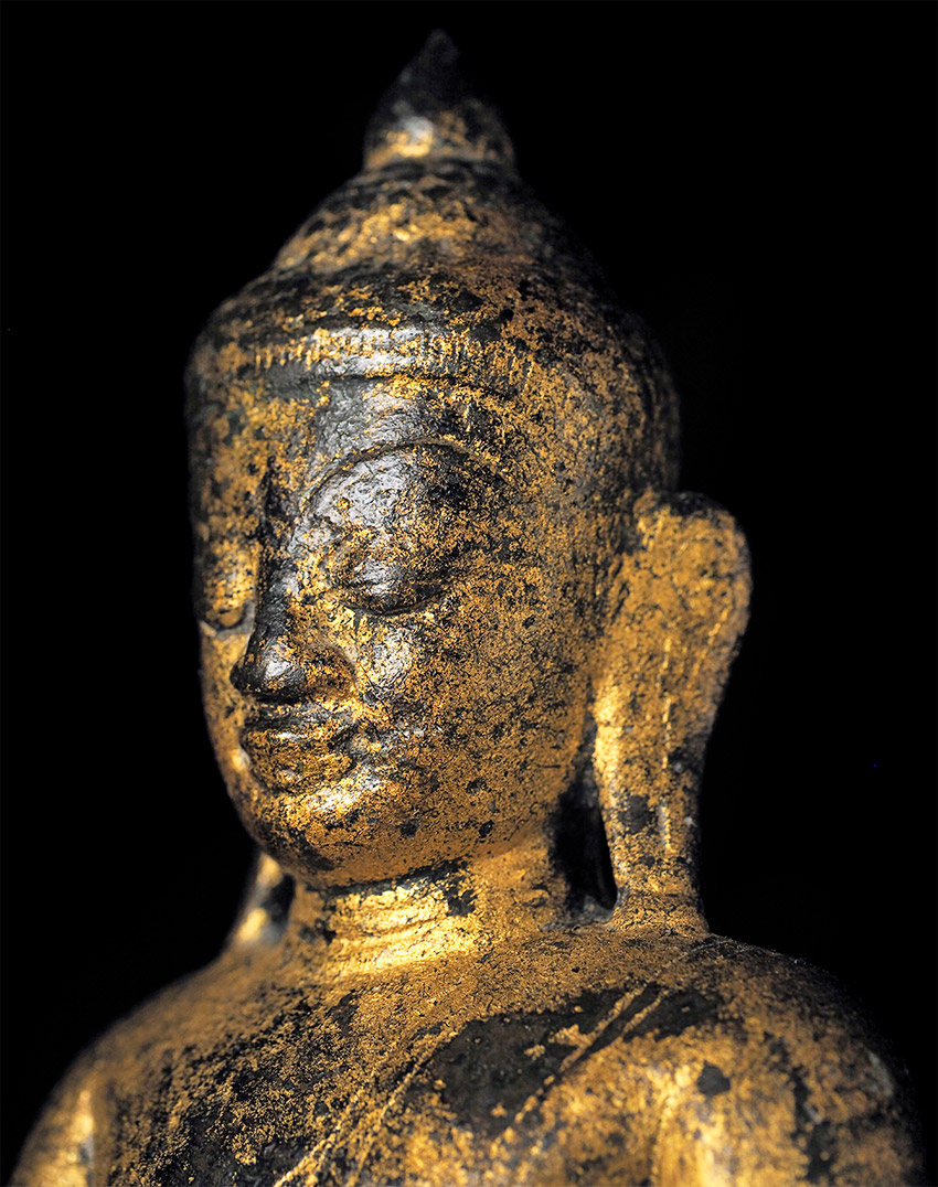 Very fine 16thC Late Ava/early Shan Buddha. This type is much rarer and completely different than the 18/19thC shan style, which is far more common (and typically not as expensive if it can be found in comparable quality). This one was bought by the previous owner while living in Thailand, approx. 35 years ago in a high end antique shop in Bangkok that is still in business, for approx $3,000. My price is less than 2/3 that amount, and if it does not sell I will move it to my personal collection. Very hard to photograph due to the complex surface, but it is one of the nicest of its type I have seen. Sits 7.5 inches tall.