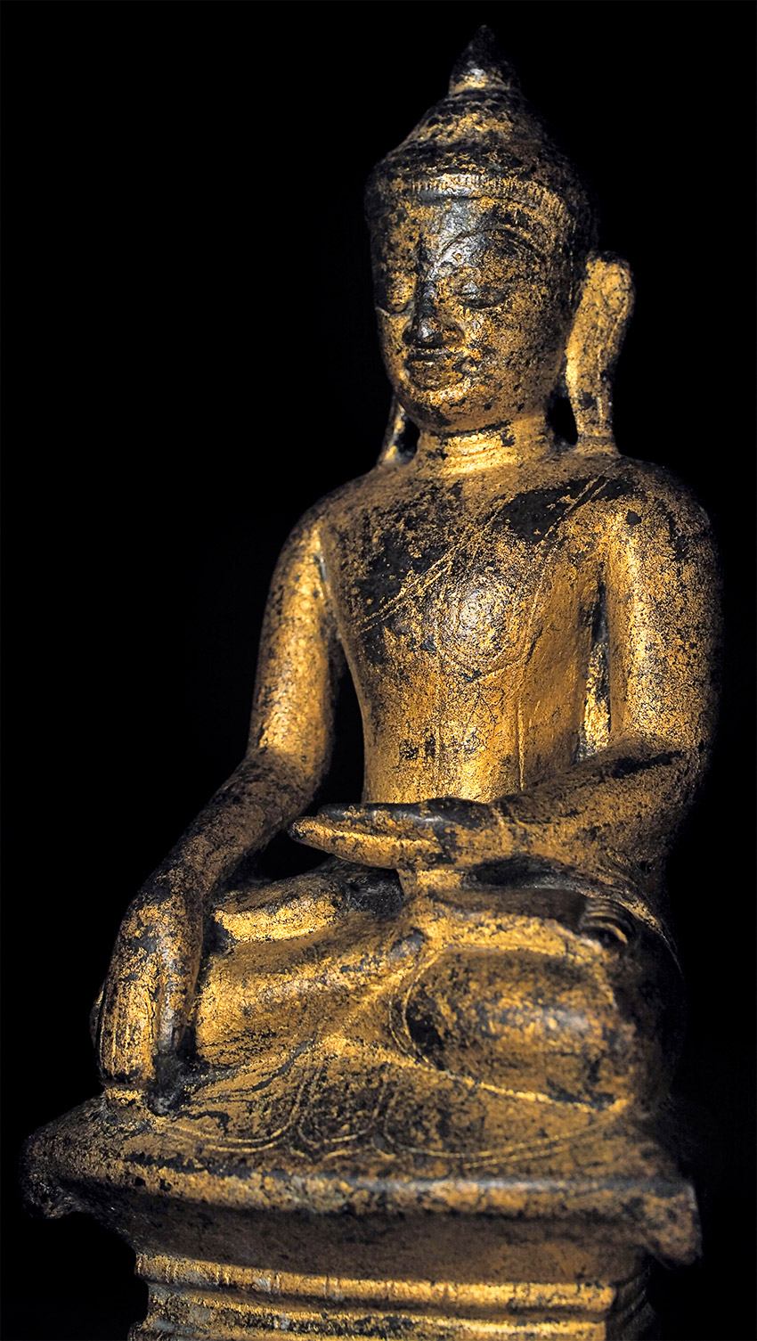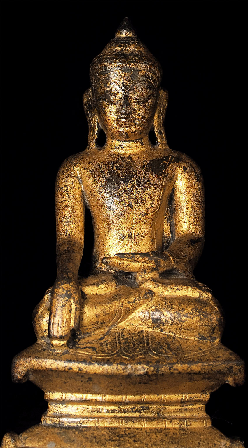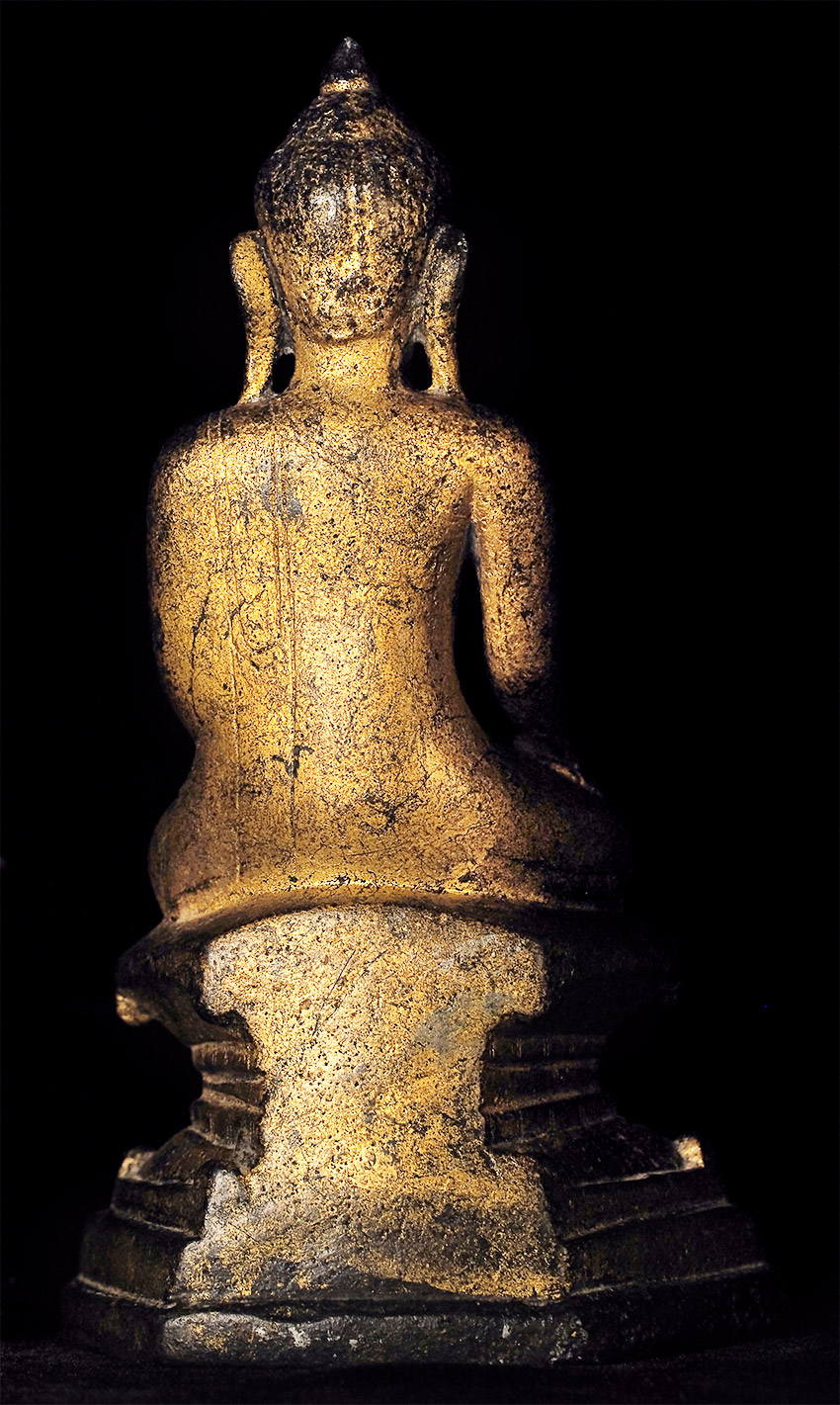 Very fine 16thC Late Ava/early Shan Buddha. This type is much rarer and completely different than the 18/19thC shan style, which is far more common (and typically not as expensive if it can be found in comparable quality). This one was bought by the previous owner while living in Thailand, approx. 35 years ago in a high end antique shop in Bangkok that is still in business, for approx $3,000. My price is less than 2/3 that amount, and if it does not sell I will move it to my personal collection. Very hard to photograph due to the complex surface, but it is one of the nicest of its type I have seen. Sits 7.5 inches tall.